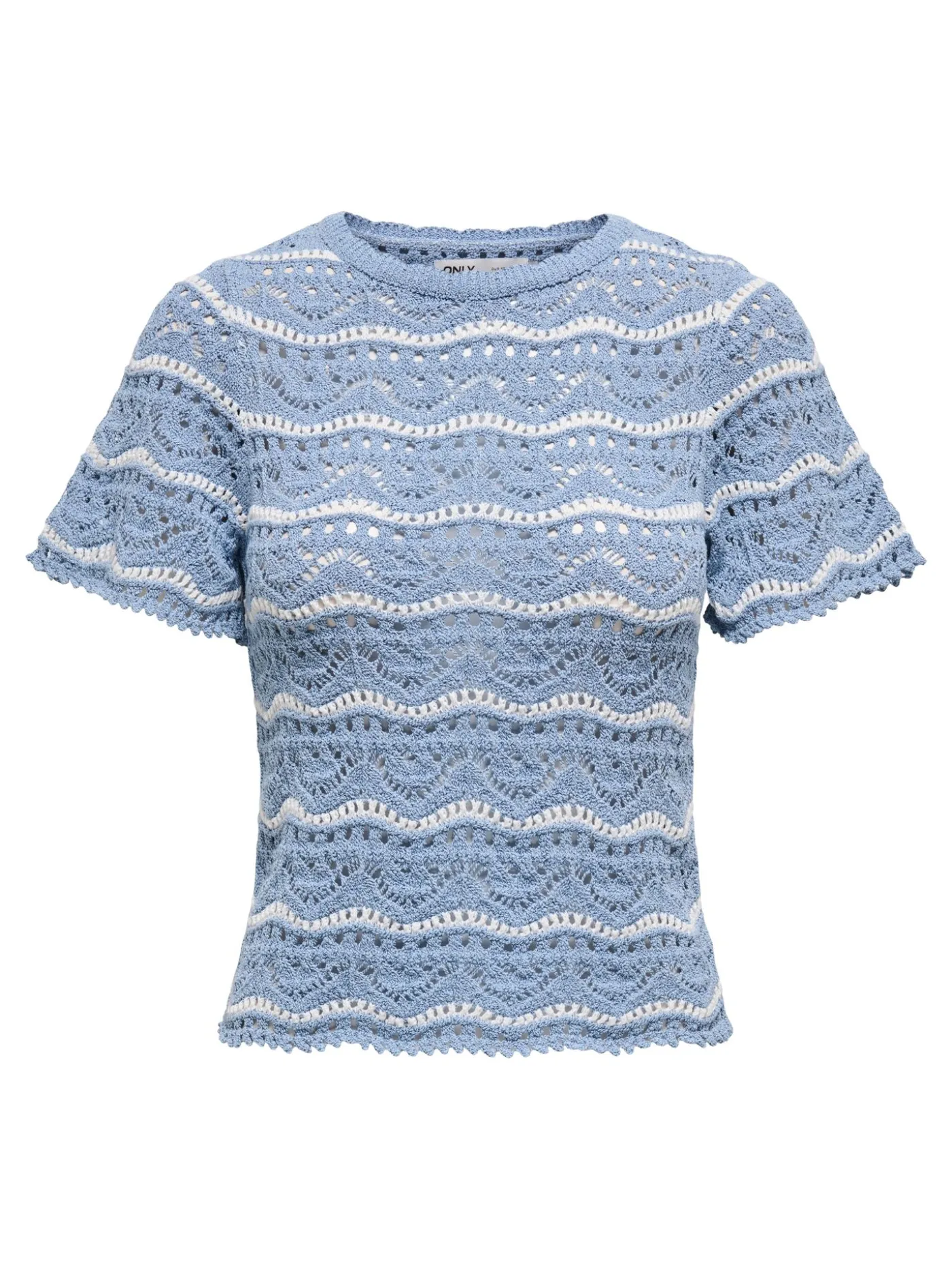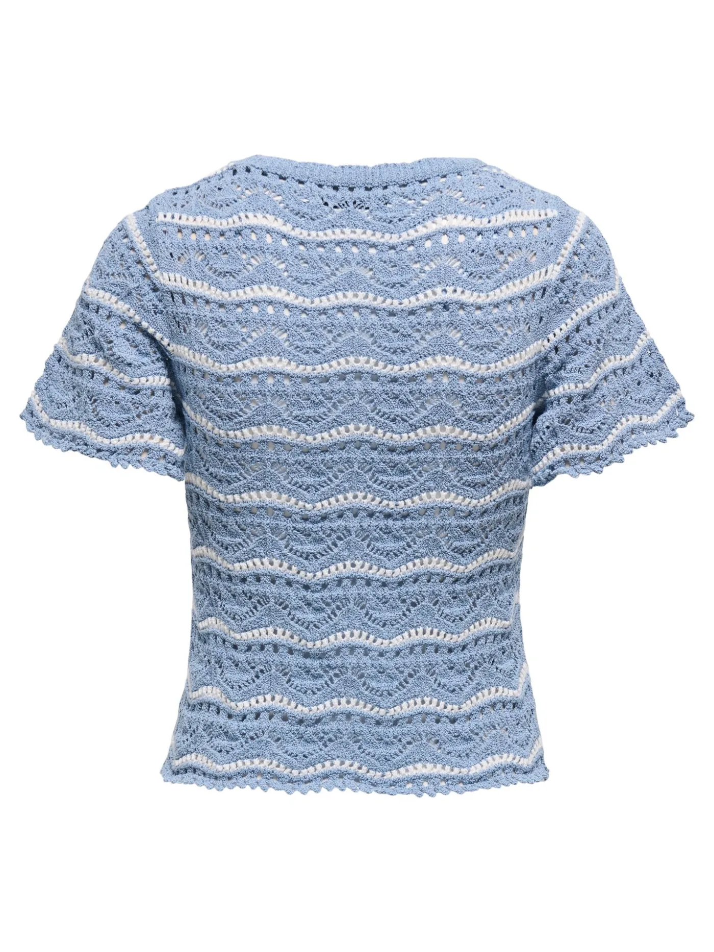 Deze leuke gehaakte top van het merk Only is een echte musthave voor komende zomer. De top heeft korte mouwen en een ronde hals. In het topje is een patroon verwerkt van witte golvende strepen. Dit geeft een leuk effect. Je kunt deze top leuk combineren met bijvoorbeeld een witte broek.