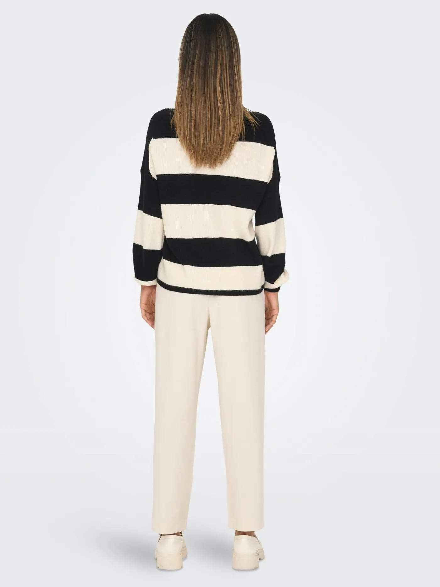 Deze zachte sweater van Only biedt een comfortabel gevoel en een stijlvolle look dankzij het subtiele streeppatroon in zwart en beige. De ronde halslijn geeft de trui een tijdloze uitstraling, waardoor hij makkelijk te combineren is met allerlei outfits. Aan de polsen is de sweater iets strakker afgewerkt, zodat de warmte goed wordt vastgehouden en de pasvorm mooi aansluit. Een ideale keuze voor dagen waarop je zowel gemak als een modieuze uitstraling wilt.