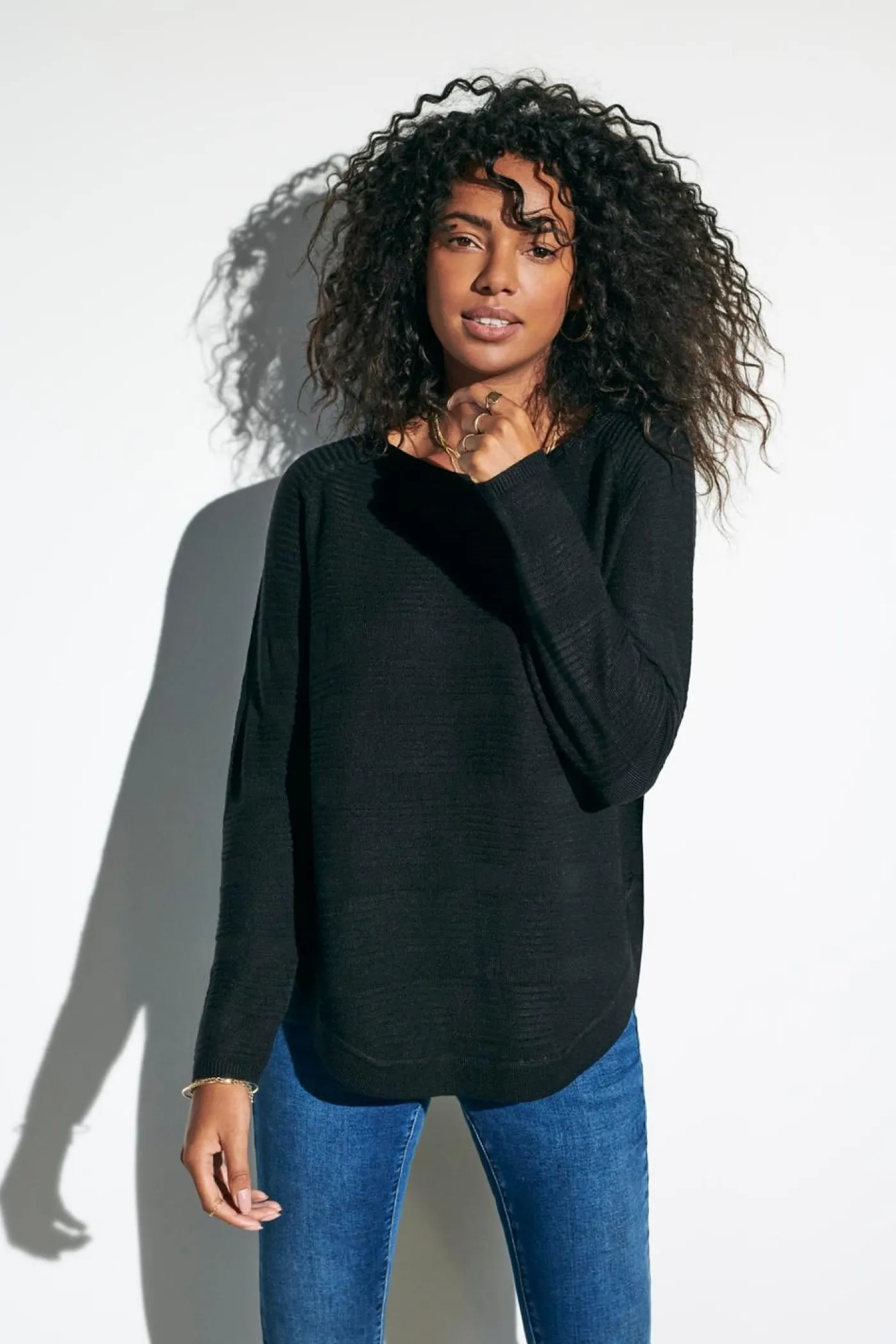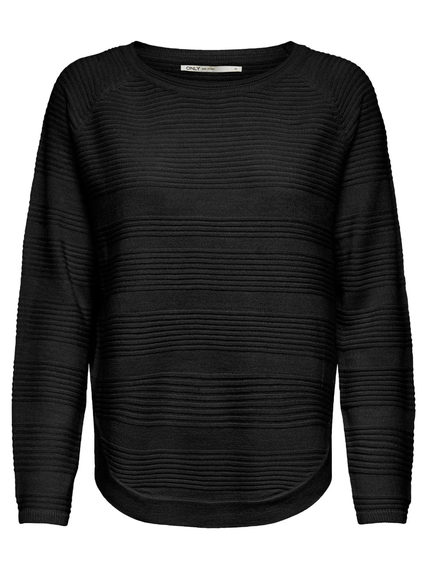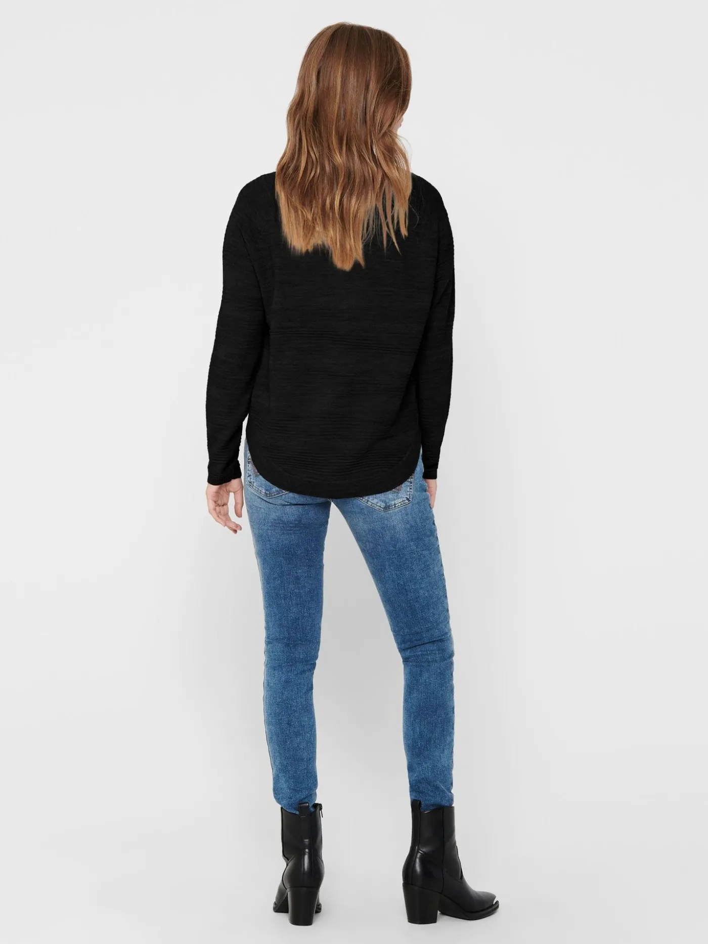 Deze zwarte gebreide trui van Only heeft lange mouwen en een wat wijdere ronde halslijn. De top is voorzien van een streeppatroon en loopt aan de onderkant rond af. Dit item valt wat losser en bevat veel stretch waardoor hij erg comfortabel draagt.