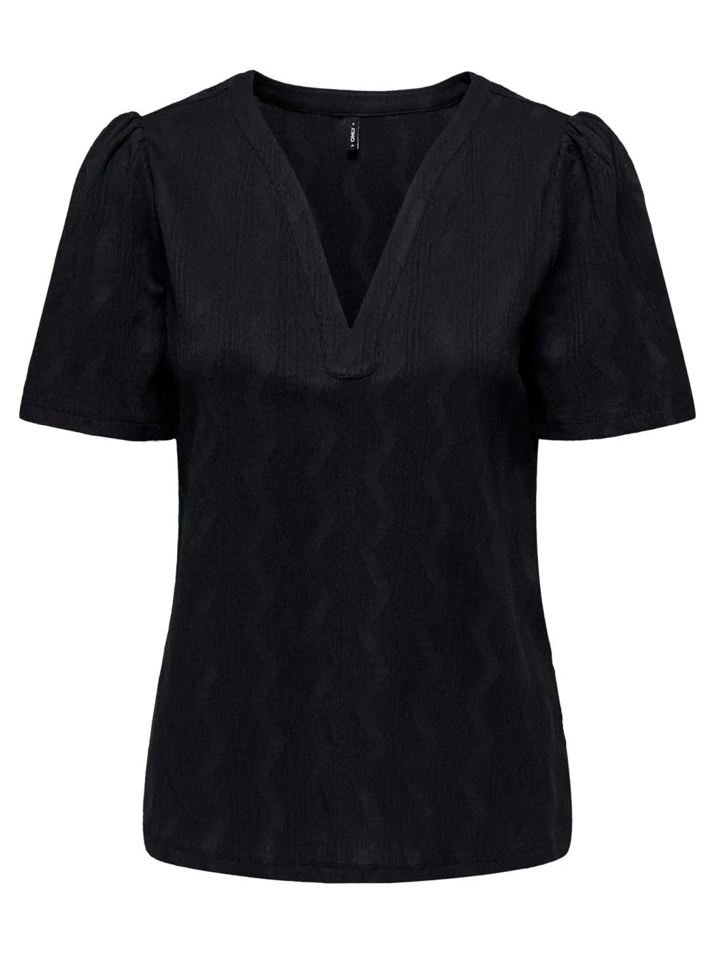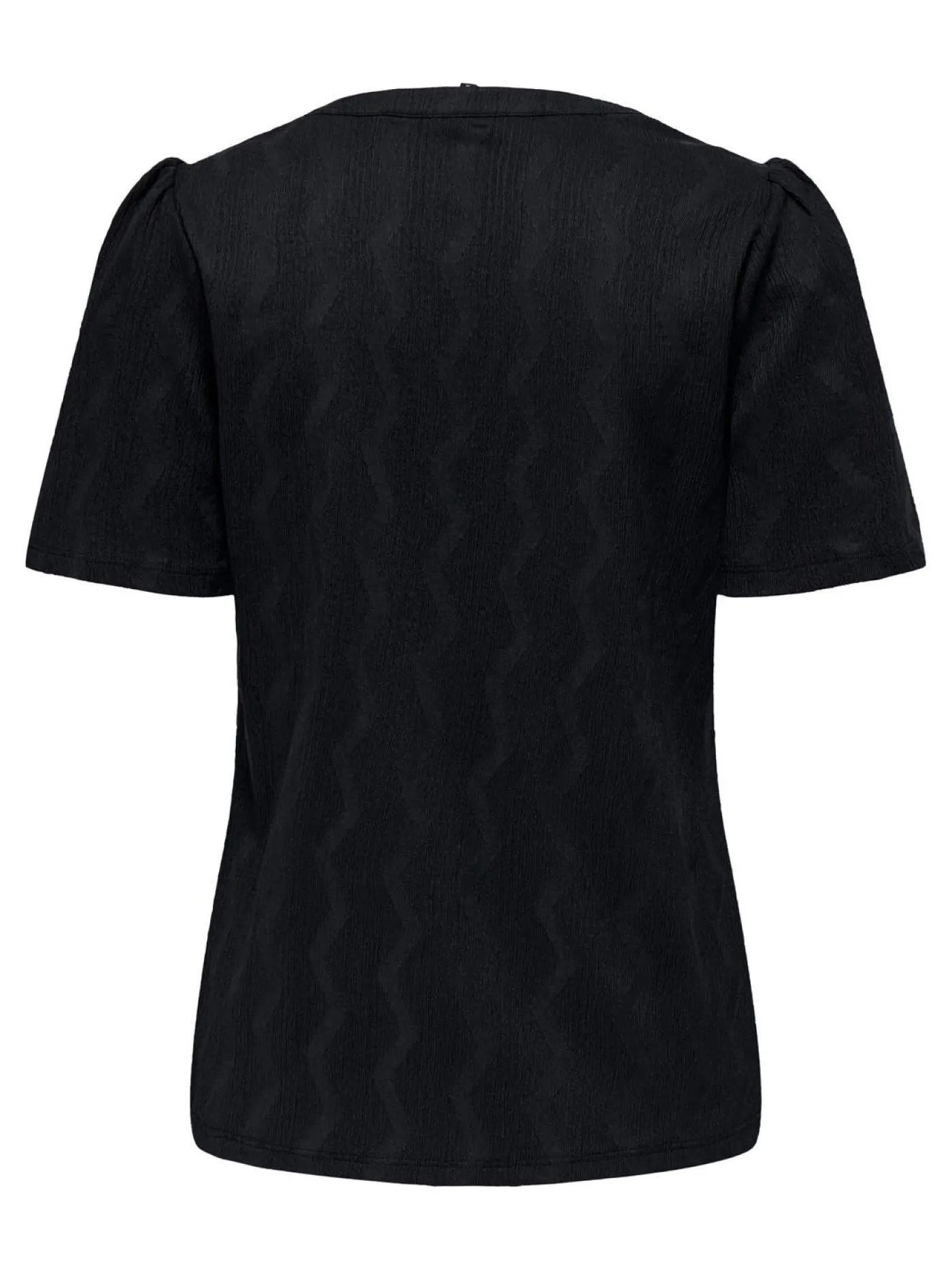 Zwarte v-neck top van het merk Only voor dames. Dit item heeft een zigzag patroon en is effen zwart. Het shirt is voorzien van korte pofmouwen en een diepe v-hals. Dit model is ook verkrijgbaar in het blauw!