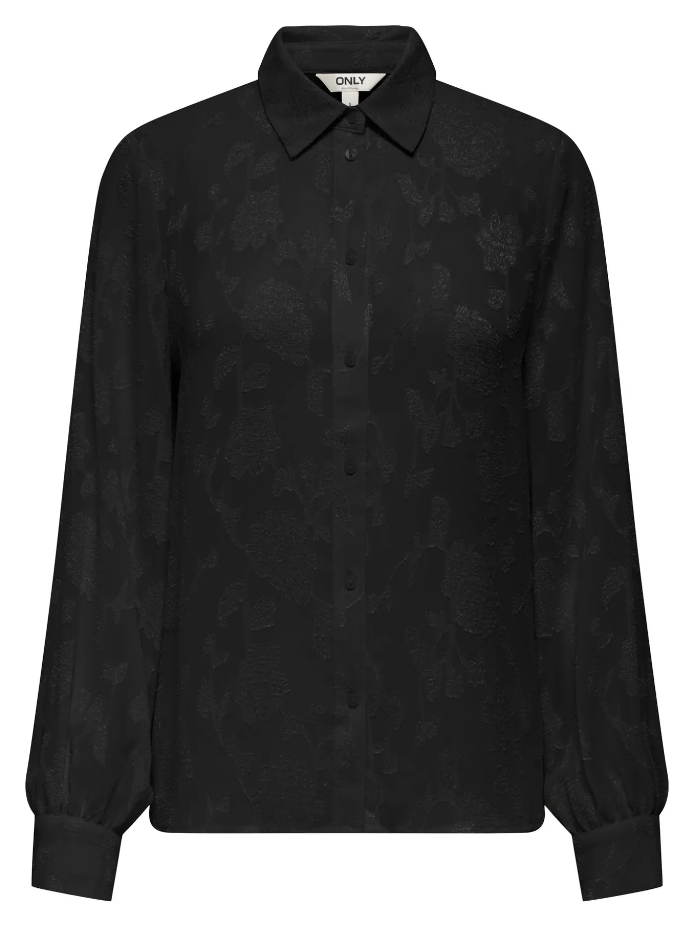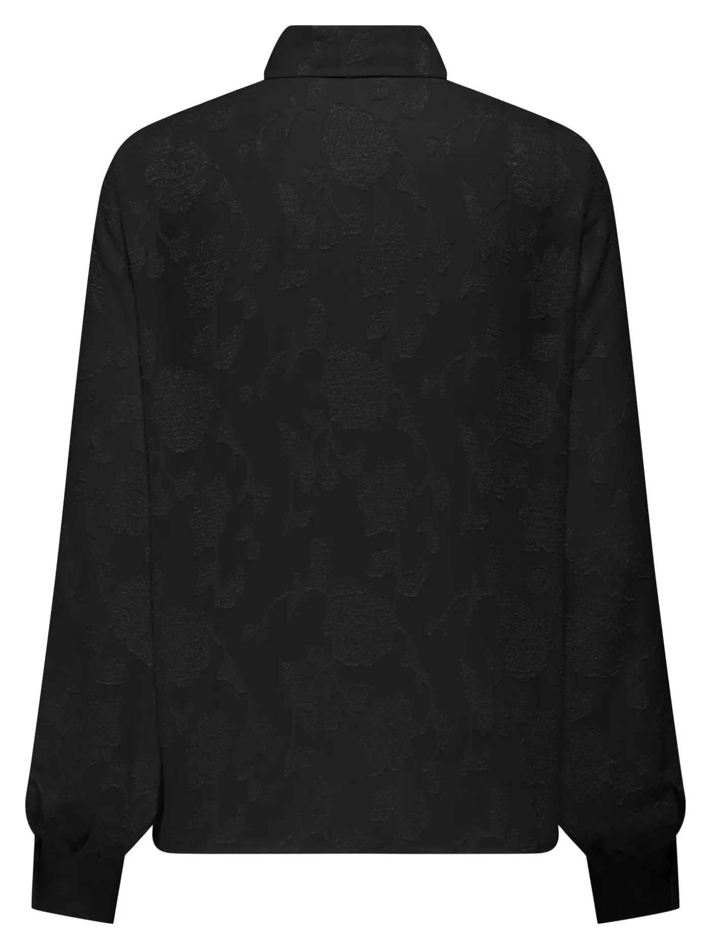 Deze zwarte damesblouse van Only is stijlvol en subtiel dankzij het jacquard bloemenpatroon dat in de stof is verwerkt. De blouse heeft een klassieke kraag en een knoopsluiting aan de voorkant. De lange mouwen zijn lichtelijk geplooid aan de manchetten, wat een elegante touch geeft. Perfect voor zowel zakelijke gelegenheden als een chique casual look. Wil je deze blouse combineren? Probeer hem met een mooie pantalon of een strakke jeans. Echt een veelzijdig stuk! Wil je er een outfittip bij?