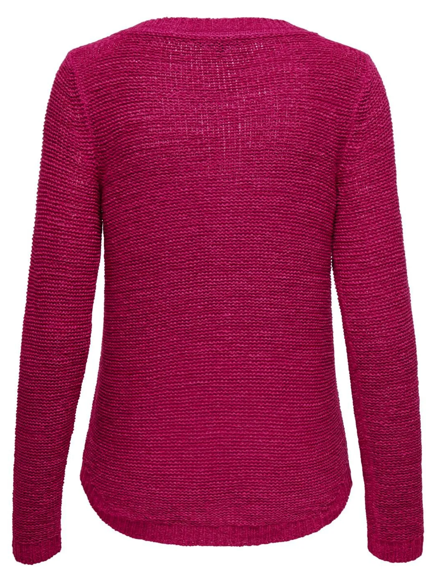 Donkerroze gebreide trui van het merk Only voor dames. Deze trui heeft een ronde halslijn en lange mouwen. De achterkant van de trui is wat langer dan de voorkant, dit geef een leuk effect.