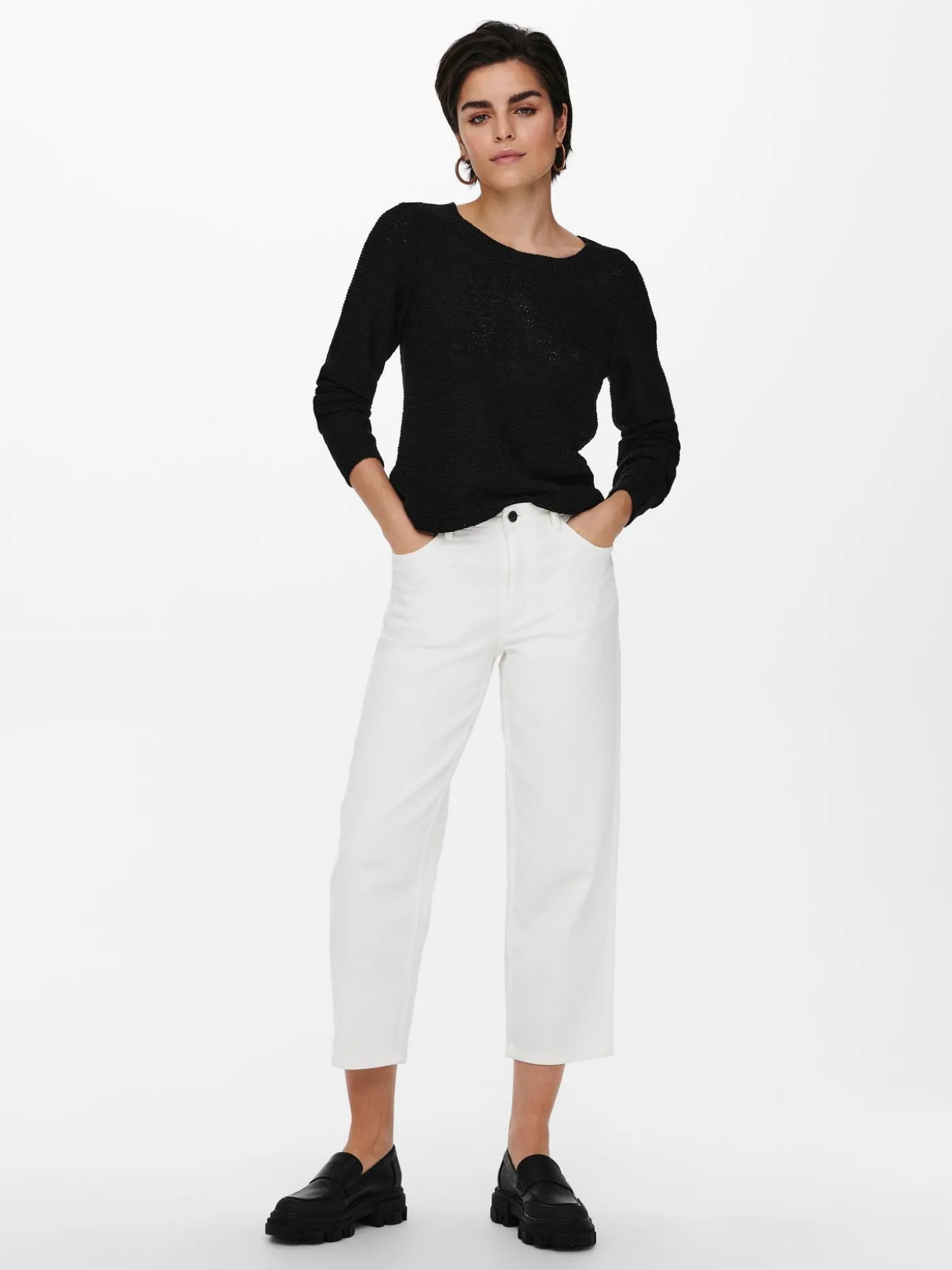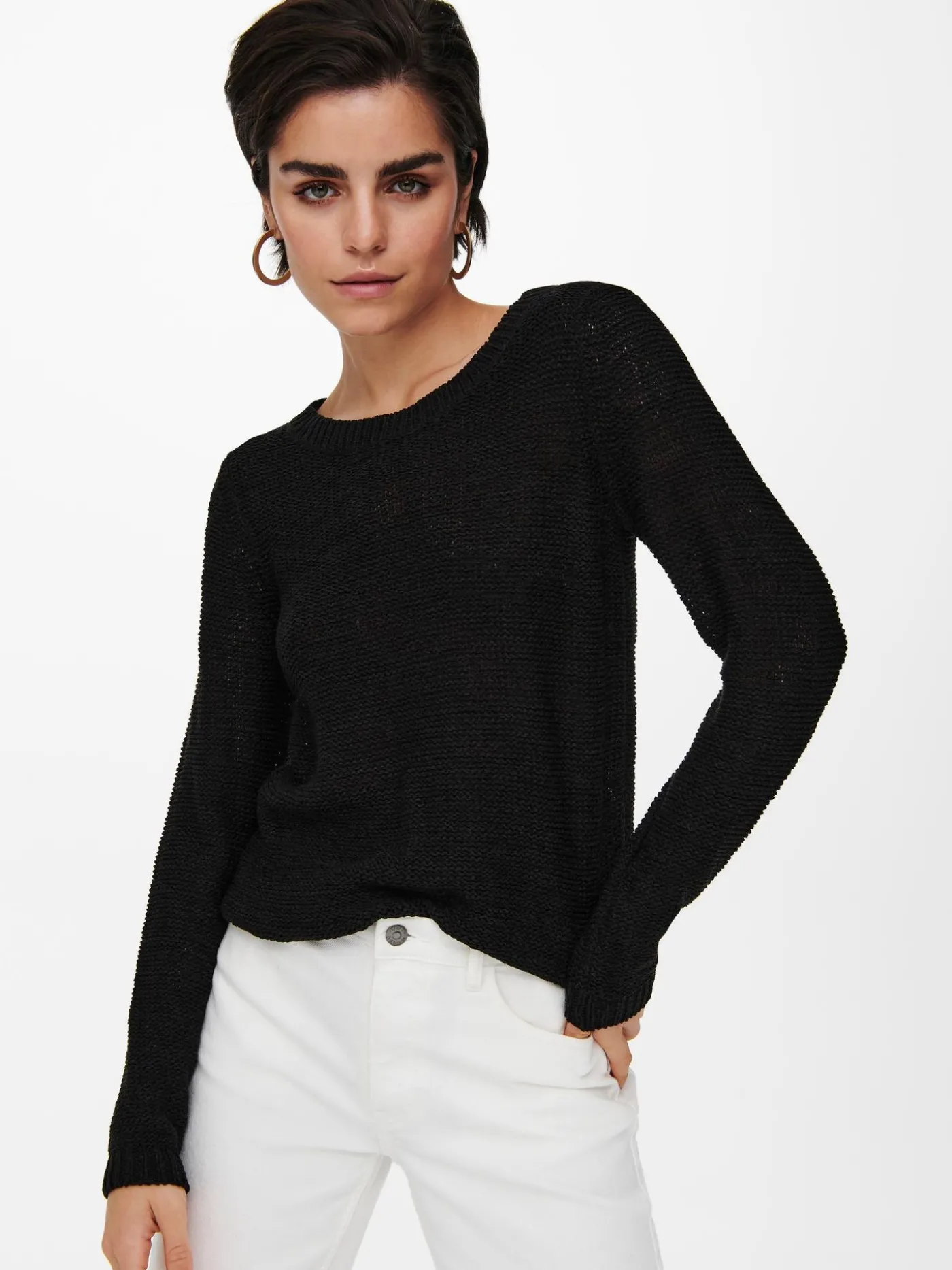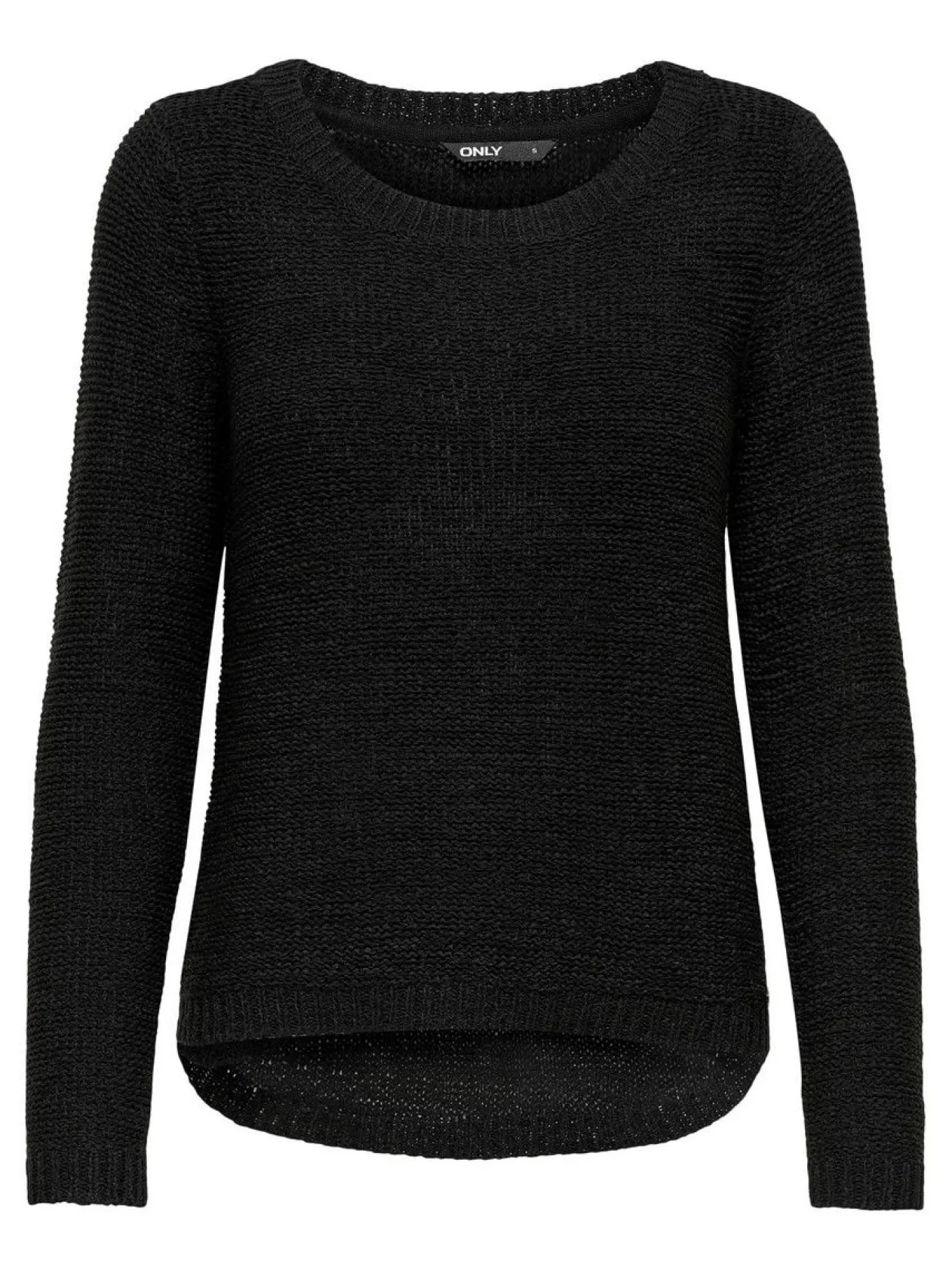 Zwarte gebreide trui van Only. Deze trui valt wat losser en is beschikbaar in diverse kleuren. De sweater is voorzien van lange mouwen en een ronde halslijn. De achterkant valt net iets langer, dit geeft een leuk effect.