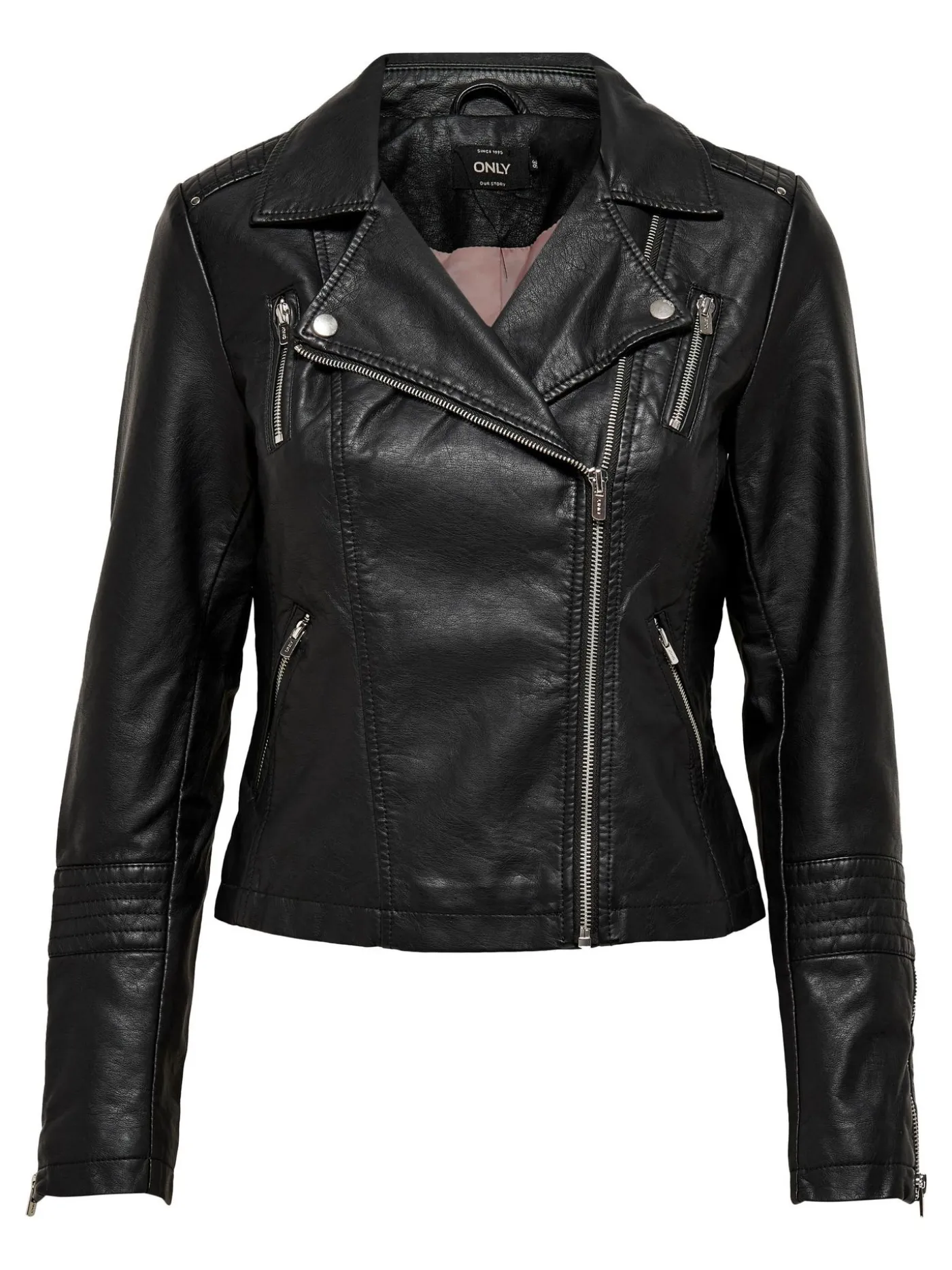 Dit bikerjack van Only heeft een asymmetrische zilveren rits aan de voorkant met twee zakken en een ritssluiting. De jas is gemaakt van imitatieleer. Het heeft twee paspelzakken met rits op de borst. De stoere bikerjack is verkrijgbaar in meerdere kleuren.