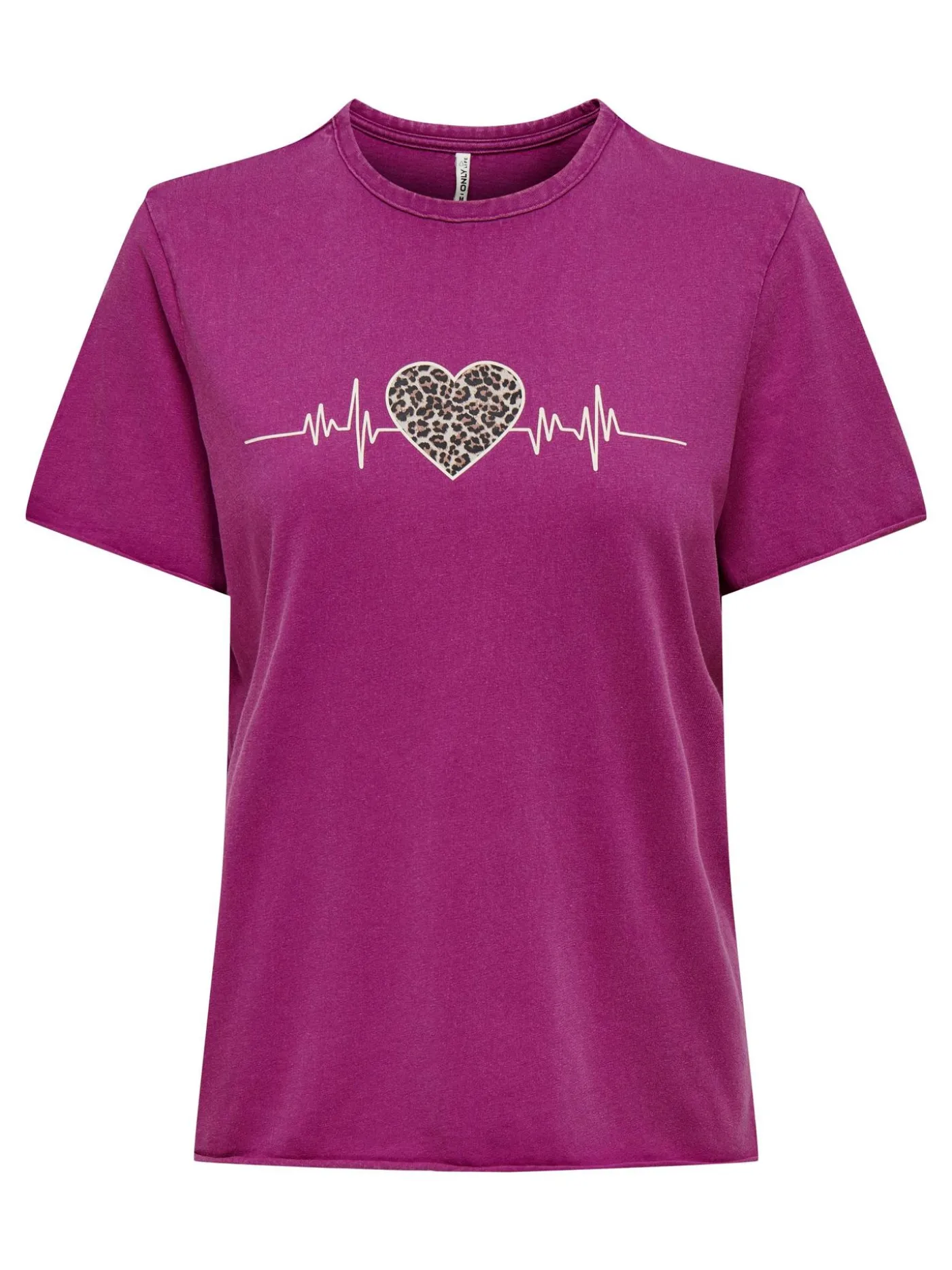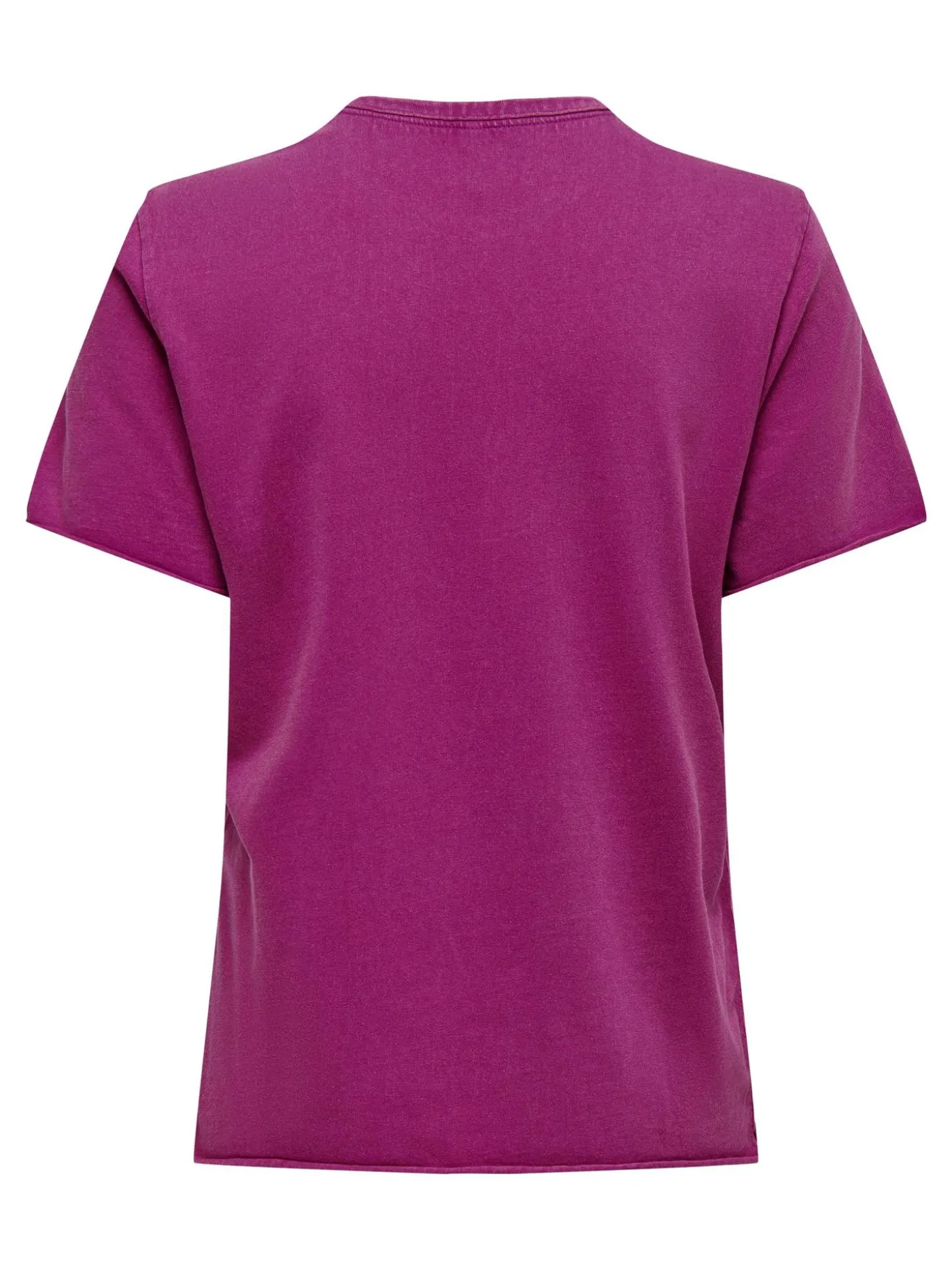 Paars T-shirt van Only voor dames. Voorzien van korte mouwen, een ronde hals en een bedrukking op de borst.