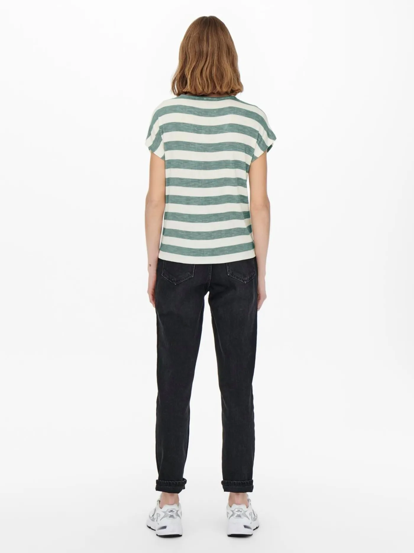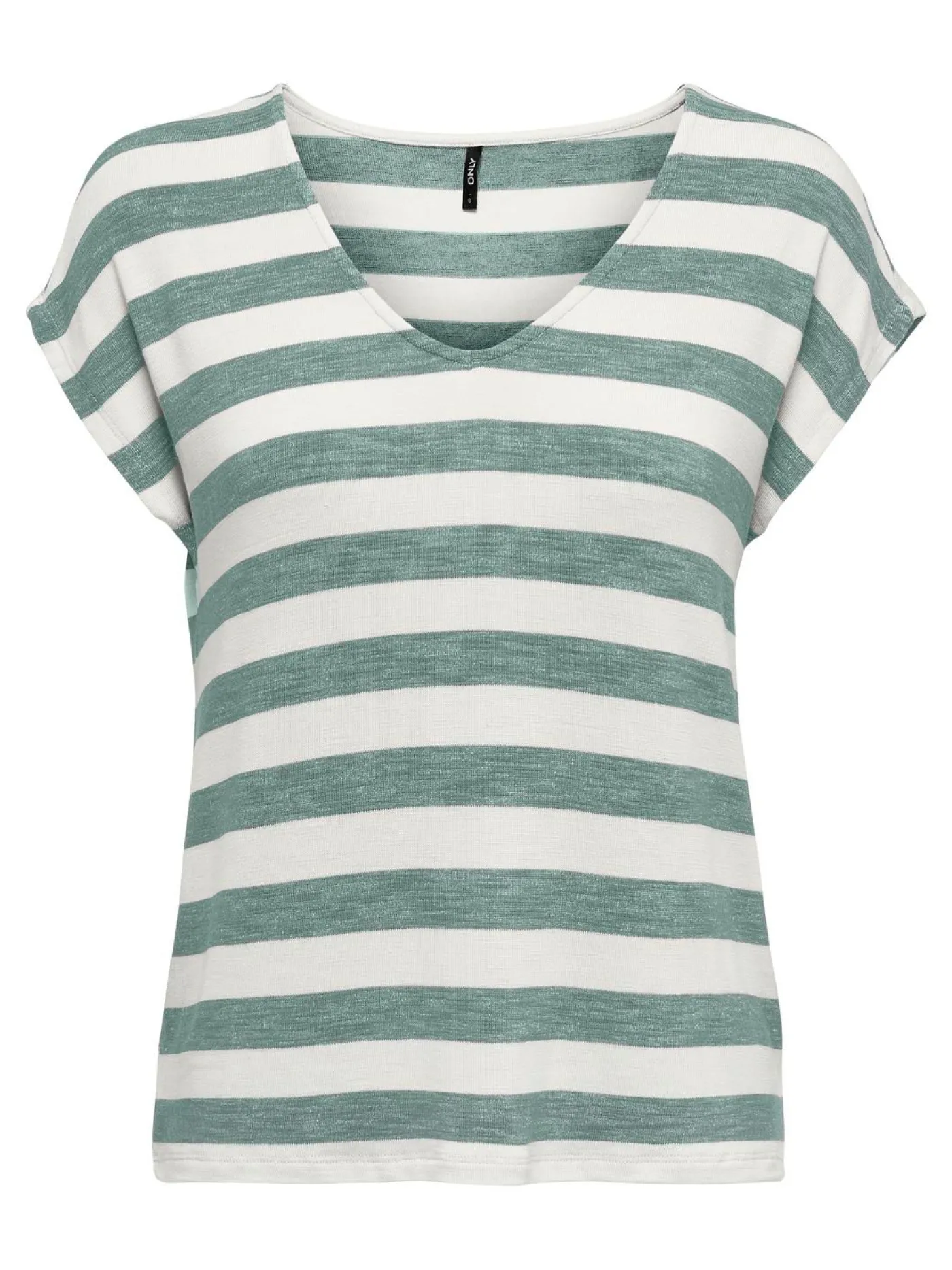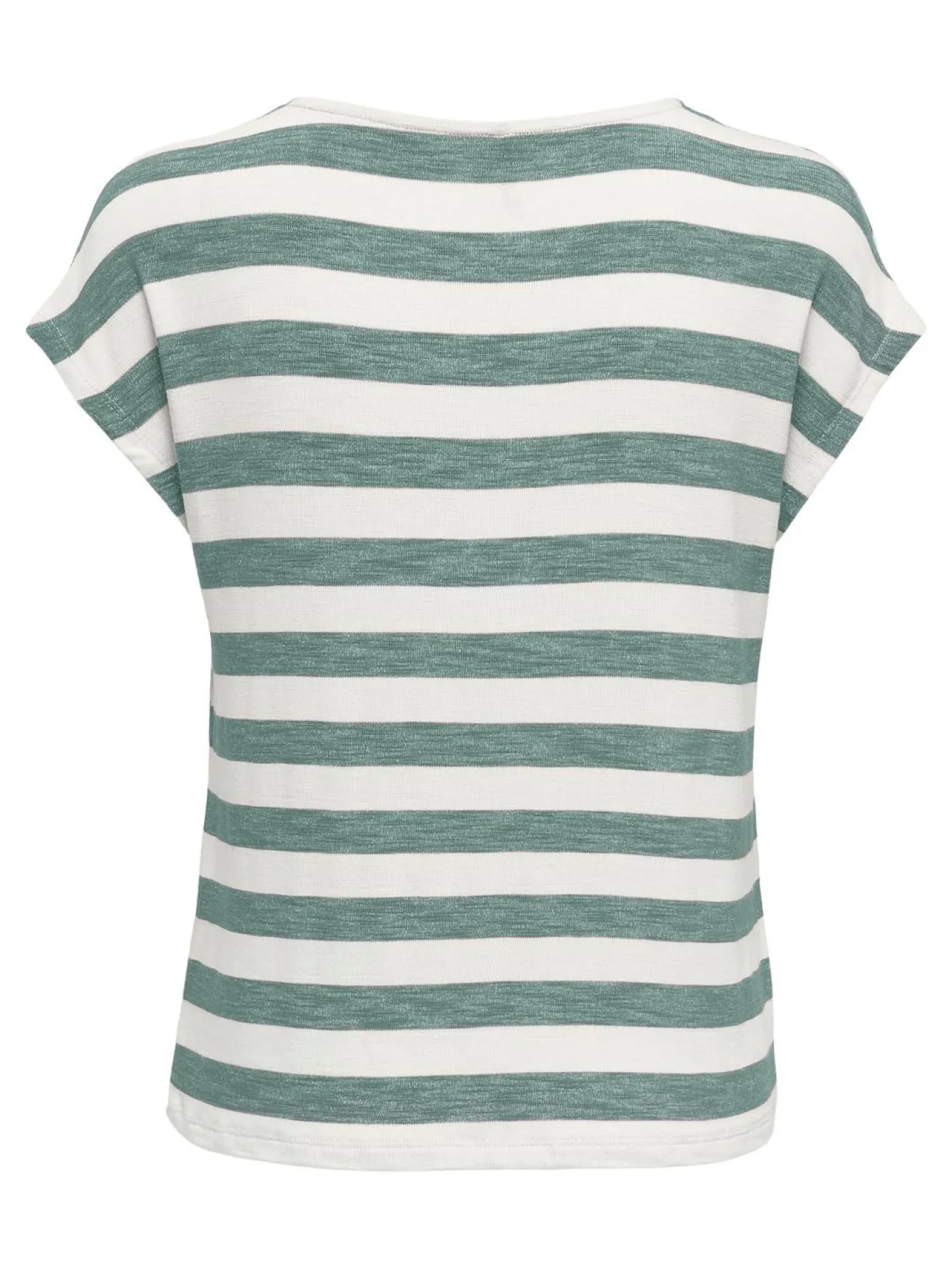 Deze dames top van Only heeft korte mouwen en een V-hals. De top is olijfgroen met wit gestreept en valt wat losser. Hij bevat veel stretch en is beschikbaar in zes kleuren!