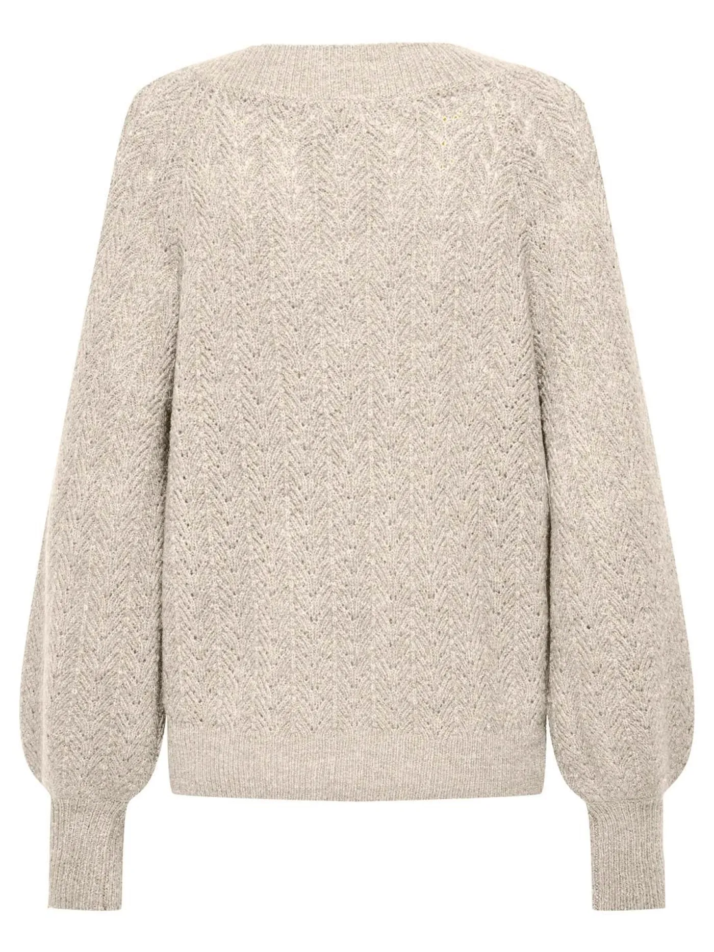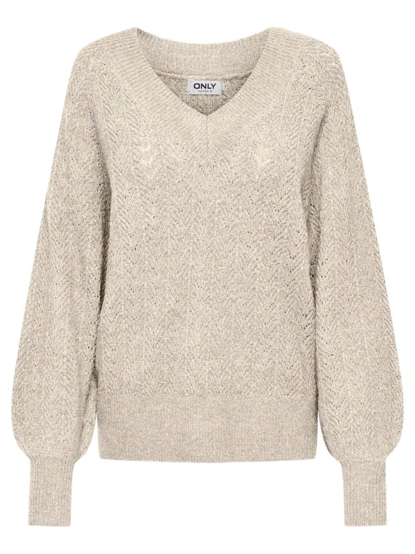 Deze beige trui van ONLY straalt warmte en elegantie uit dankzij de subtiele glitters die een mooie, feestelijke glans geven. De zachte stof voelt heerlijk comfortabel aan en is perfect voor zowel dagelijkse looks als nettere gelegenheden. De V-hals zorgt voor een vrouwelijke, verfijnde uitstraling. Door de neutrale beige tint is de trui makkelijk te combineren met allerlei outfits. Een stijlvolle keuze voor wie houdt van een zachte, chique look met een vleugje sparkle.