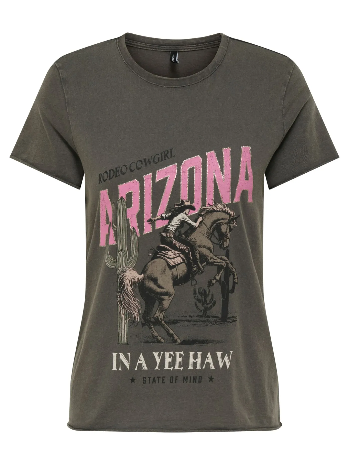 Dit stoere t-shirt met korte mouwen van het merk Only, mag niet ontbreken in jouw kledingkast. Het t-shirt heeft een donkergrijze kleur en aan de voorkant staat een opdruk van een cowboy op paard. Je kunt dit t-shirt combineren met bijvoorbeeld een stoere jeans en een blazer.