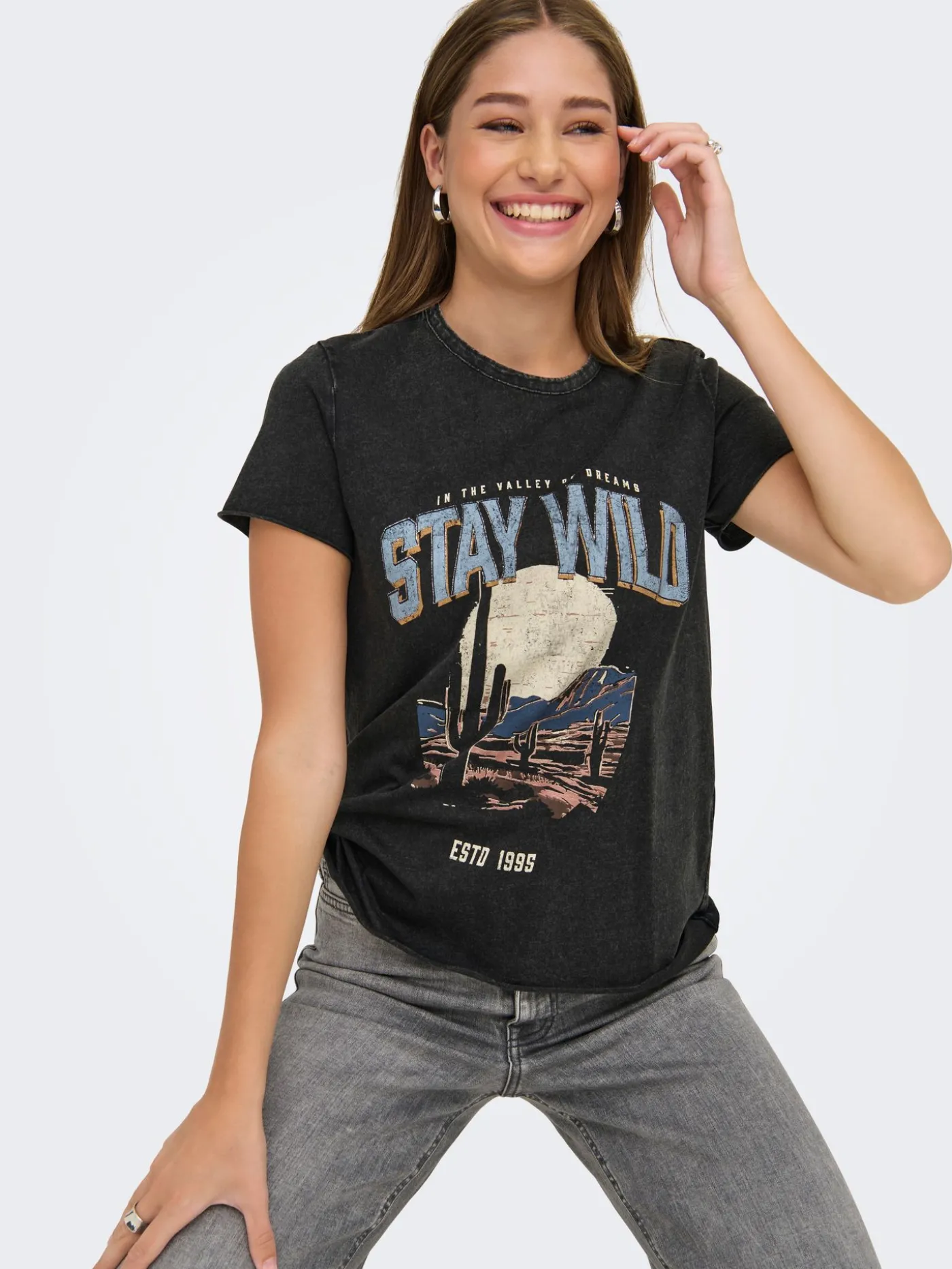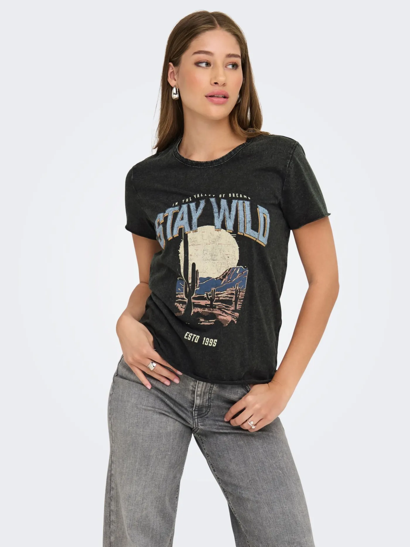 Dit stoere t-shirt is onderdeel van de nieuwste collectie van Only. Het t-shirt is zwart/grijs en heeft aan de voorzijde een opdruk van cactussen met de tekst “In the valley of dreams stay wild”. Je kunt dit t-shirt combineren met een lichtgekleurde jeans voor een stoere casual look.