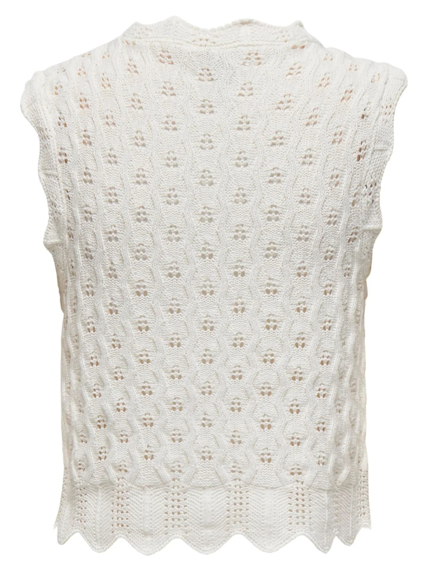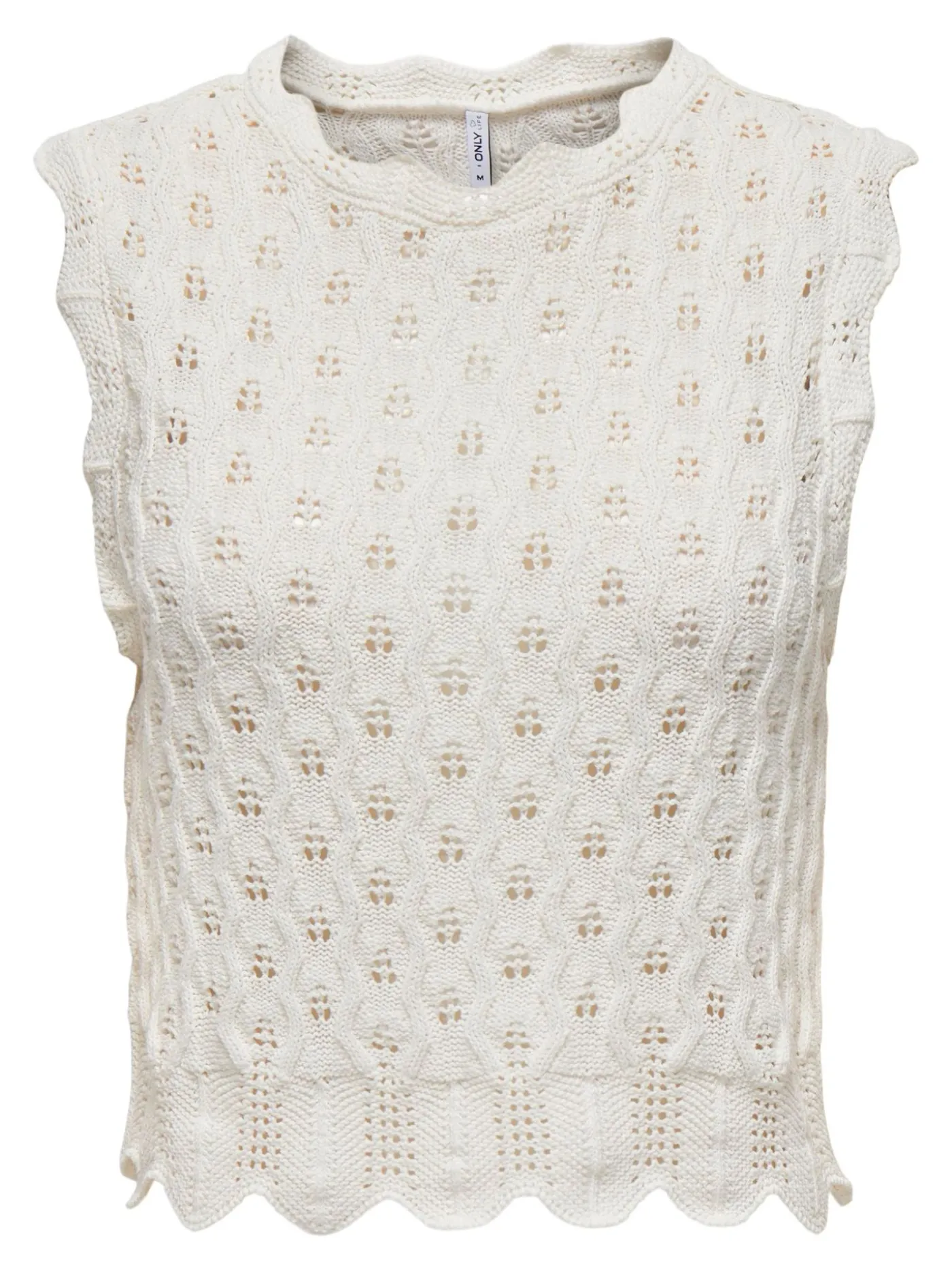 Wit gebreid topje van het merk Only voor dames. Dit model is mouwloos, heeft een ronde halslijn en geschulpte randen bij de schouders en aan de onderzijde van de top. Dit item is verkrijgbaar in twee kleuren.