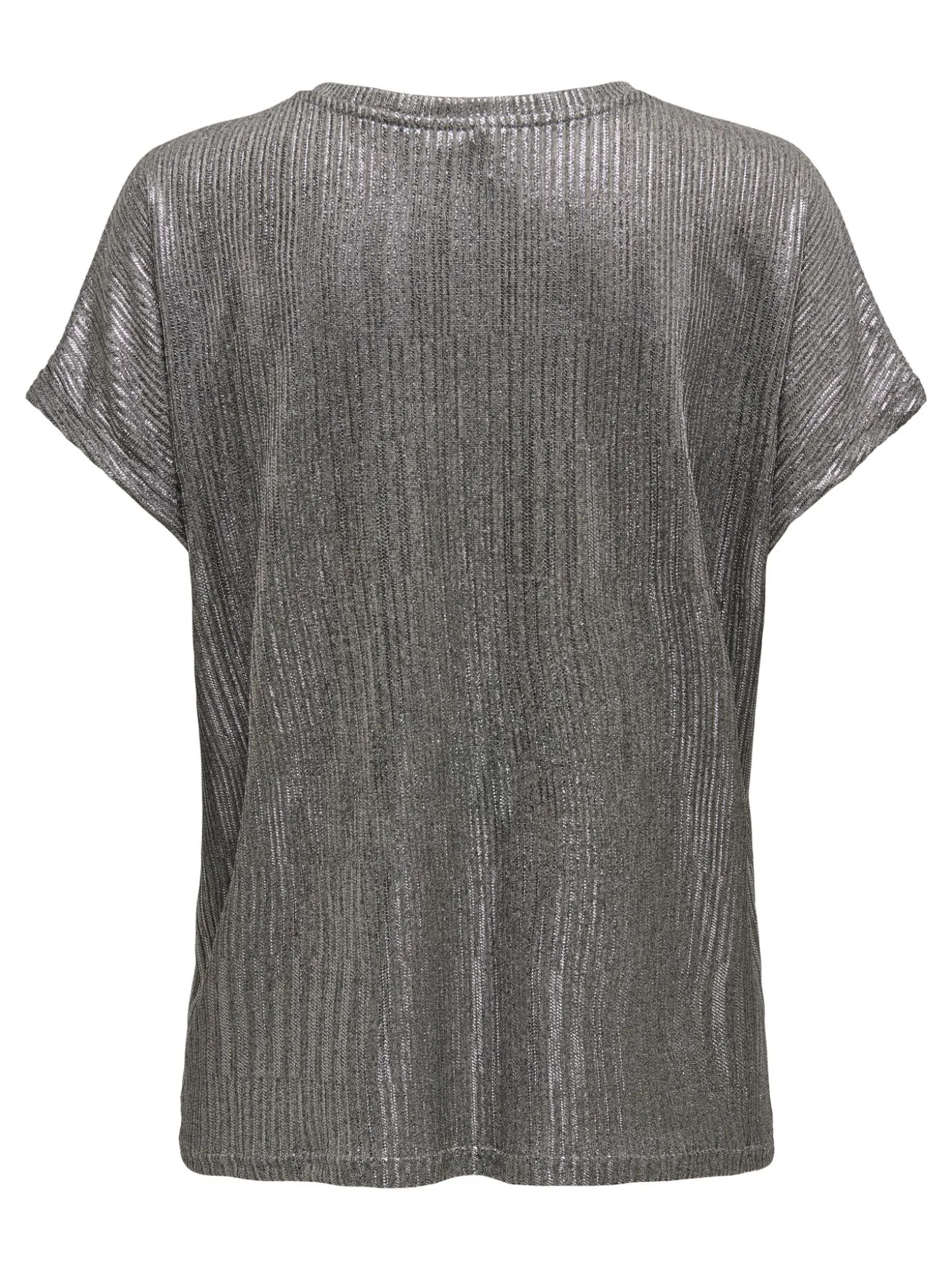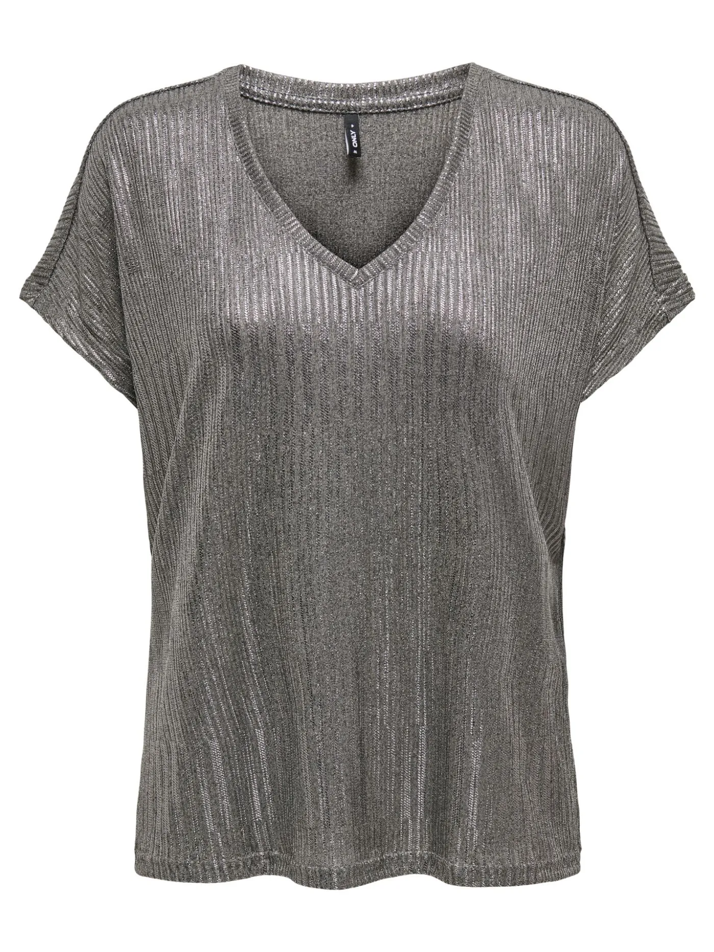 Een elegante top met korte mouwen en een V-hals, uitgevoerd in een gemêleerde donkergrijze tint met een subtiele zilveren glans. Gemaakt van een zachte, licht rekbare stof, biedt deze top zowel comfort als stijl. De regular fit en normale lengte maken het een veelzijdig kledingstuk, ideaal voor zowel casual als nette outfits.