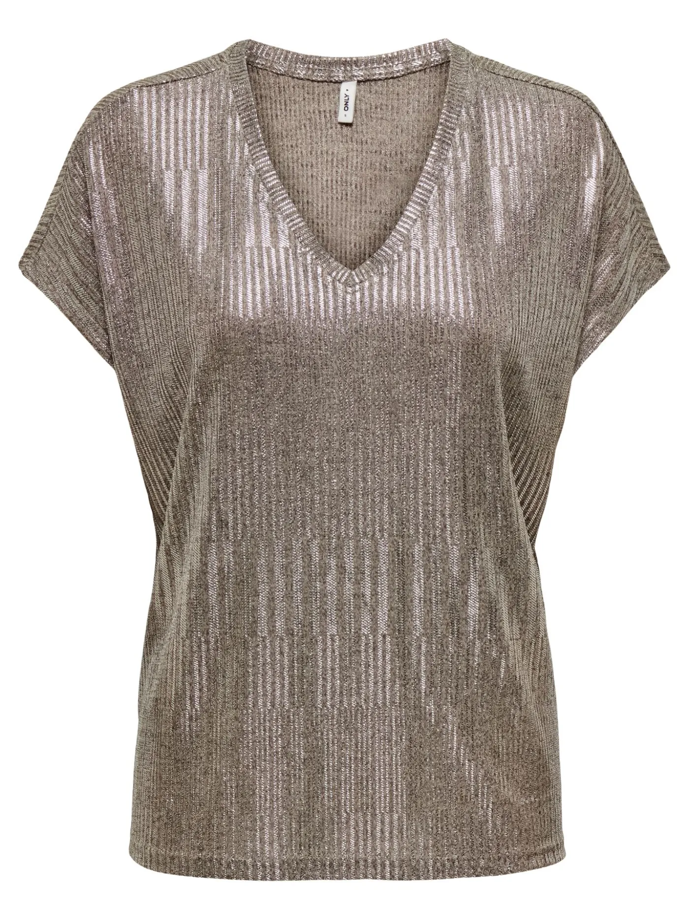 Een stijlvolle top met korte mouwen en een V-hals, uitgevoerd in een zachte, lichtbruine melange met een subtiele zilveren glans. Gemaakt van een comfortabele mix , biedt deze top zowel zachtheid als een beetje rek. De regular fit en normale lengte maken het een veelzijdig kledingstuk, ideaal voor zowel casual als nette outfits.