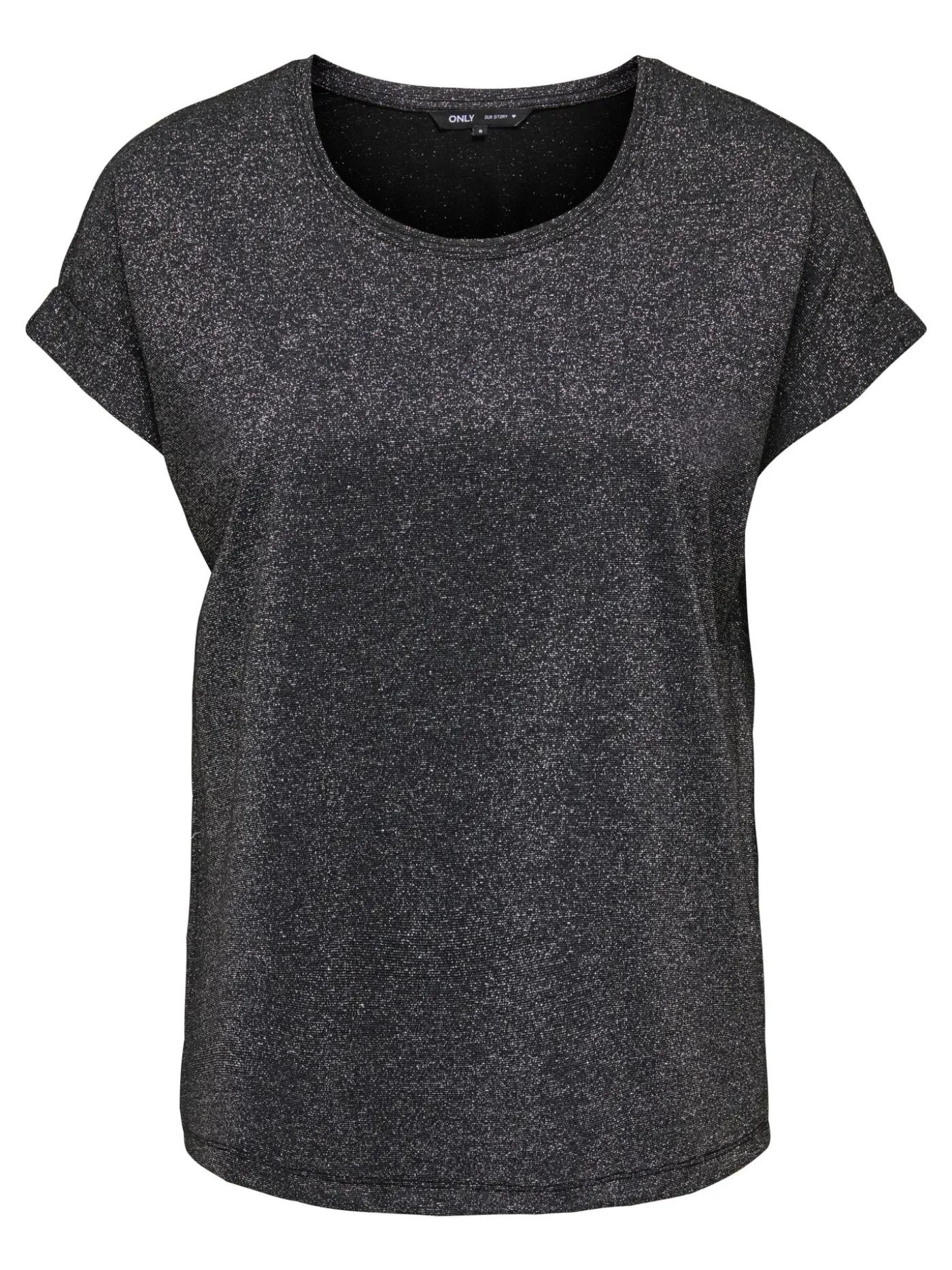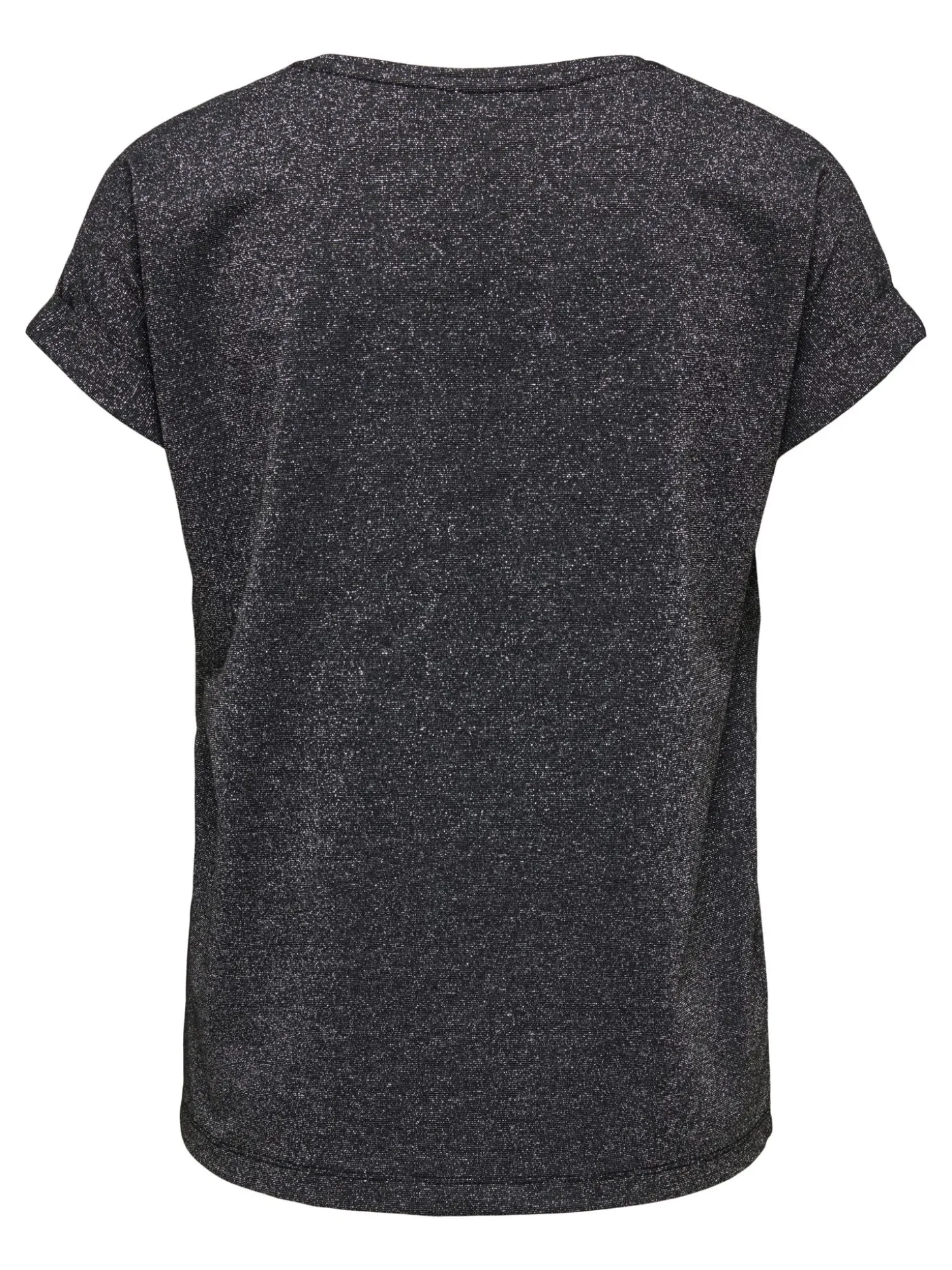 Breng extra sparkle in je outfit met dit zwarte dames T-shirt met zilveren glittereffect. De top heeft een ronde hals en korte, opgerolde mouwen voor een speelse en casual uitstraling. De licht glanzende stof geeft een feestelijke touch, terwijl de rechte pasvorm zorgt voor optimaal draagcomfort. Perfect voor een avondje uit, de feestdagen of om een basic look net dat beetje extra te geven.
