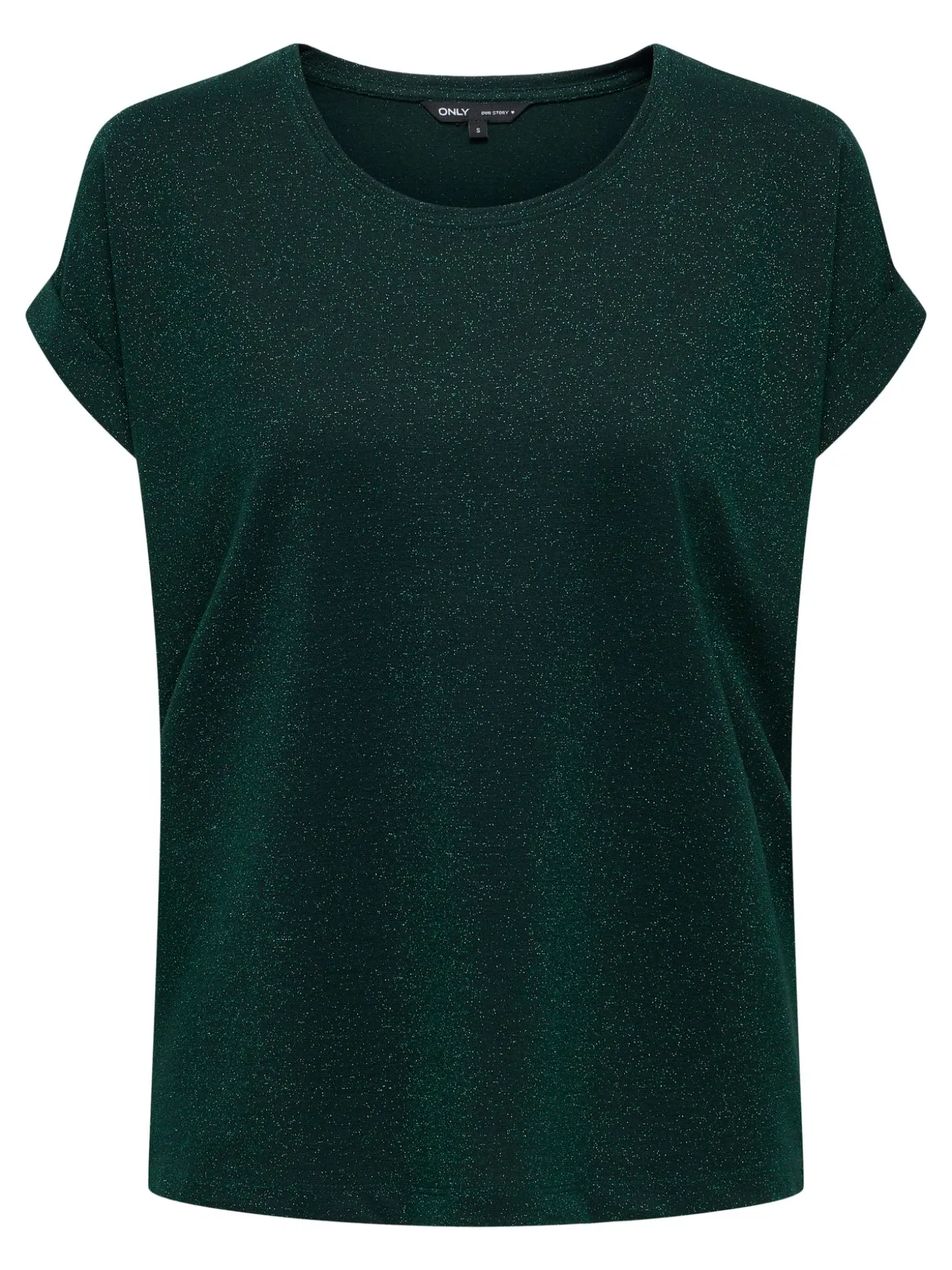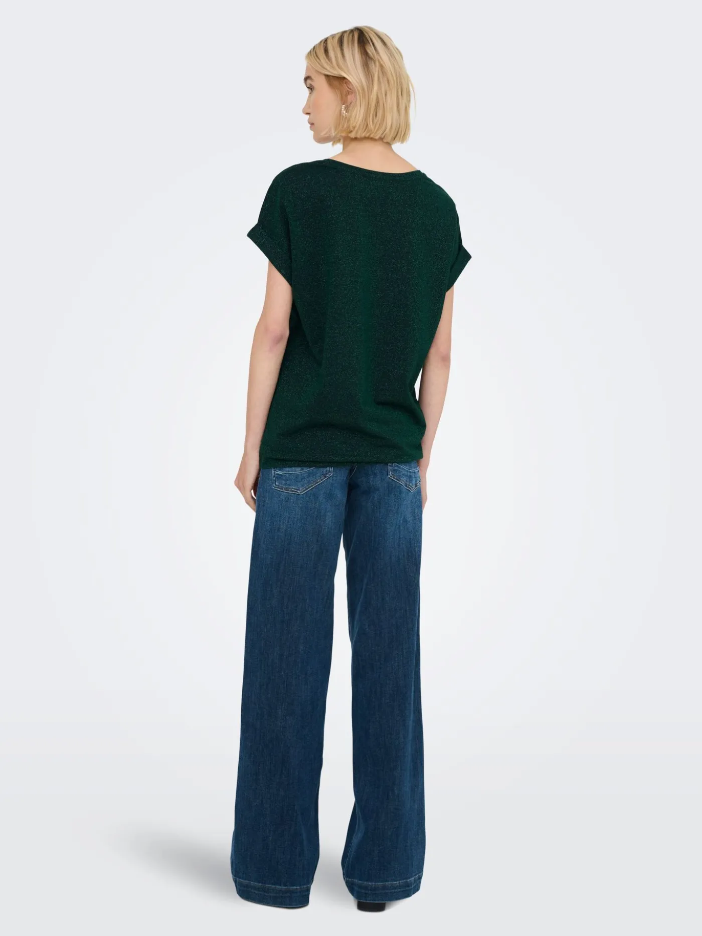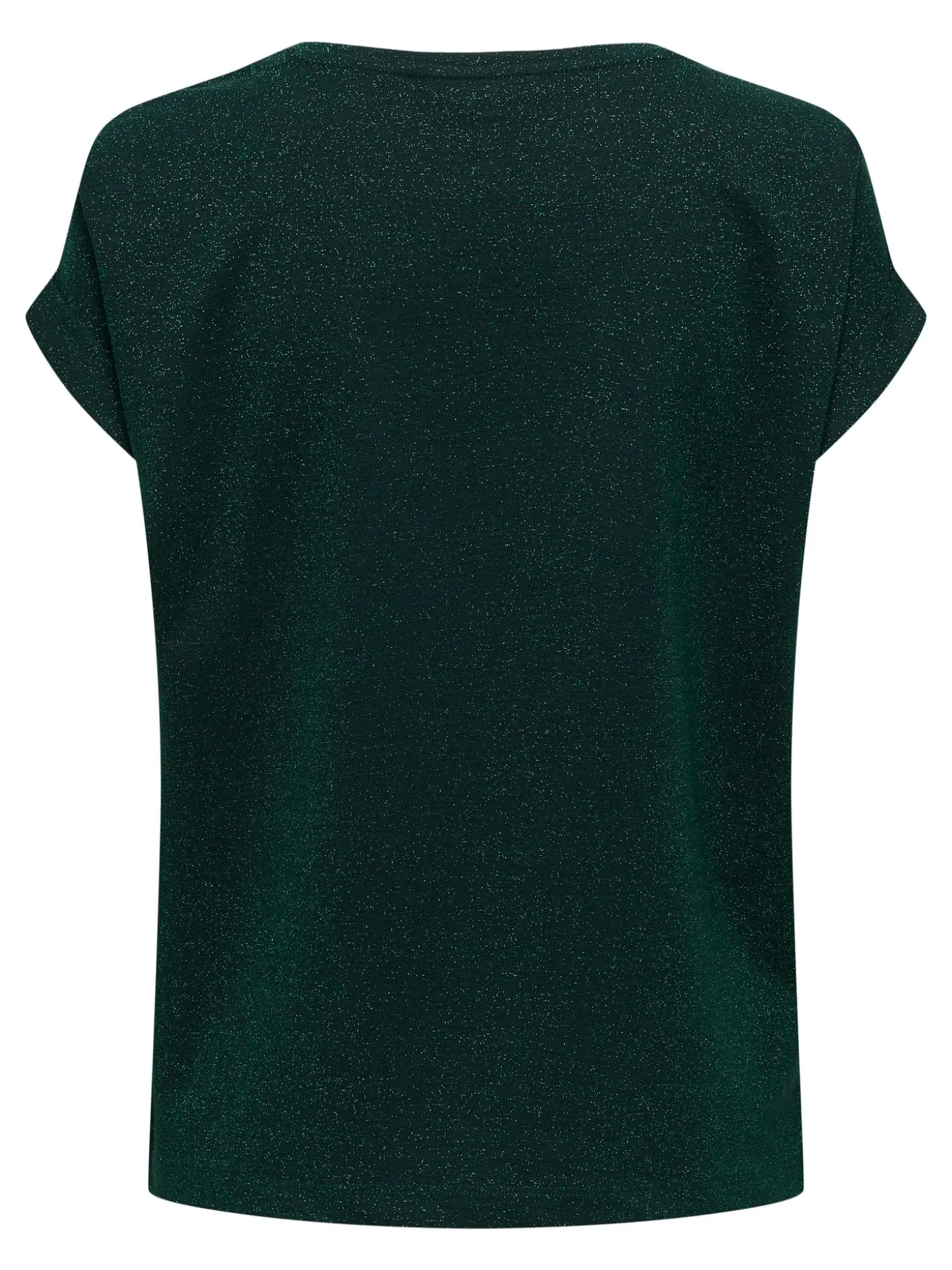 Deze stijlvolle donkergroene top met subtiele glitters is perfect voor een feestelijke look met een casual twist. De top heeft een ronde halslijn en opgerolde korte mouwen wat zorgt voor een nonchalant maar verfijnd silhouet. De licht glinsterende stof geeft een elegante flair, ideaal voor zowel overdag als ’s avonds. Combineer met een jeans voor een casual outfit of draag het met een rok of pantalon voor een meer geklede gelegenheid.