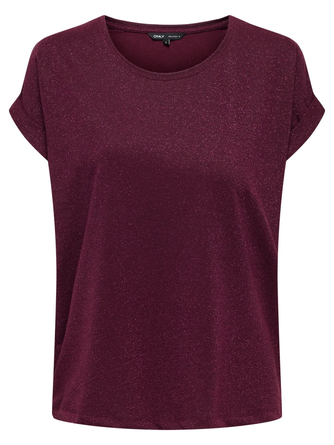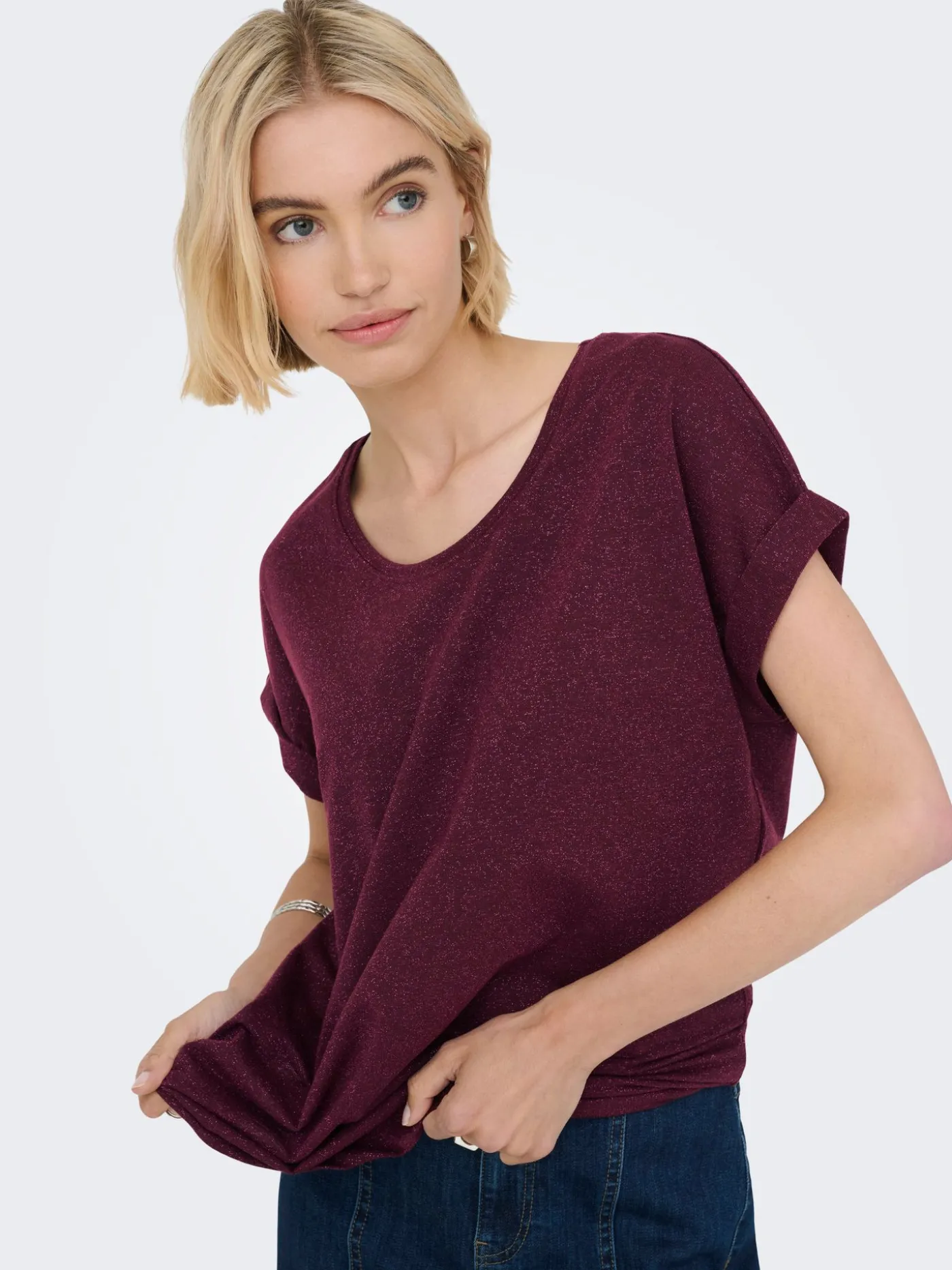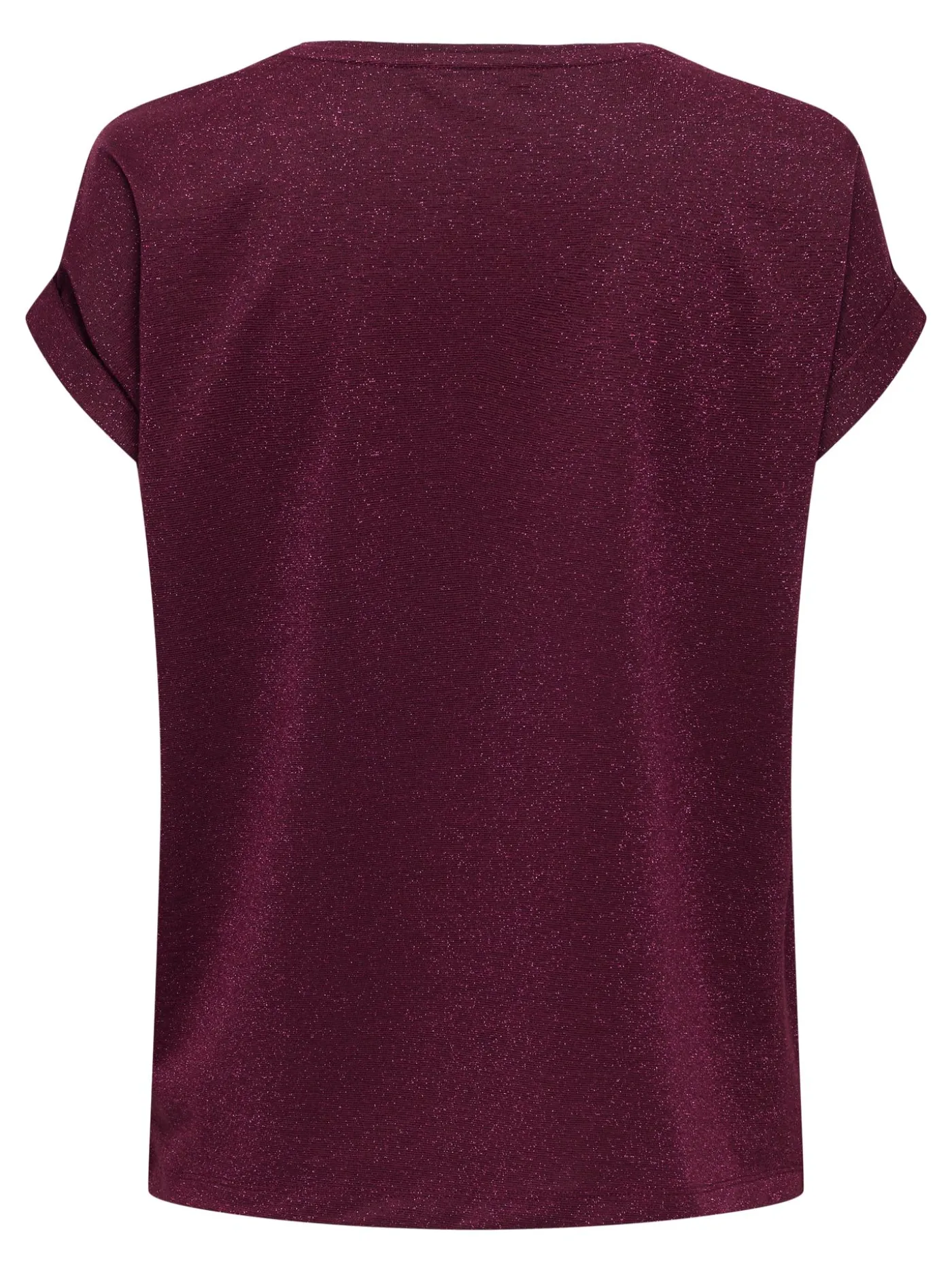 Steel de show met dit stijlvolle glitterschirt in een diepe bordeauxrode kleur. De subtiele glans in de stof geeft het T-shirt een feestelijke en vrouwelijke uitstraling, terwijl het comfortabele model zorgt voor een fijne pasvorm. De top heeft een ronde hals en korte opgerolde mouwen voor een moderne en casual look. Perfect voor een avondje uit, feestdagen of om je dagelijkse outfit een sprankelende twist te geven.