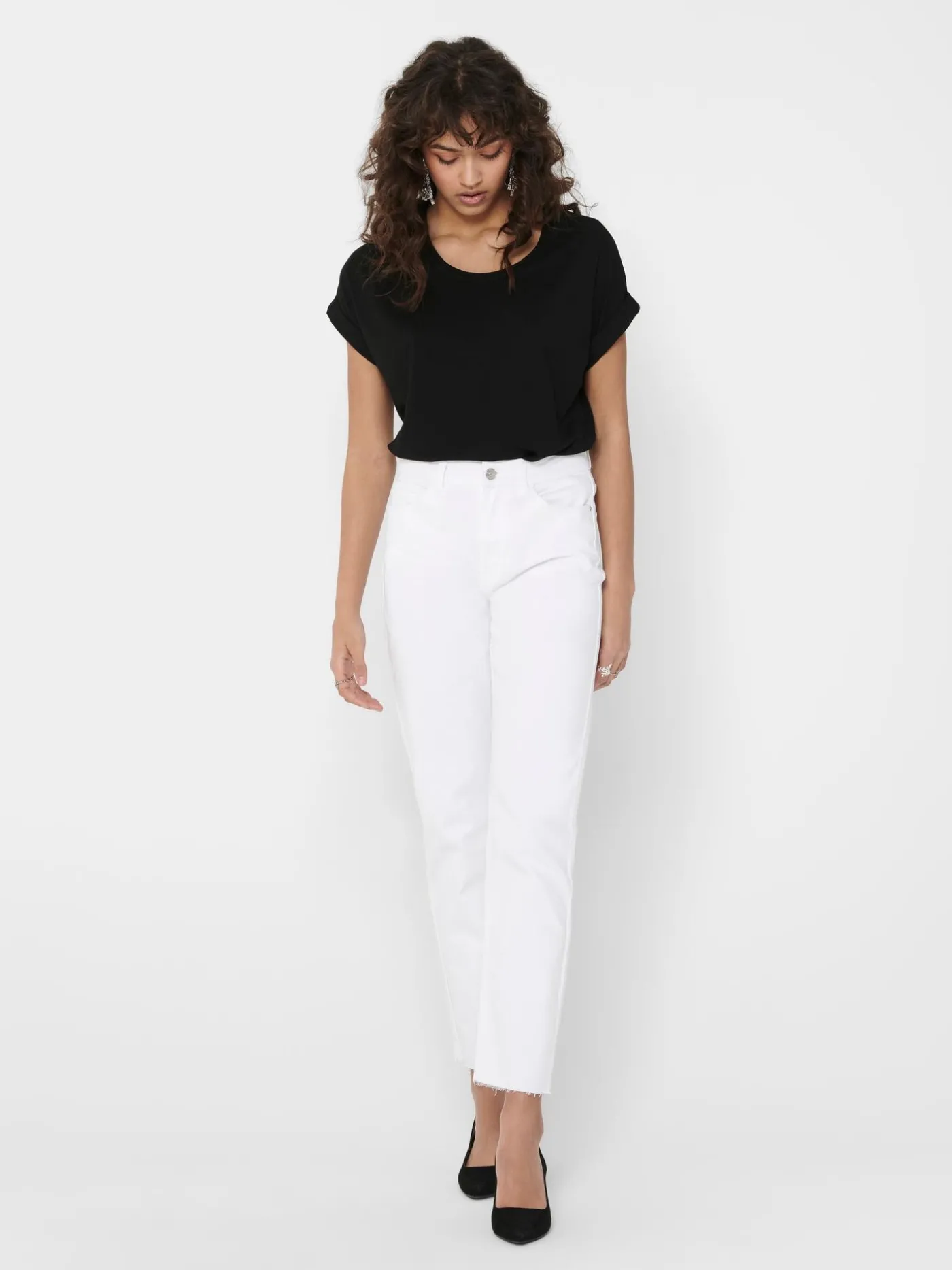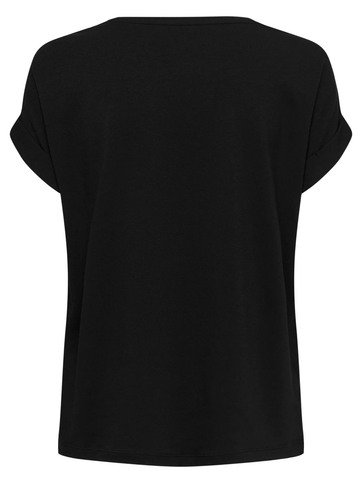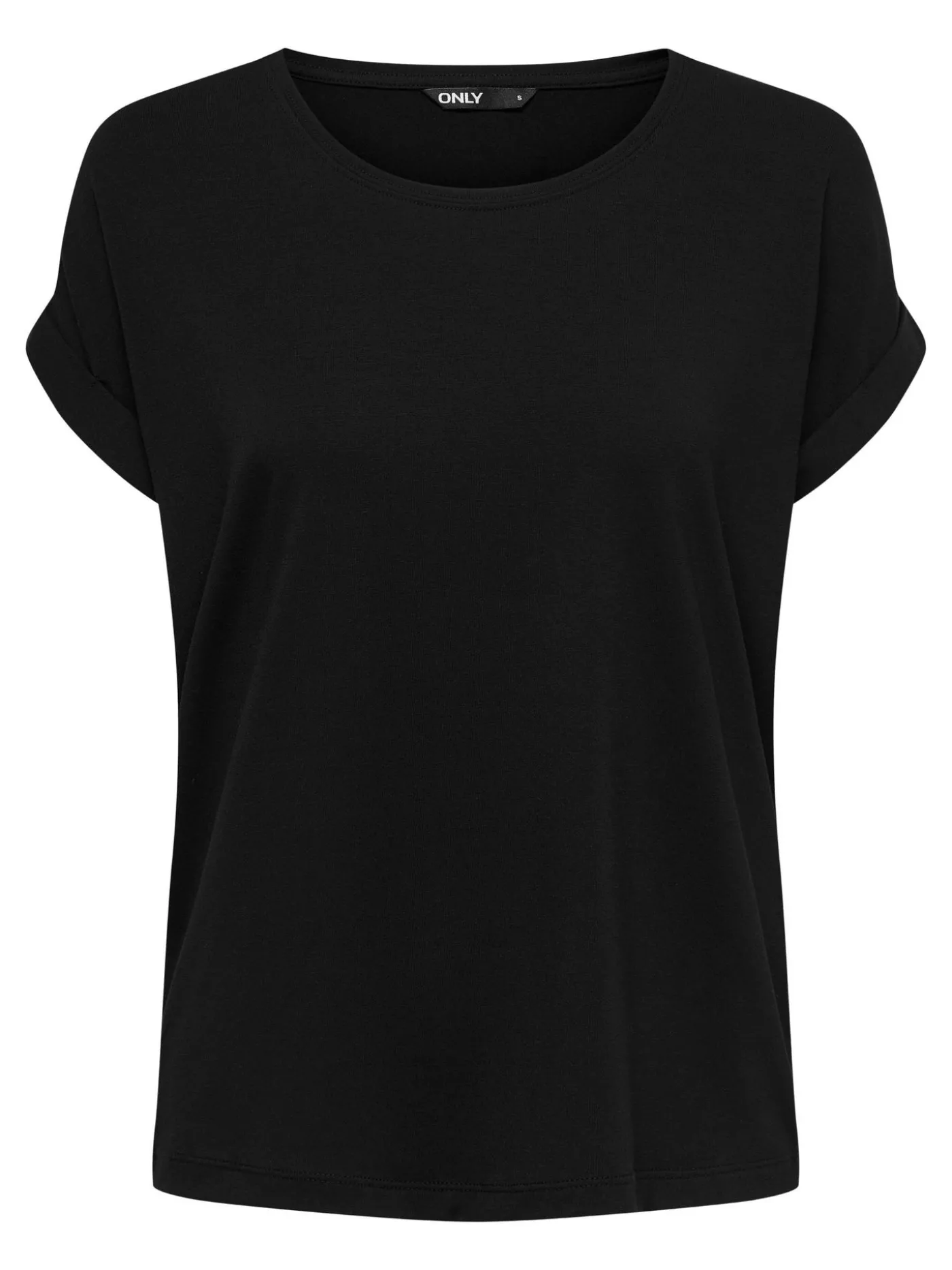 Deze basic zwarte dames top van Only valt wat losser en bevat veel stretch. Dit item heeft korte mouwen en een ronde halslijn. De mouwen zijn omgeslagen en vast gestikt.