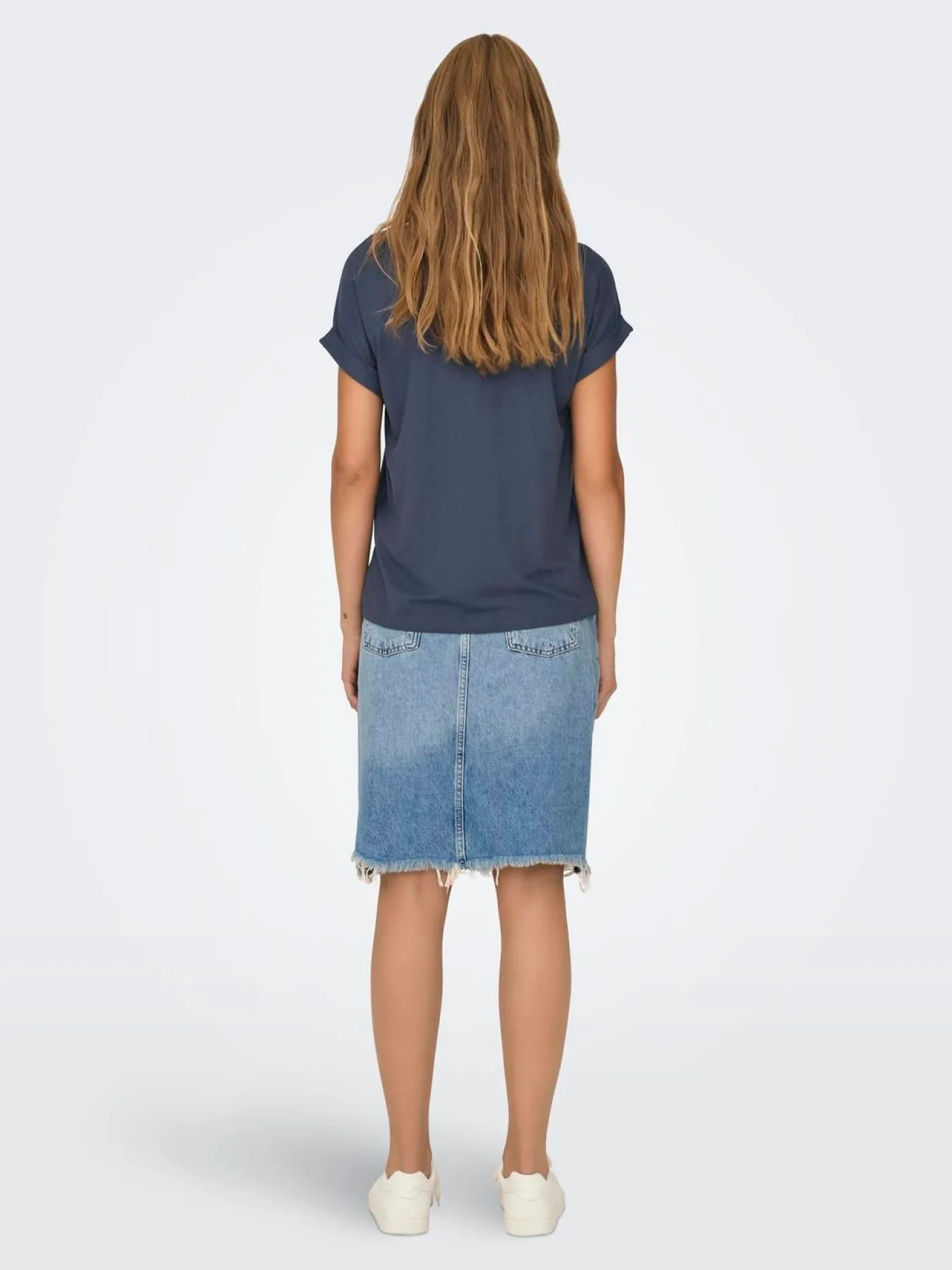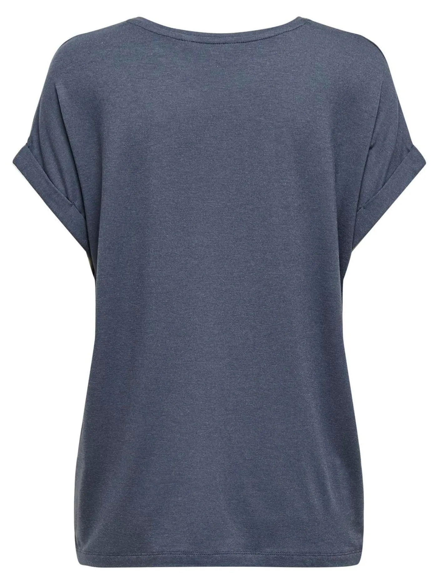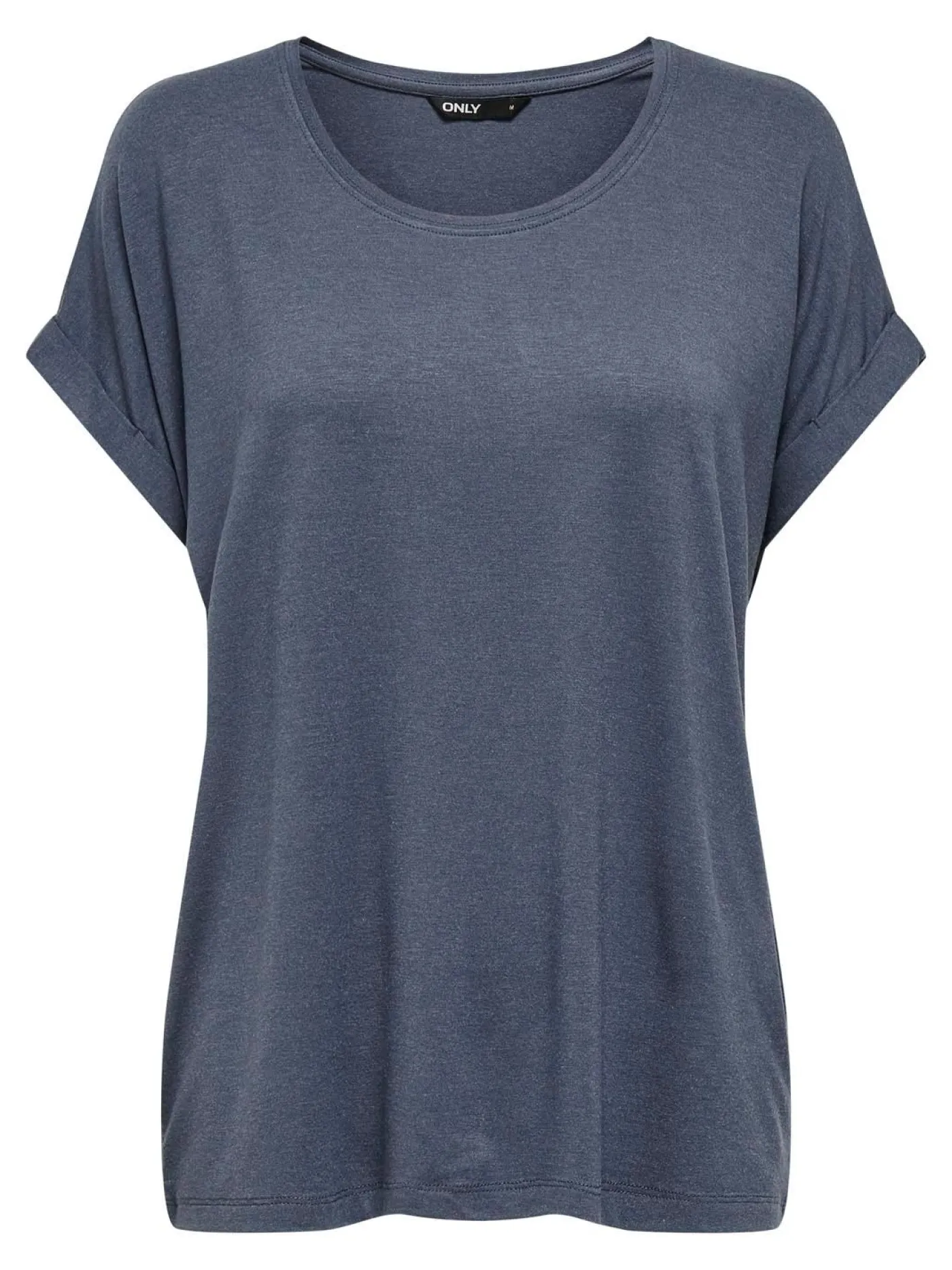Basic blauwe dames top van het merk Only. Dit item valt wat losser en bevat veel stretch. Het shirt heeft korte mouwen en een ronde halslijn. De mouwen zijn omgeslagen en vast gestikt.