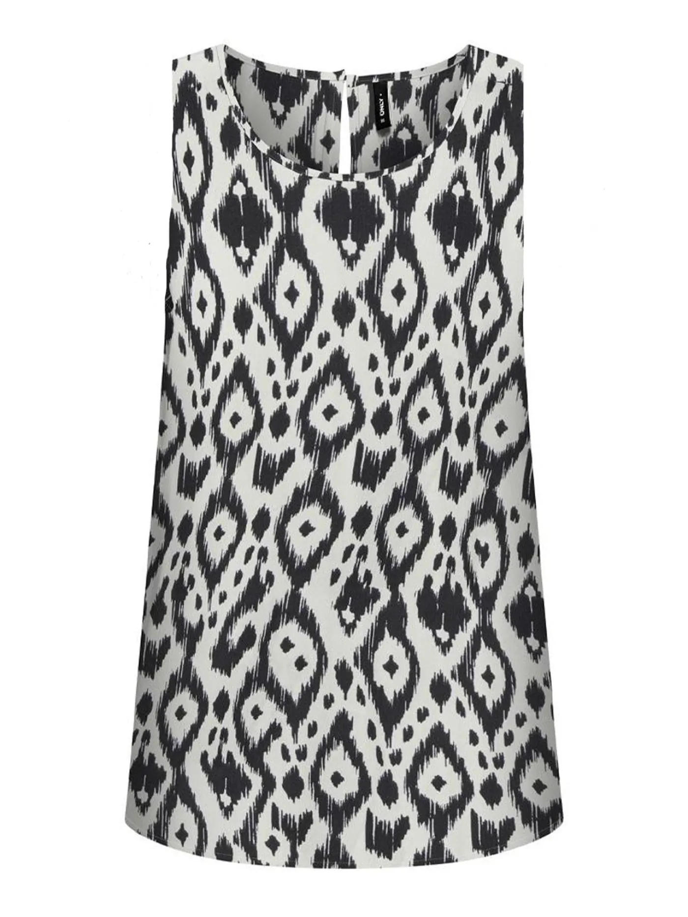 Geef je outfit een moderne en stijlvolle boost met deze dames top met opvallende zwart-witte grafische print. Het abstracte dessin zorgt voor een eigentijdse uitstraling, terwijl de klassieke kleurcombinatie moeiteloos te combineren is met zowel casual als geklede looks.De top is mouwloos en licht van gewicht, met een ronde halslijn en een subtiele knoopsluiting aan de achterkant.Deze top is een perfecte mix van comfort en stijl, een veelzijdige toevoeging aan iedere garderobe.