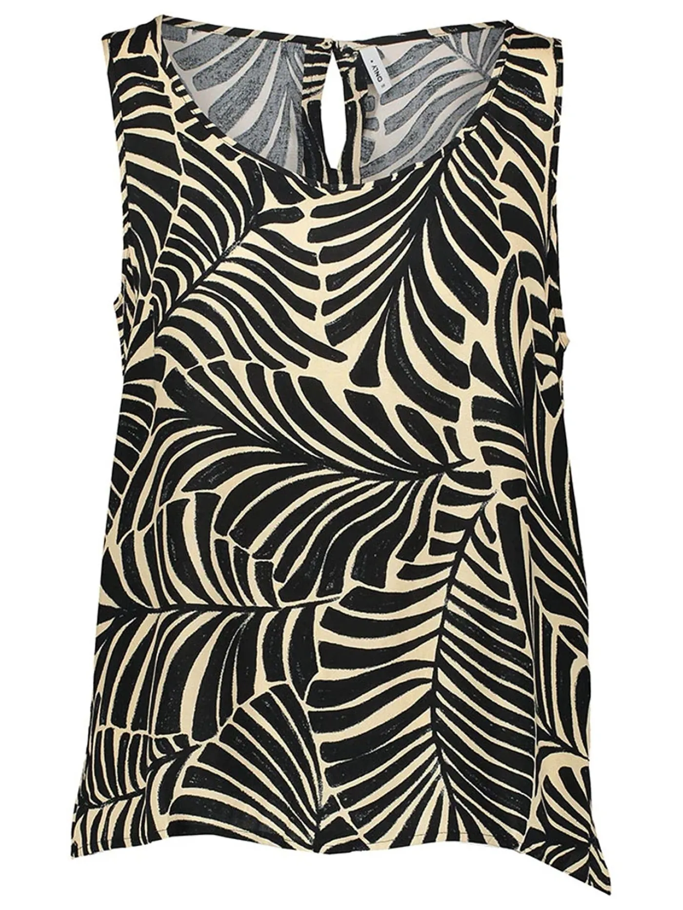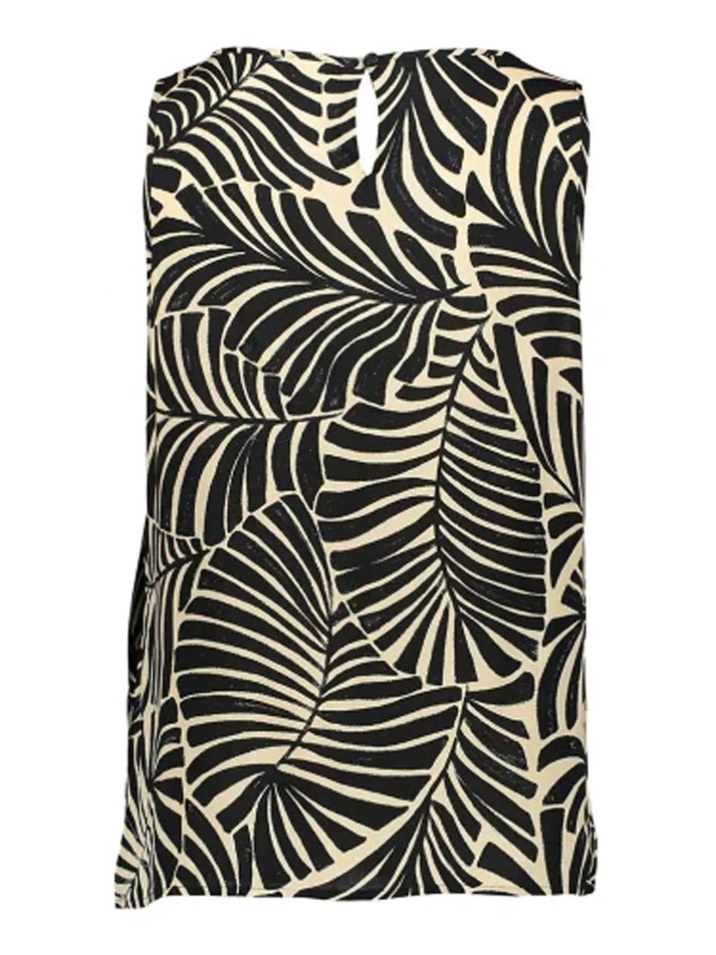 Voeg een tropisch accent toe aan je zomergarderobe met deze stijlvolle dames top met opvallende bladprint. De combinatie van zwart en beige zorgt voor een chique en natuurlijke uitstraling, perfect voor zowel casual als geklede gelegenheden. De top is mouwloos, licht en luchtig, ideaal voor warme dagen of als laagje onder een jasje of blazer. Aan de achterkant zit een subtielkeyhole-detail met knoopsluiting. De soepele stof valt losjes langs het lichaam.Breng een vleugje natuur in je outfit met deze trendy en veelzijdige top!