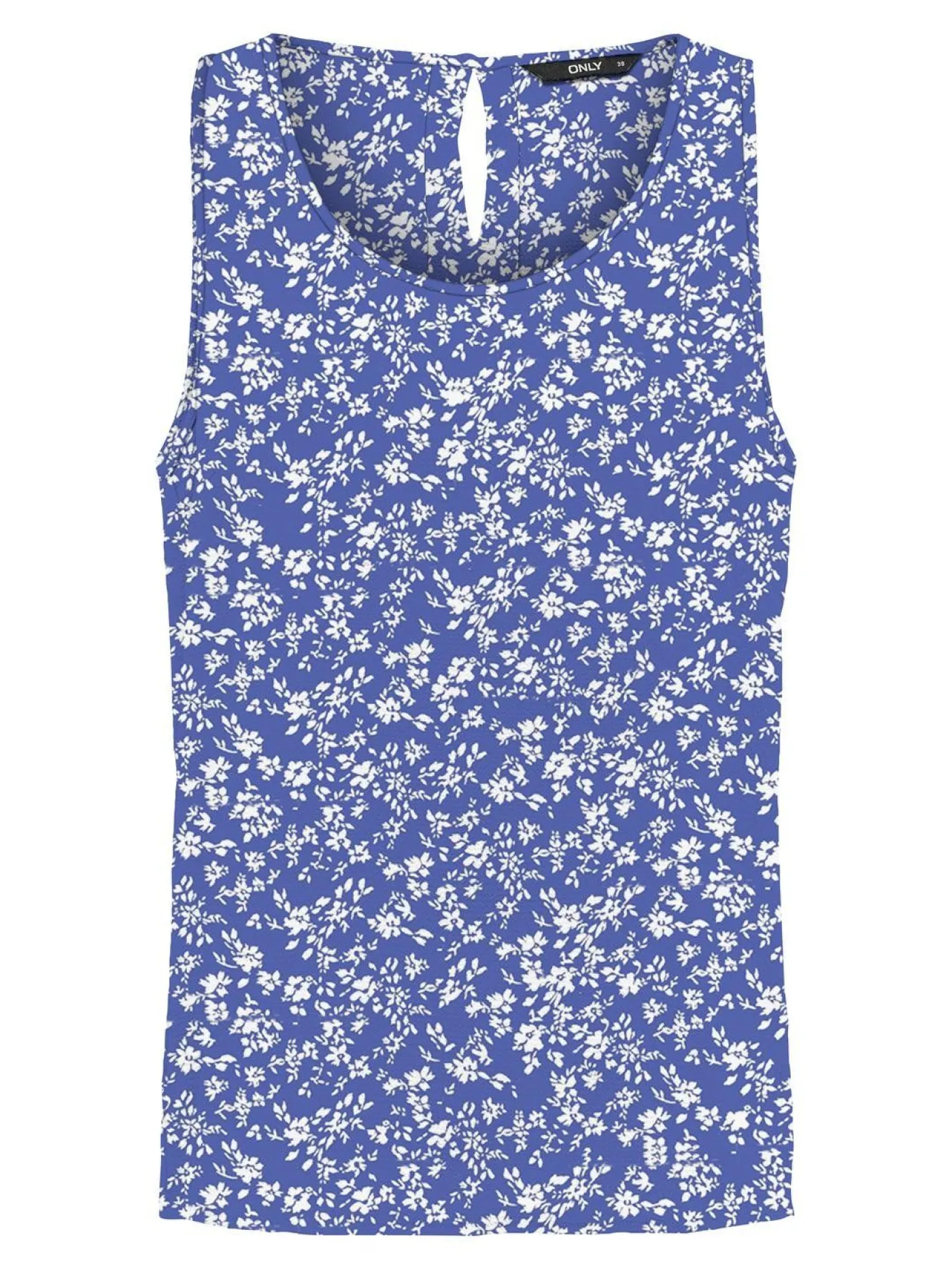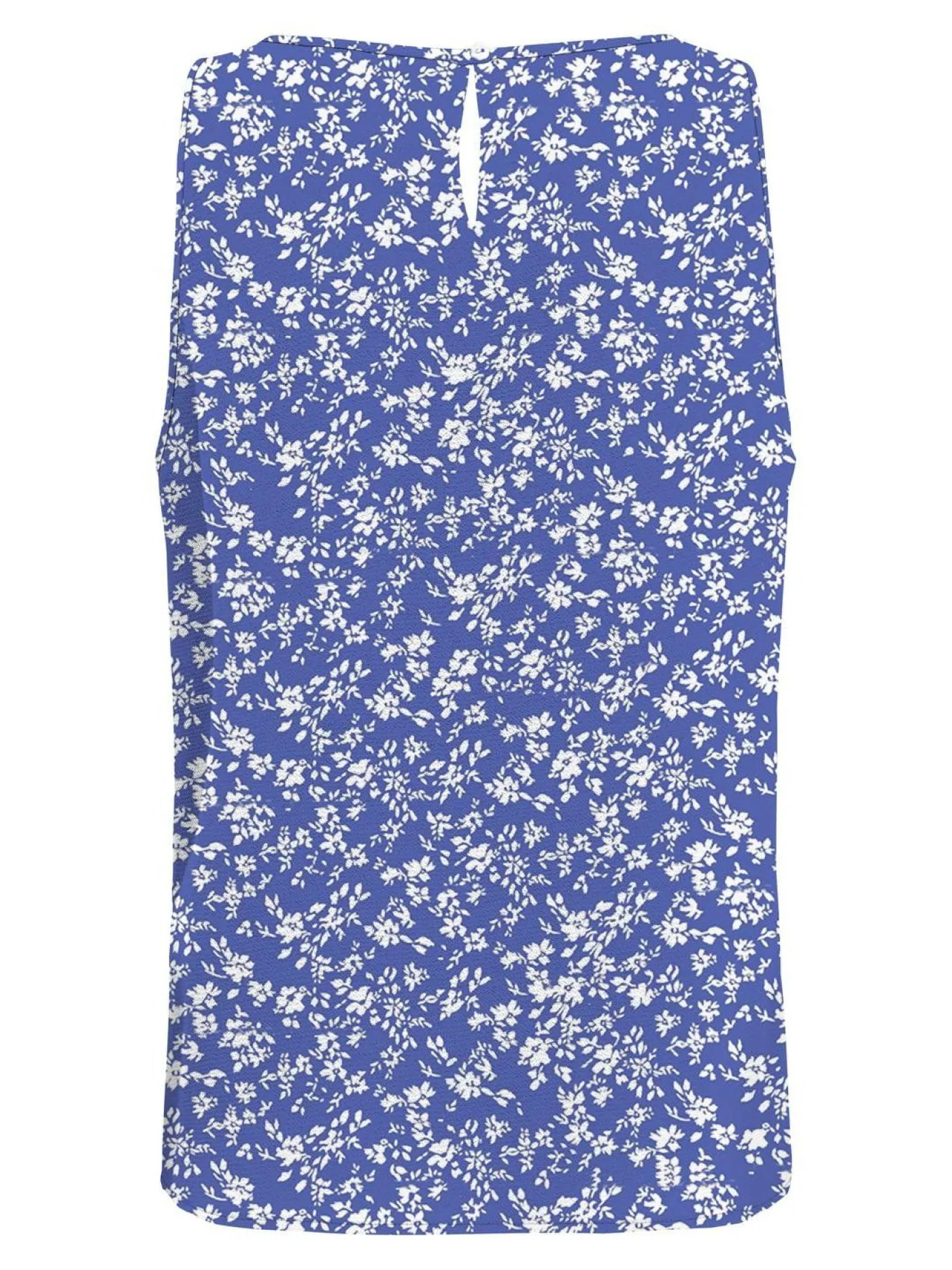 Mouwloze top voor dames van het merk Only. Dit item is donkerblauw en voorzien van een witte all over print. De top heeft een wijde ronde halslijn en valt wat losser. In de nek zit nog een knoopje.