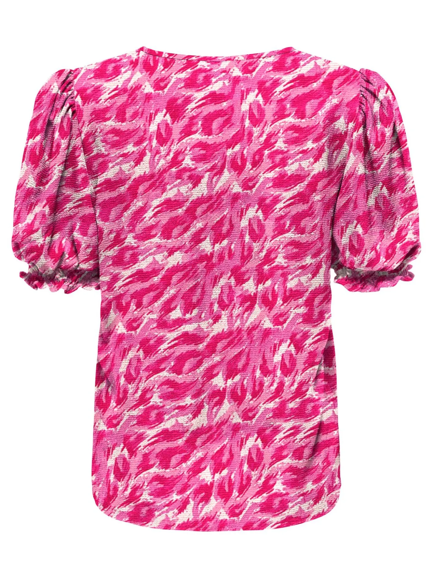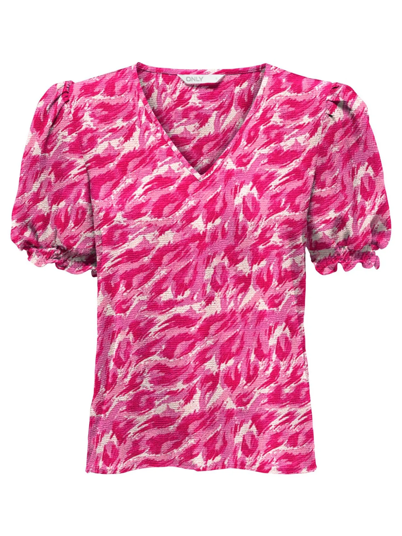 Kleurrijke all-over top met diepe v-hals van het merk Only. Een leuk detail is dat de top pofmouwen heeft. De top is veelzijdig, zo kan je hem aan naar kantoor, maar ook prima voor een dag naar school. Met dit item steel jij de show! Een ultieme top voor de komende zomermaanden.