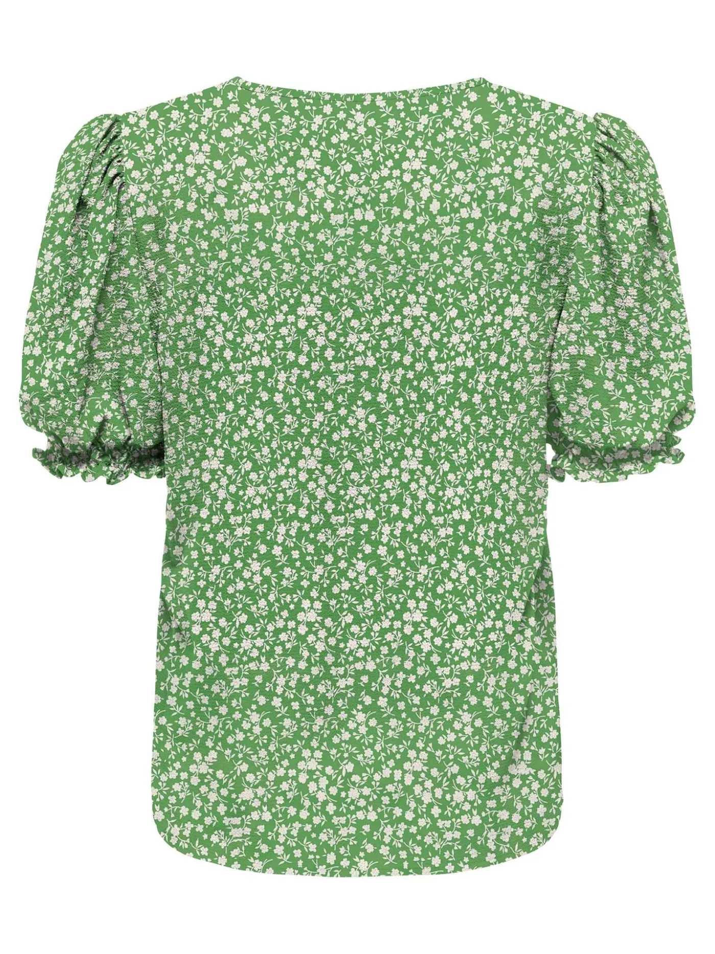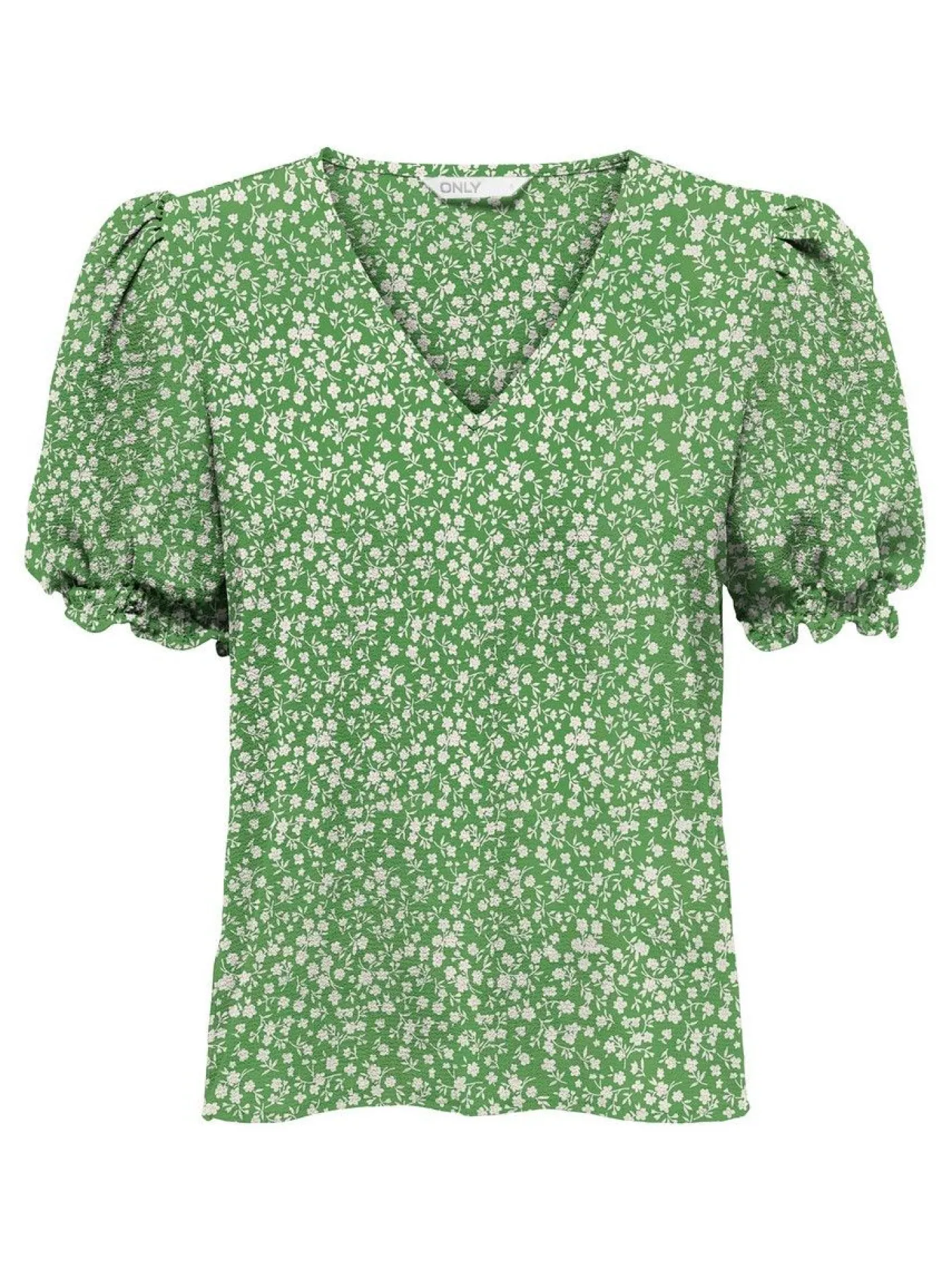 Los vallende top met elastische band aan de uiteindes van de mouwen wat zorgt voor kleine pofmouwtjes. De top heeft een bloemenprint en een v-hals. Leuk te combineren op een witte pantalon/broek.