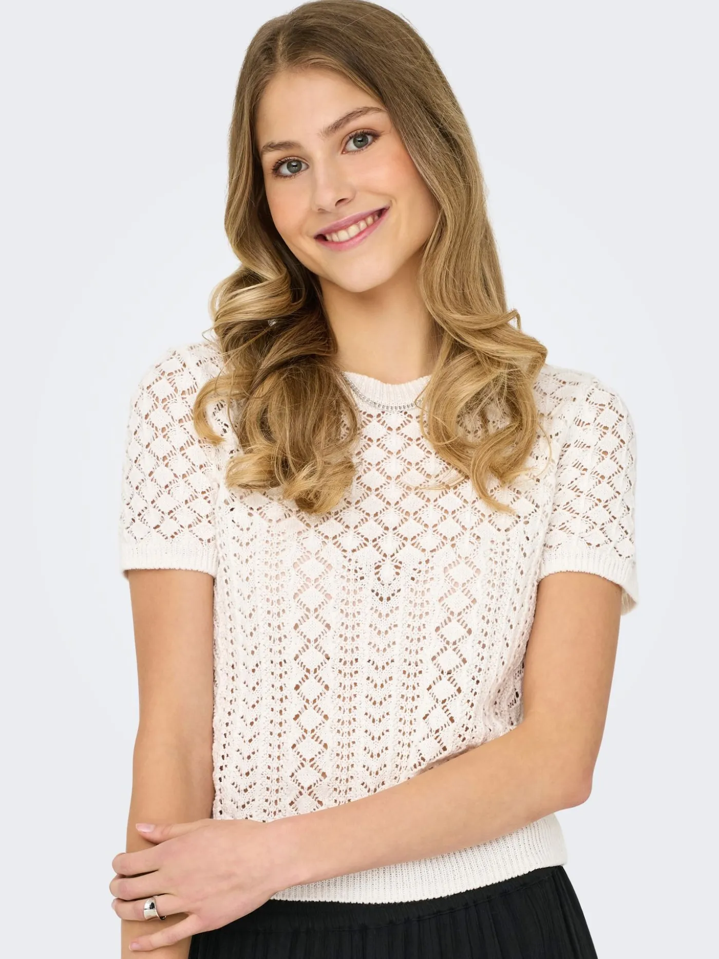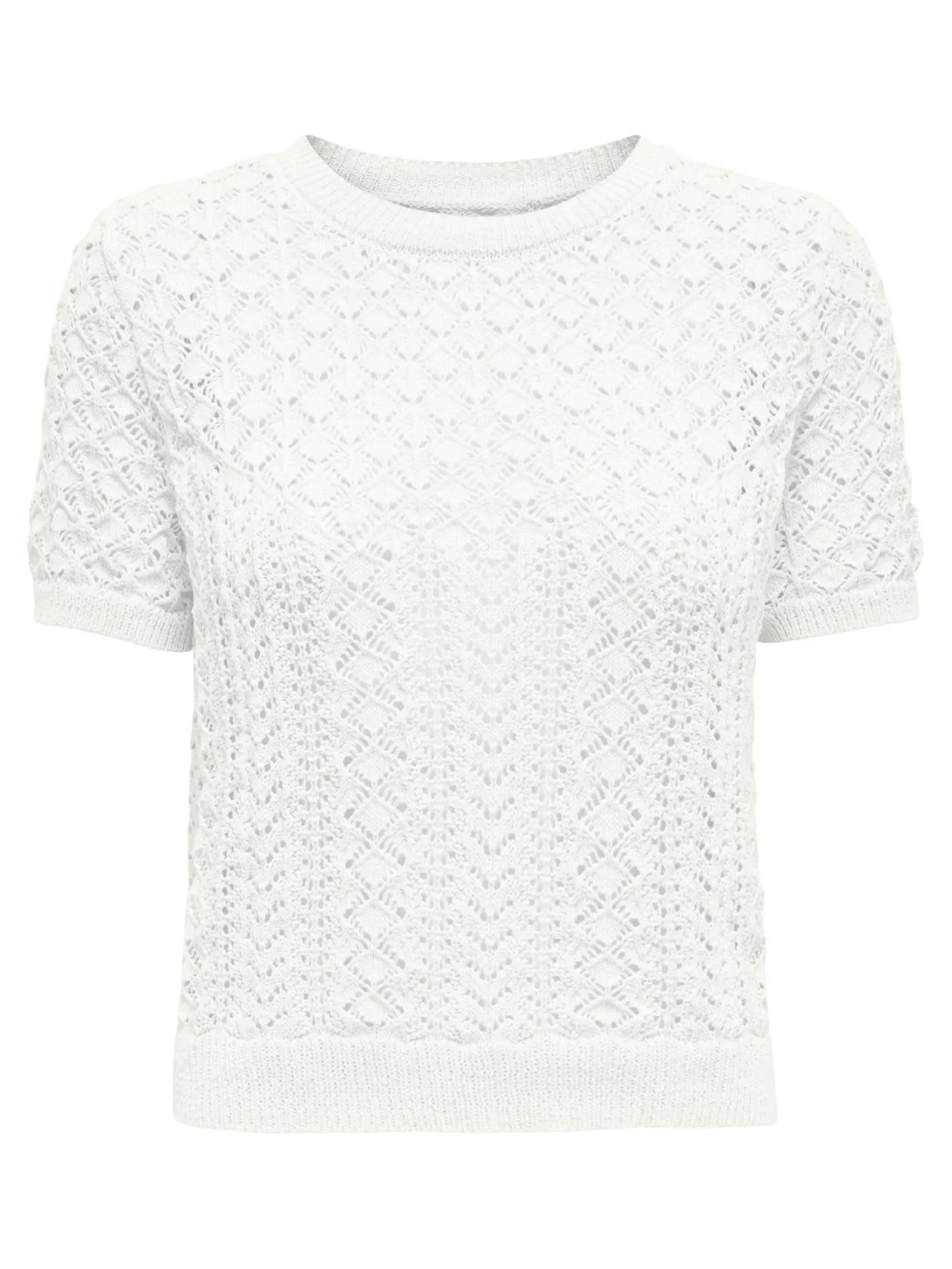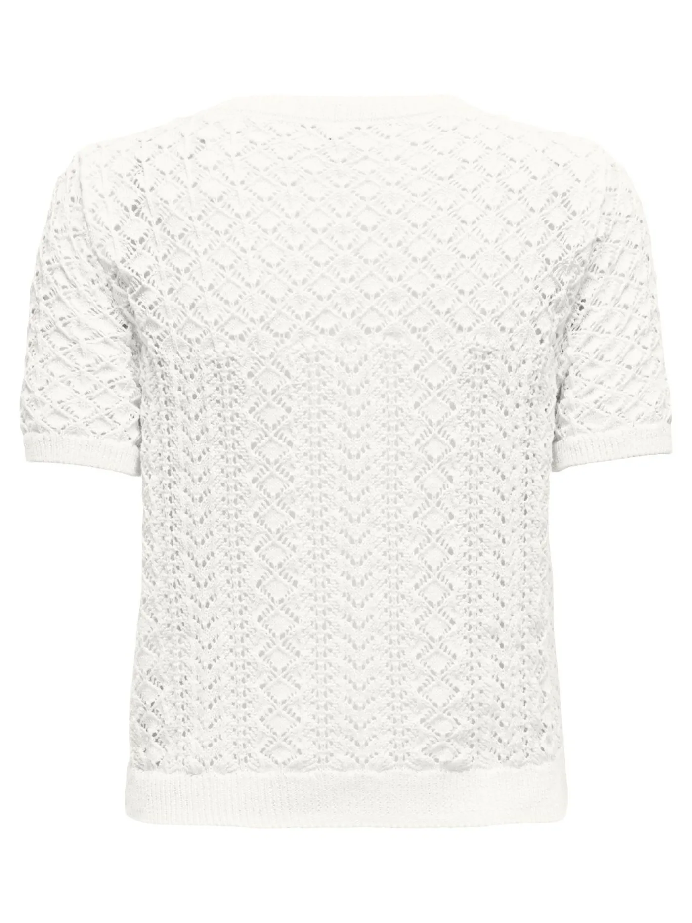 Wit gebreide top met korte mouwen en een ronde halslijn. Deze basic is eindeloos te combineren voor de warmere dagen. Combineer met een jeans of short en sneakers voor een casual lookje.