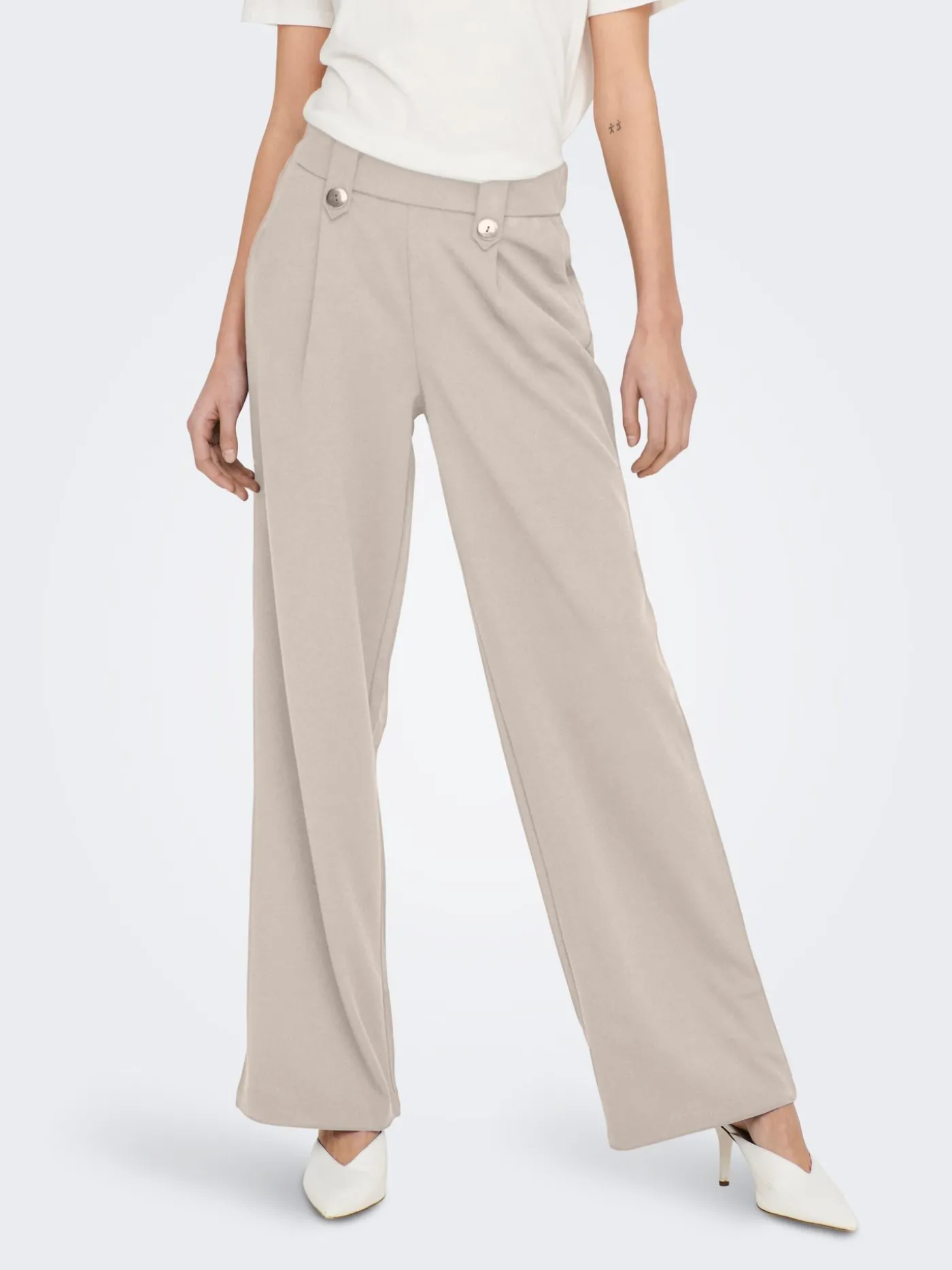 Deze mooie wijdvallende beige pantalon met knopen aan de voorkant is de perfecte basic voor in elke kast. Je kunt de pantalon stijlen met een trui voor een casual look of met een blouse of blazer voor een chique look.