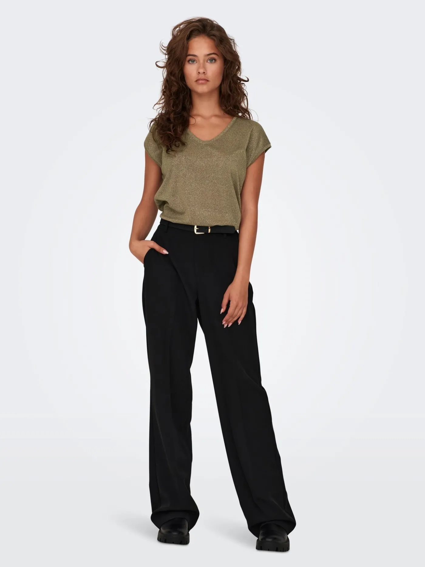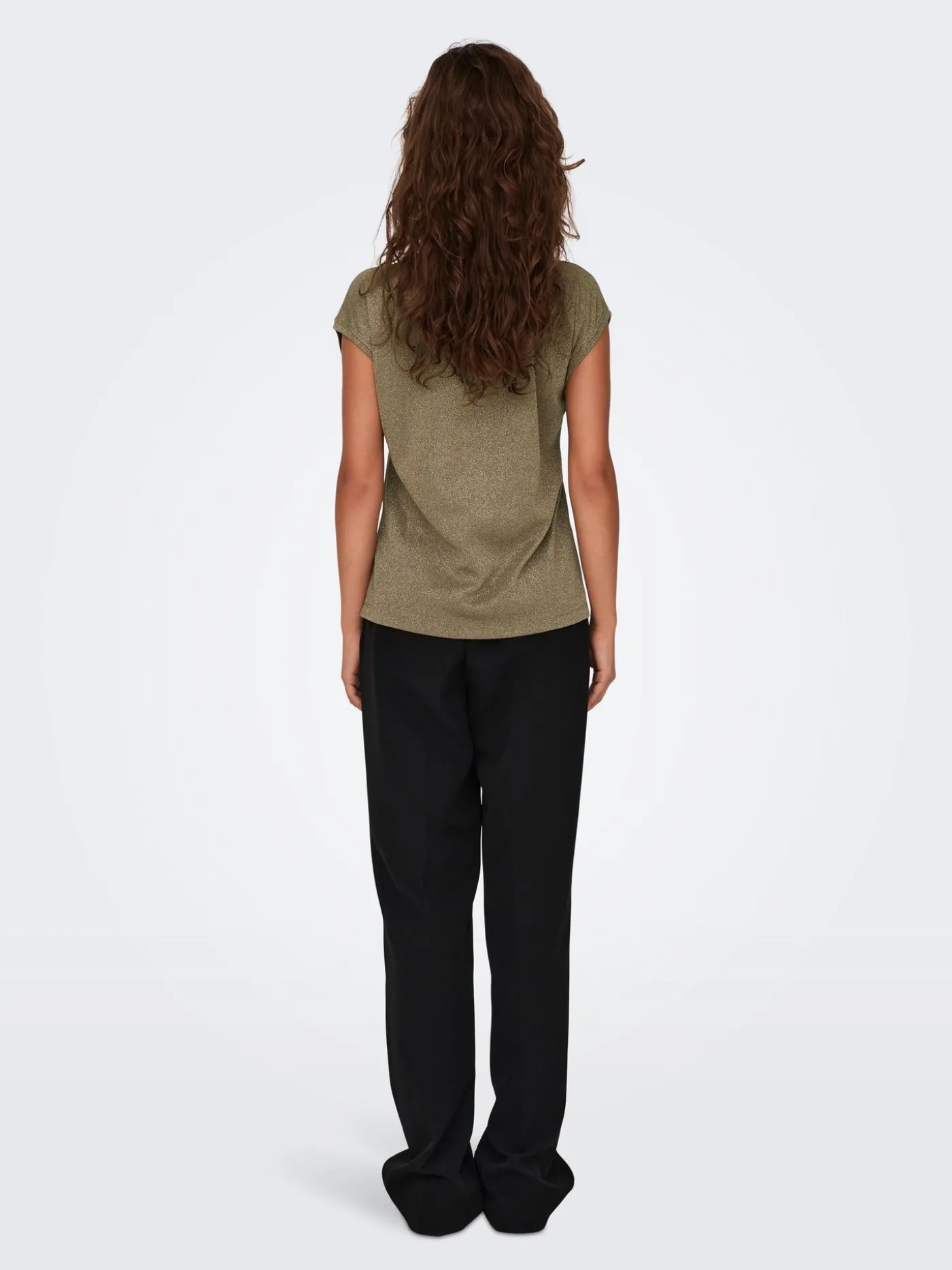Dit topje van Only is in een Goude kleur. Het heeft een Loose fit.Mooie basic top met korte mouwen en een diepe v-hals. De lurex stof met glitters maken de top een echte eye-catcher. Het shirt draagt luchtig en comfortabel. We hebben dit item in meerdere kleuren.