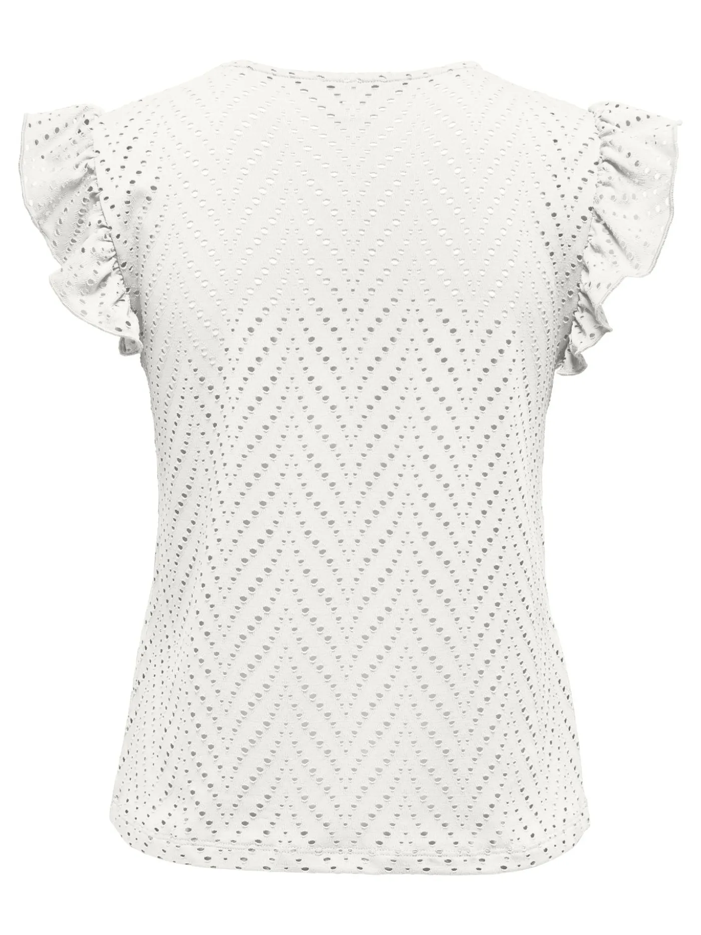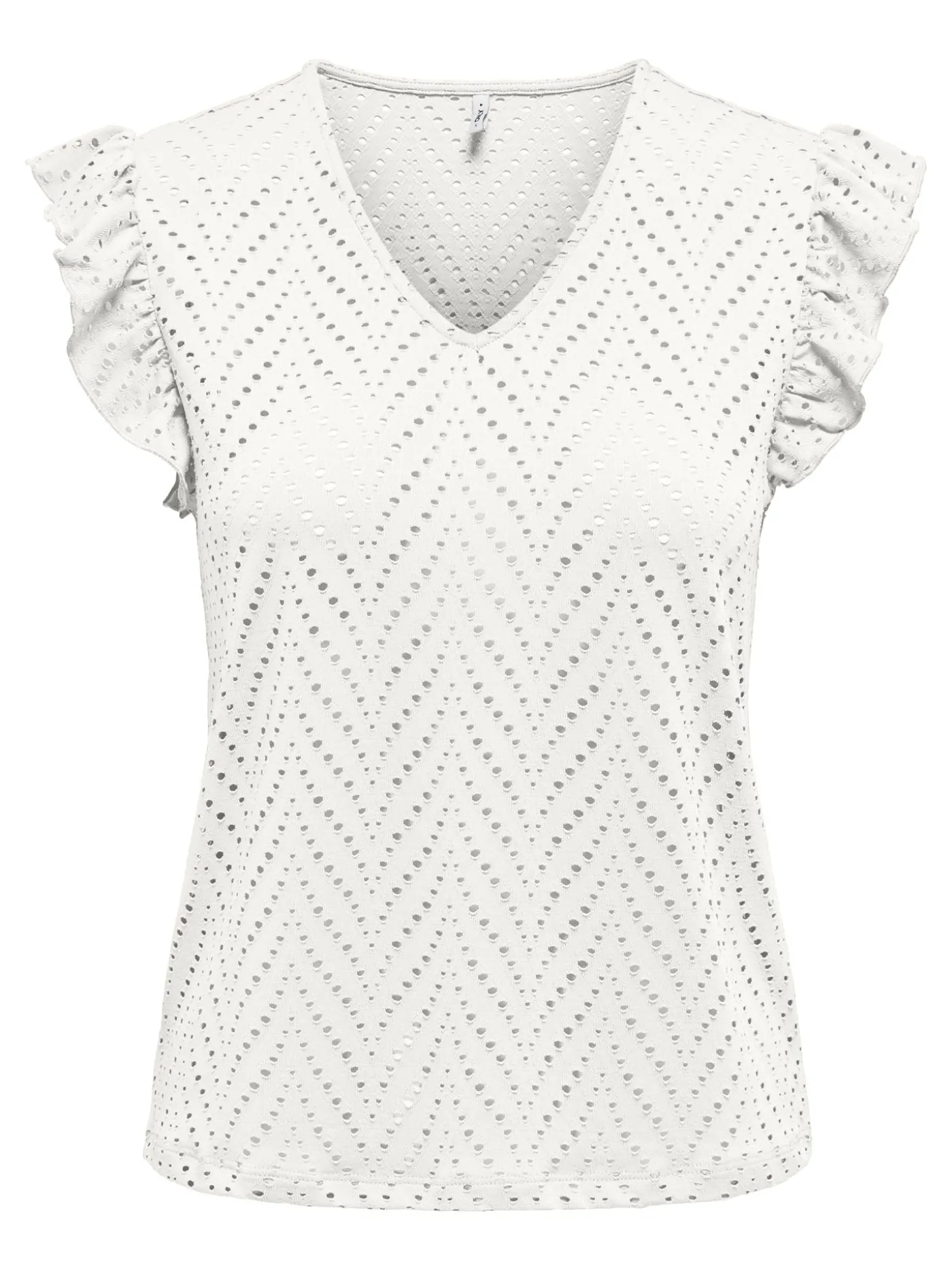 Top van de Only in een witte kleur. Dit item heeft een V-hals, korte mouwen met ruffles en een doorgedrukt rondjes print. Dit item is in meerdere kleuren verkrijgbaar.
