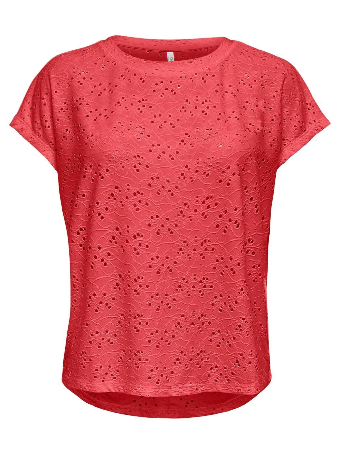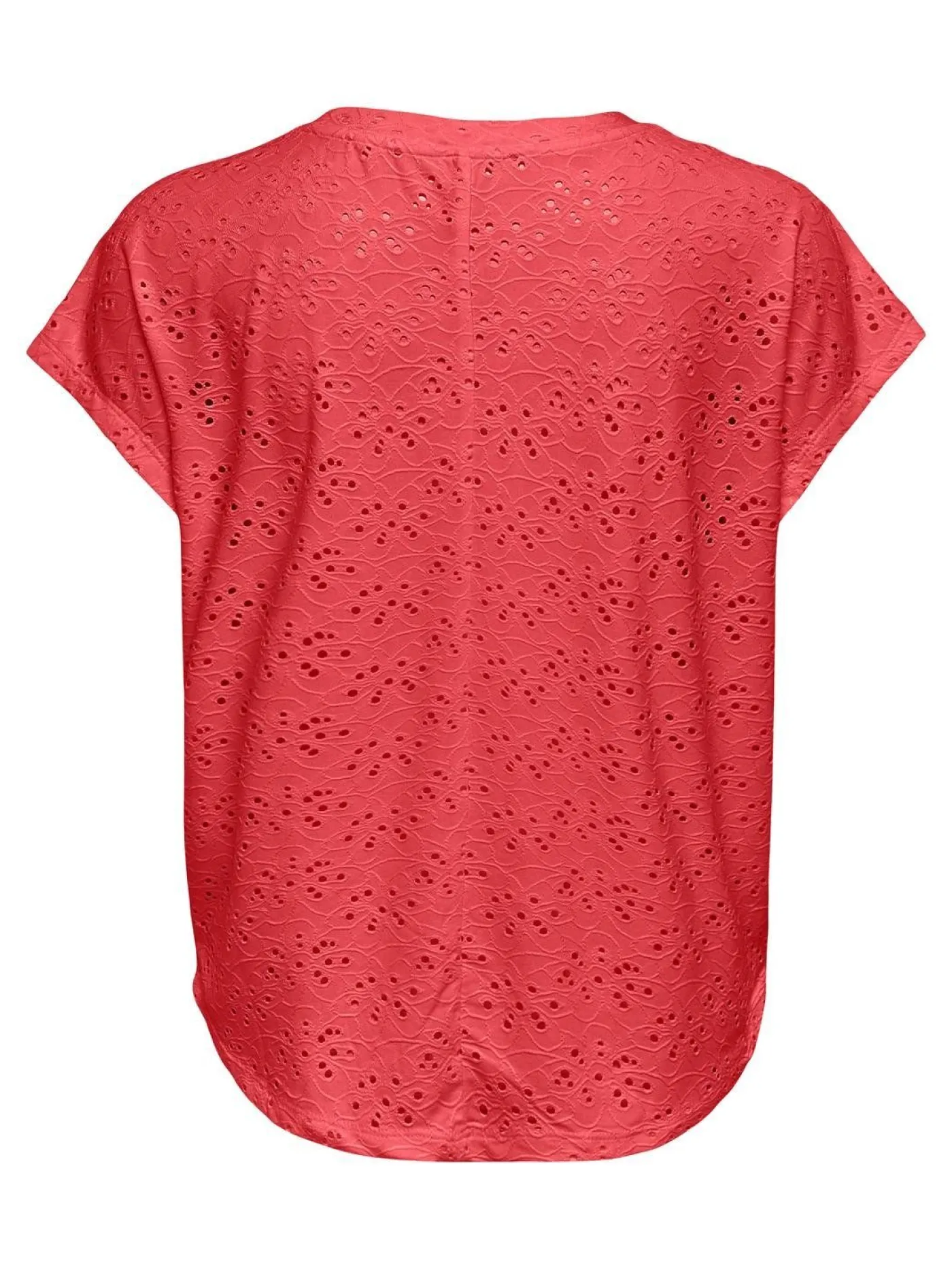 Broderie top van het merk Only. De top heeft korte kapmouwtjes en een ronde hals. Dit item is verkrijgbaar in meerdere kleuren.