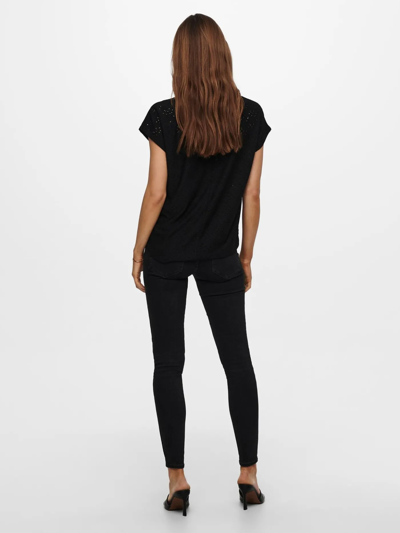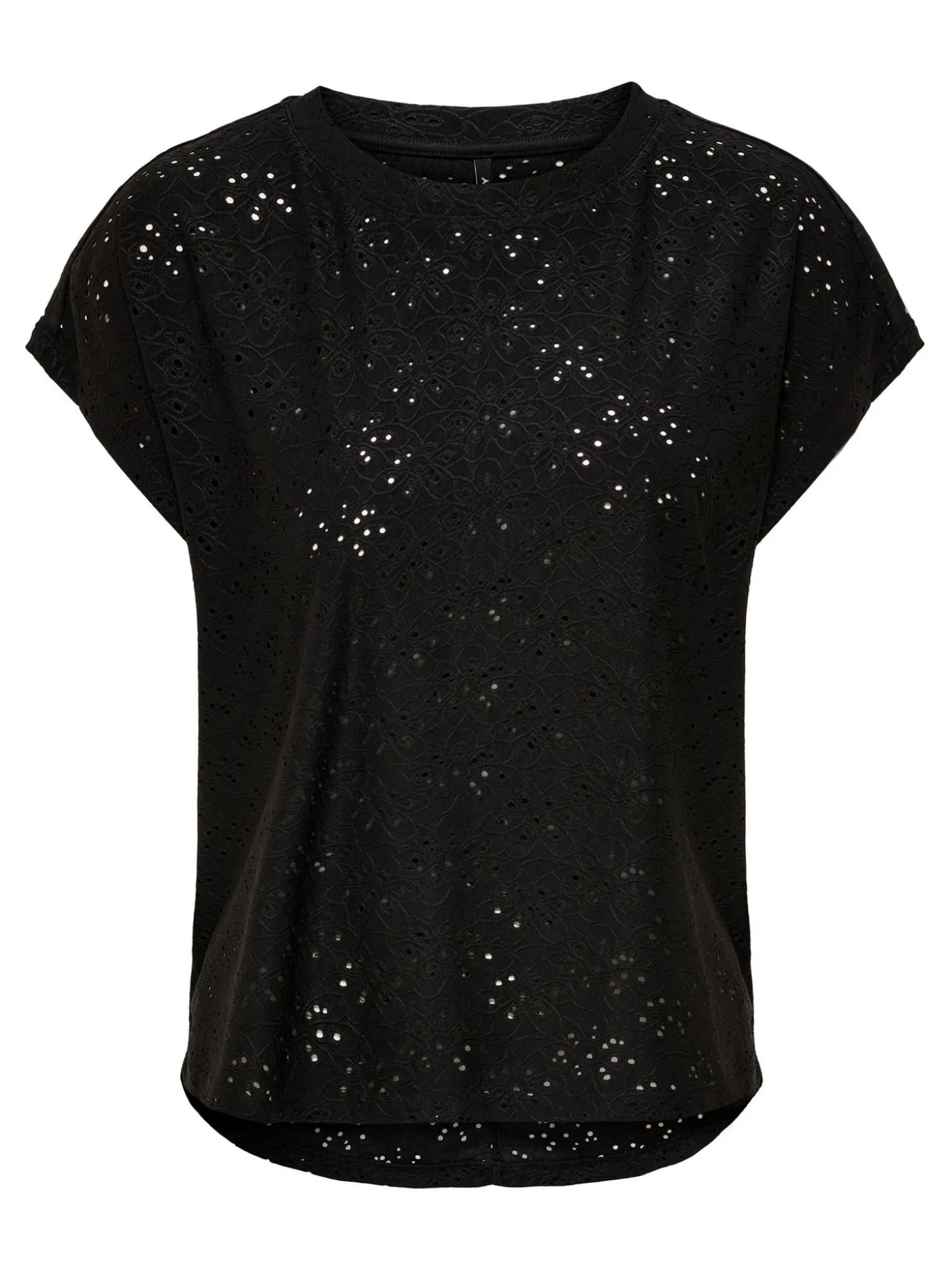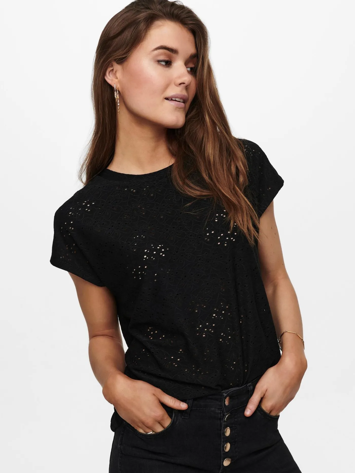 Zwarte Broderie top van het merk Only. De top heeft korte kapmouwtjes en een ronde hals. Dit item is verkrijgbaar in meerdere kleuren.