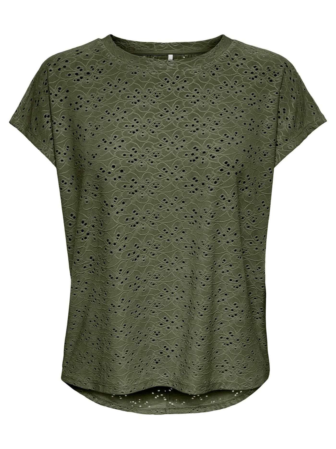 Groene Broderie top van het merk Only. De top heeft korte kapmouwtjes en een ronde hals. Dit item is verkrijgbaar in meerdere kleuren.
