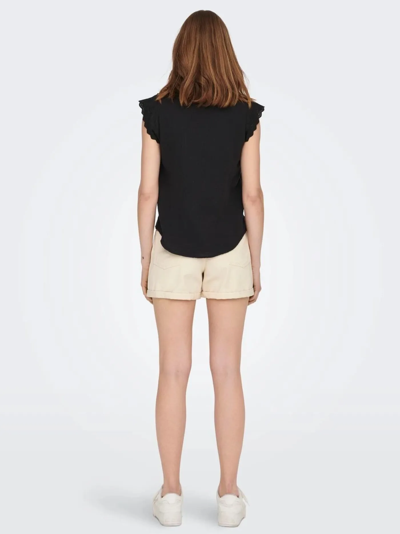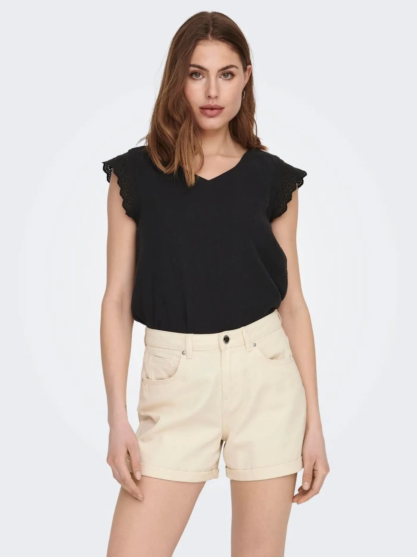 Leuke top van Only in de kleur Zwart. Dit item heeft een V-hals en kapmouwtjes met broderie details. De top is gemaakt van katoen en draagt zeer comfortabel.