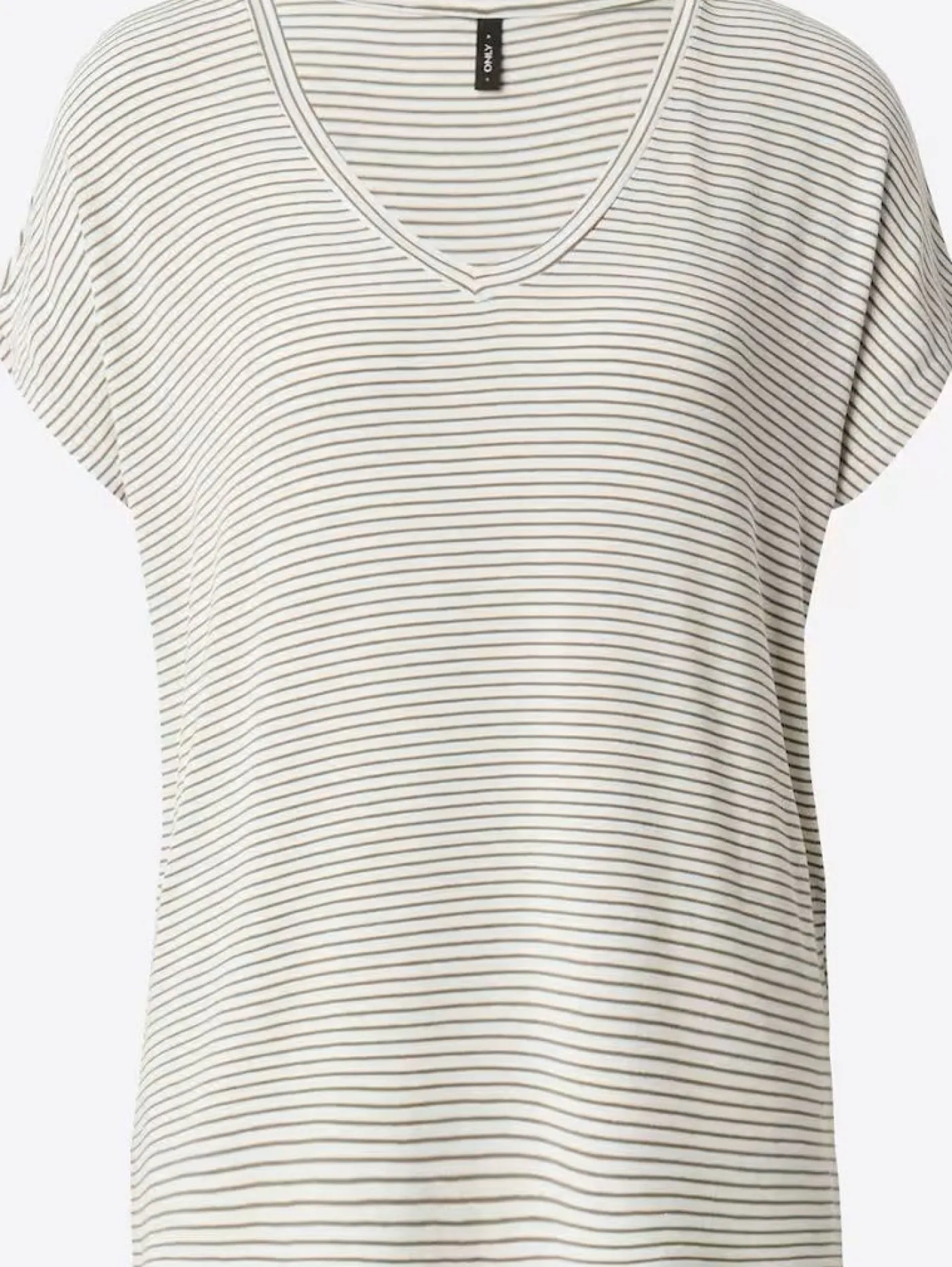 Dit toffe basic t-shirt is onderdeel van de nieuwste collectie van Only. Het shirt heeft een v-hals en korte mouwen. Het shirt is wit met olijfgroene strepen en is gemaakt van een zachte comfortabele stof. Je kunt dit shirt combineren met een jeans of bijvoorbeeld deOnly poptrashbroek in de matchende kleur.