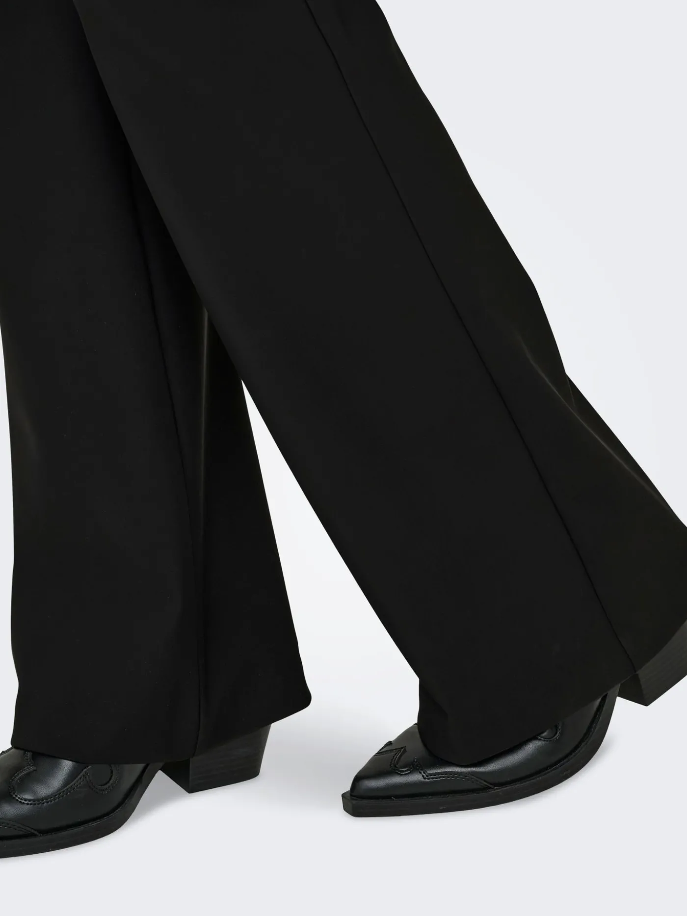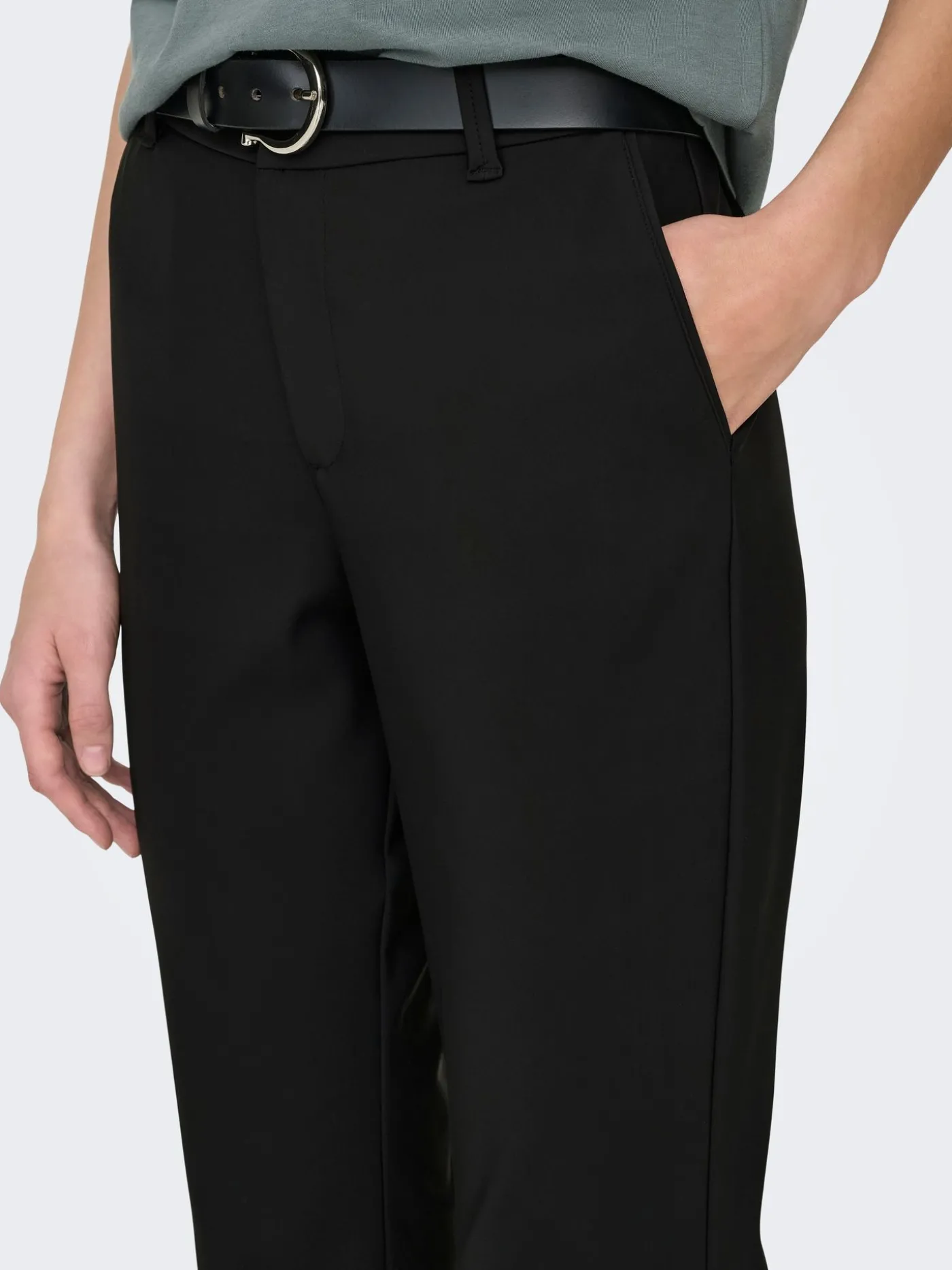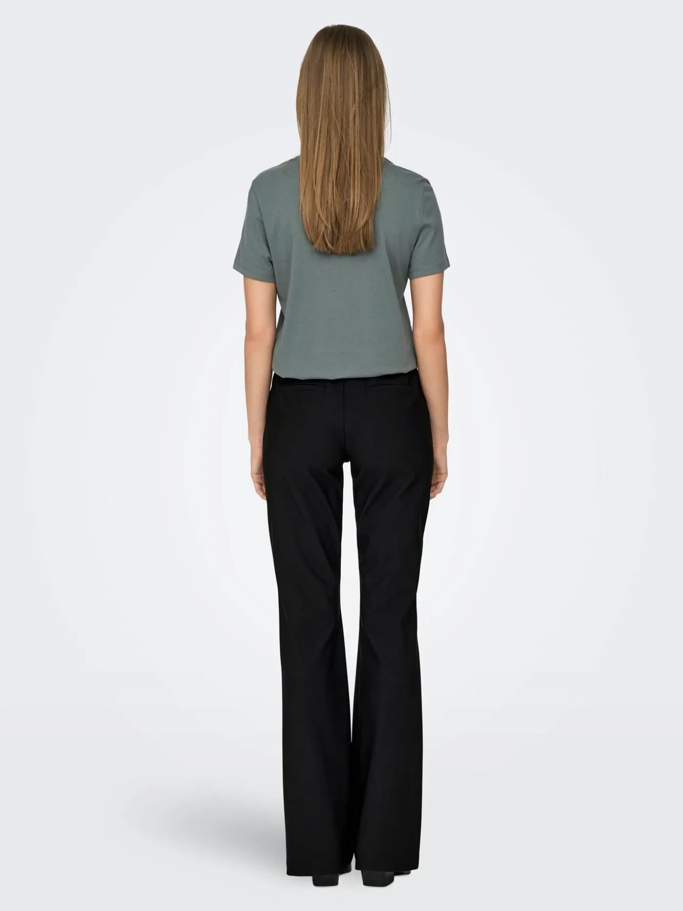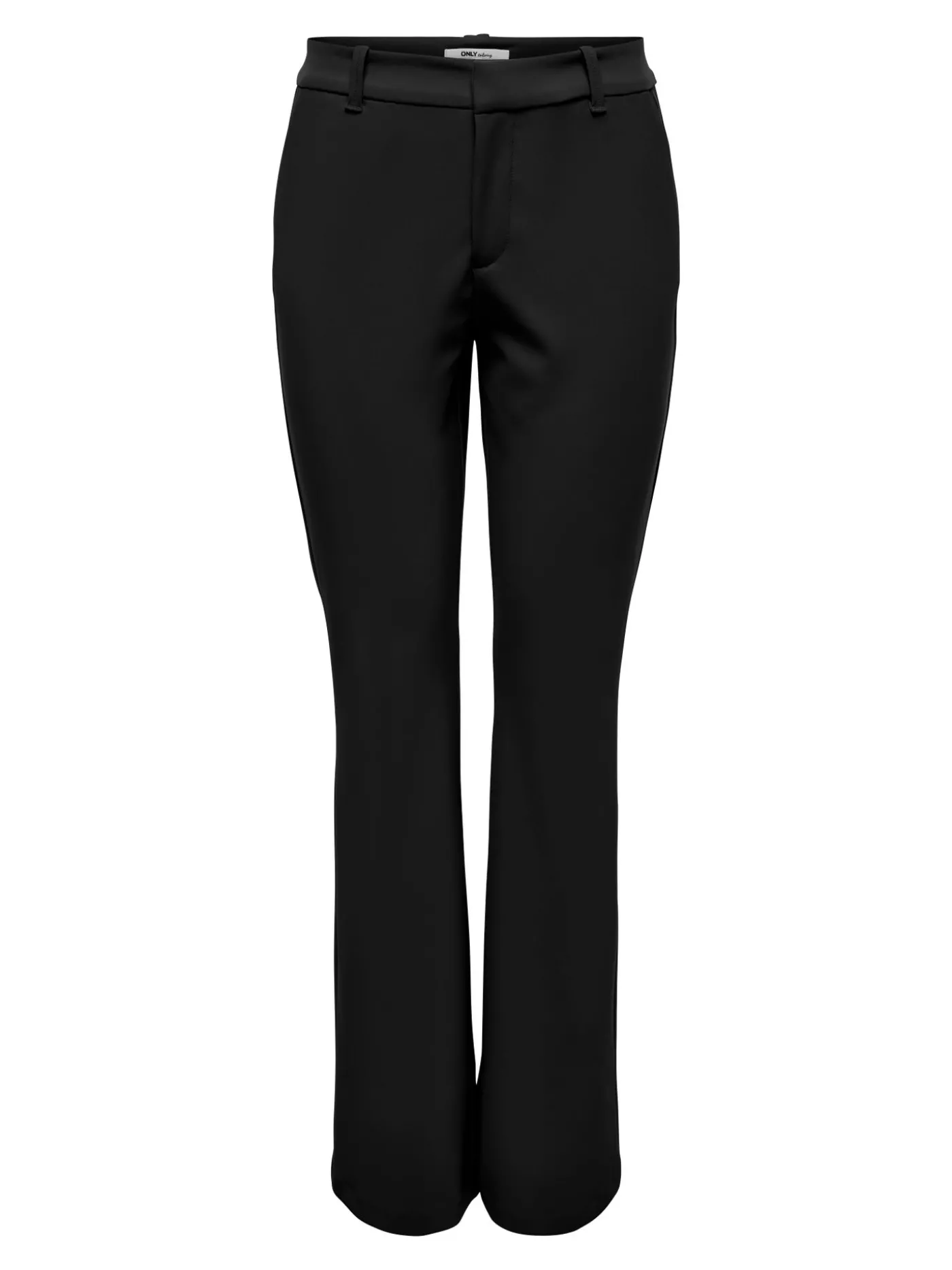 Deze zwarte pantalon van Only voor dames heeft een flatterende flared fit die zorgt voor een elegante en moderne look. De broek sluit met een knoop en ritssluiting en is gemaakt van een soepele stof die comfortabel aanvoelt. Perfect voor zowel een nette outfit als een casual-chique stijl. Combineer met een blouse of blazer voor een complete look.