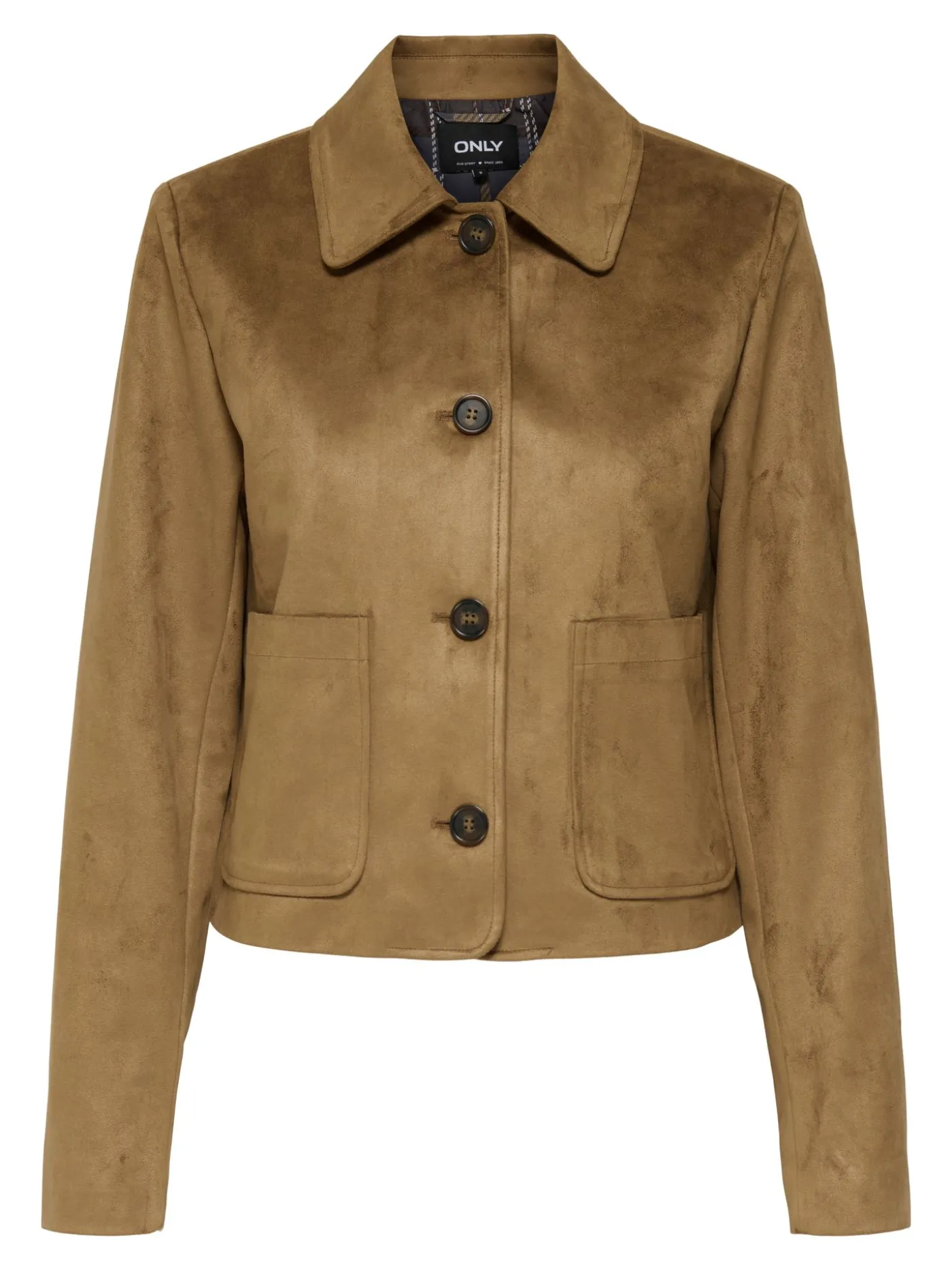 Deze jas van het model ONLY ONLTULIP LIFE FAUX SUEDE JACKET OTW is uitgevoerd in een warme bruine kleur (cognac‑ton). Het materiaal heeft een suede‑look die zacht oogt en een luxe gevoel geeft. De jas heeft lange mouwen, een normale lengte en een klassieke reverskraag, wat zorgt voor een nette uitstraling. De regular fit maakt ‘m comfortabel om te dragen bij zowel een casual als iets nettere outfit, ideaal voor alledaags gebruik in het tussenseizoen.
