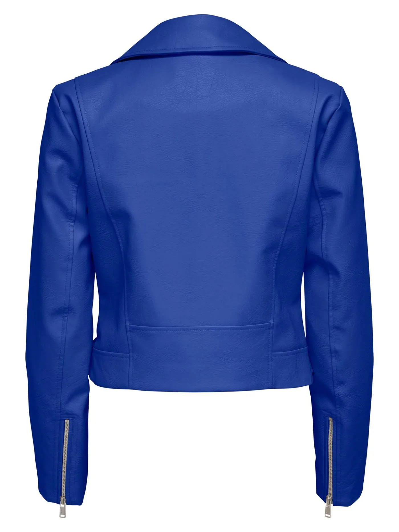 Een stoer bikerjasje bestaande uit imitatieleer met een asymmetrische ritssluiting in de kleur kobalt. Een hippe, stoere jas met twee ritssluitingen aan de zijkant en een riem met gesp aan de voorzijde. Je steelt de show met deze kobalt-kleurige jas.
