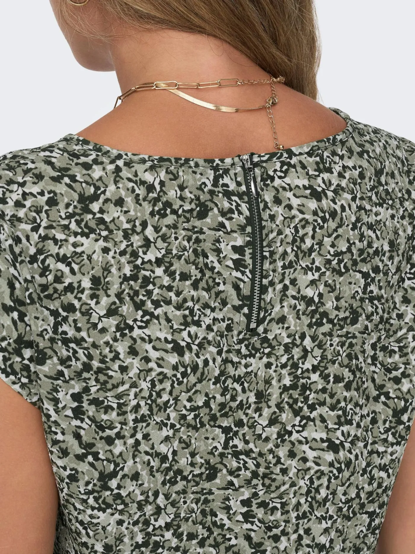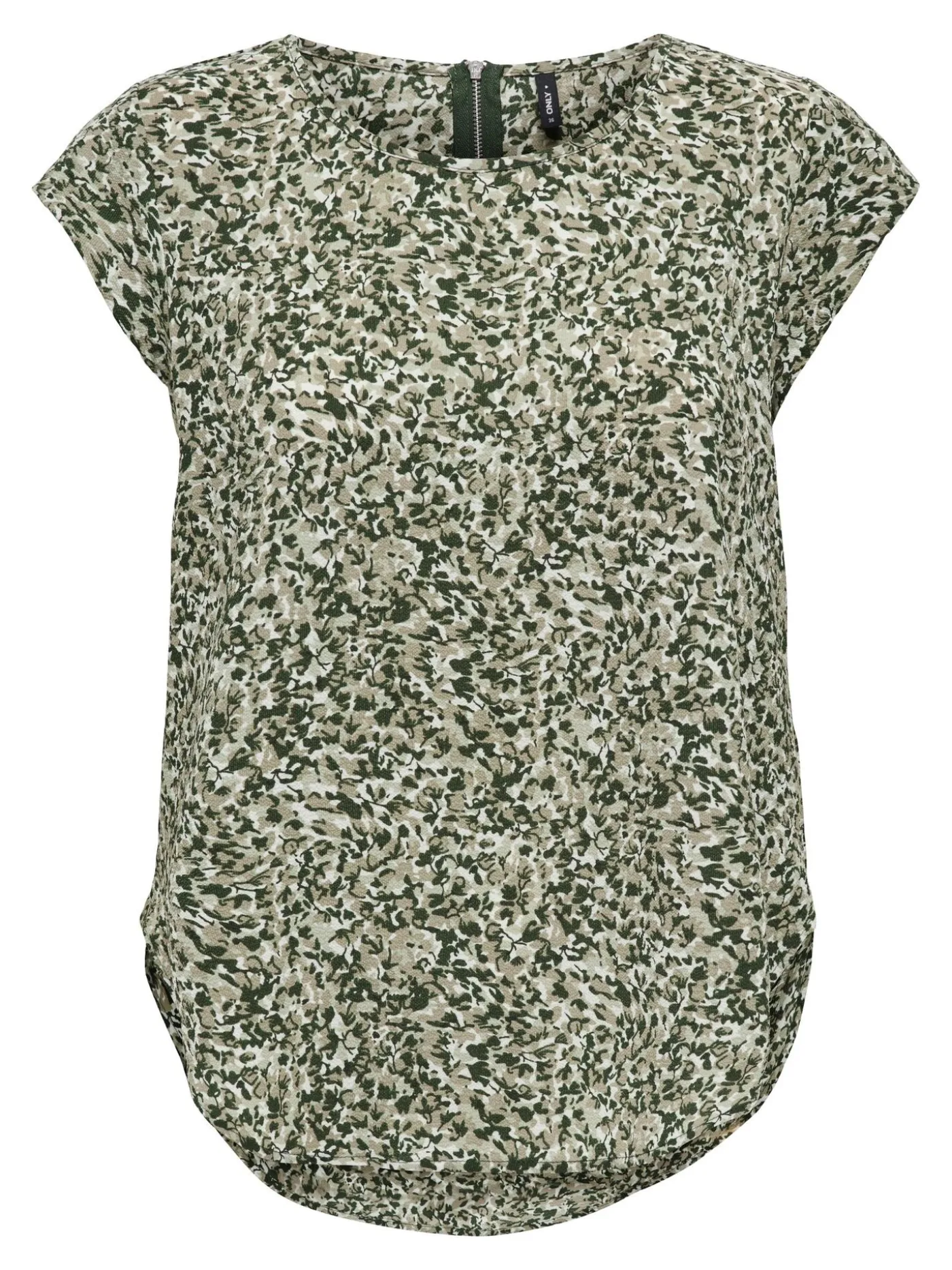 Wijdvallende groene top van Only met een ronde halslijn en korte mouwtjes. De top is voorzien van een all over print en heeft op de rug een ritssluiting.