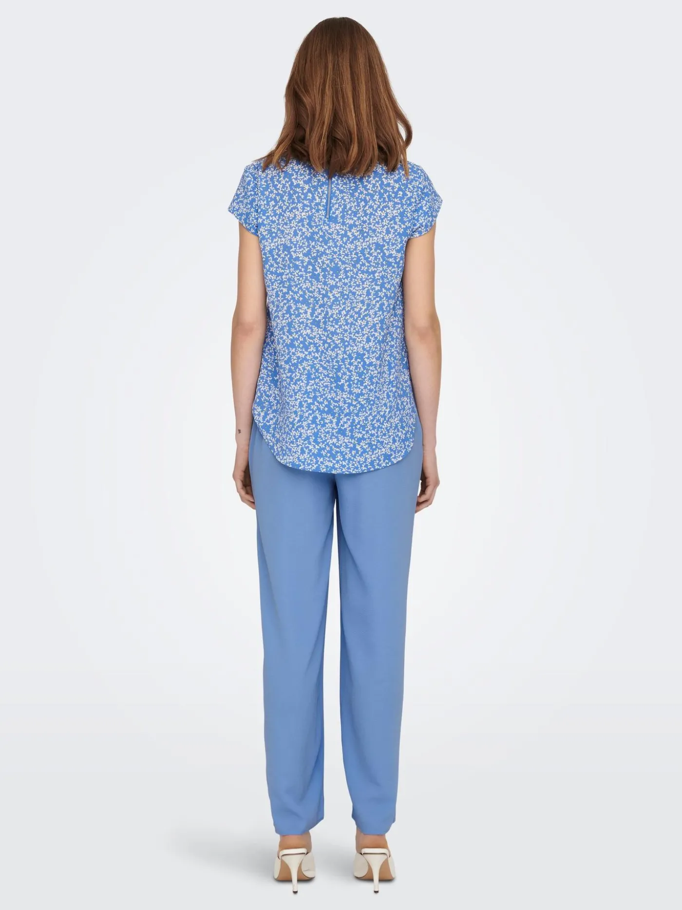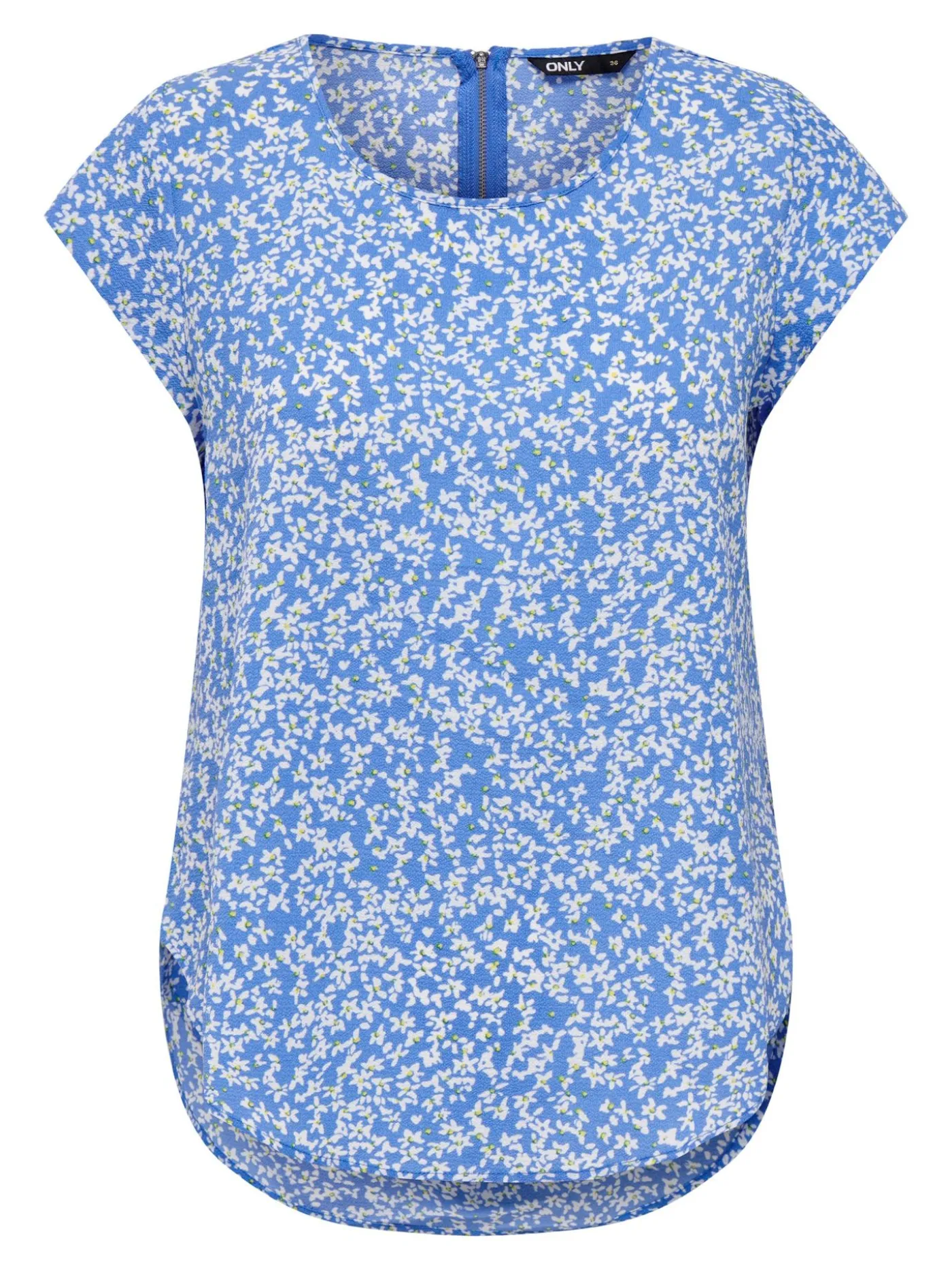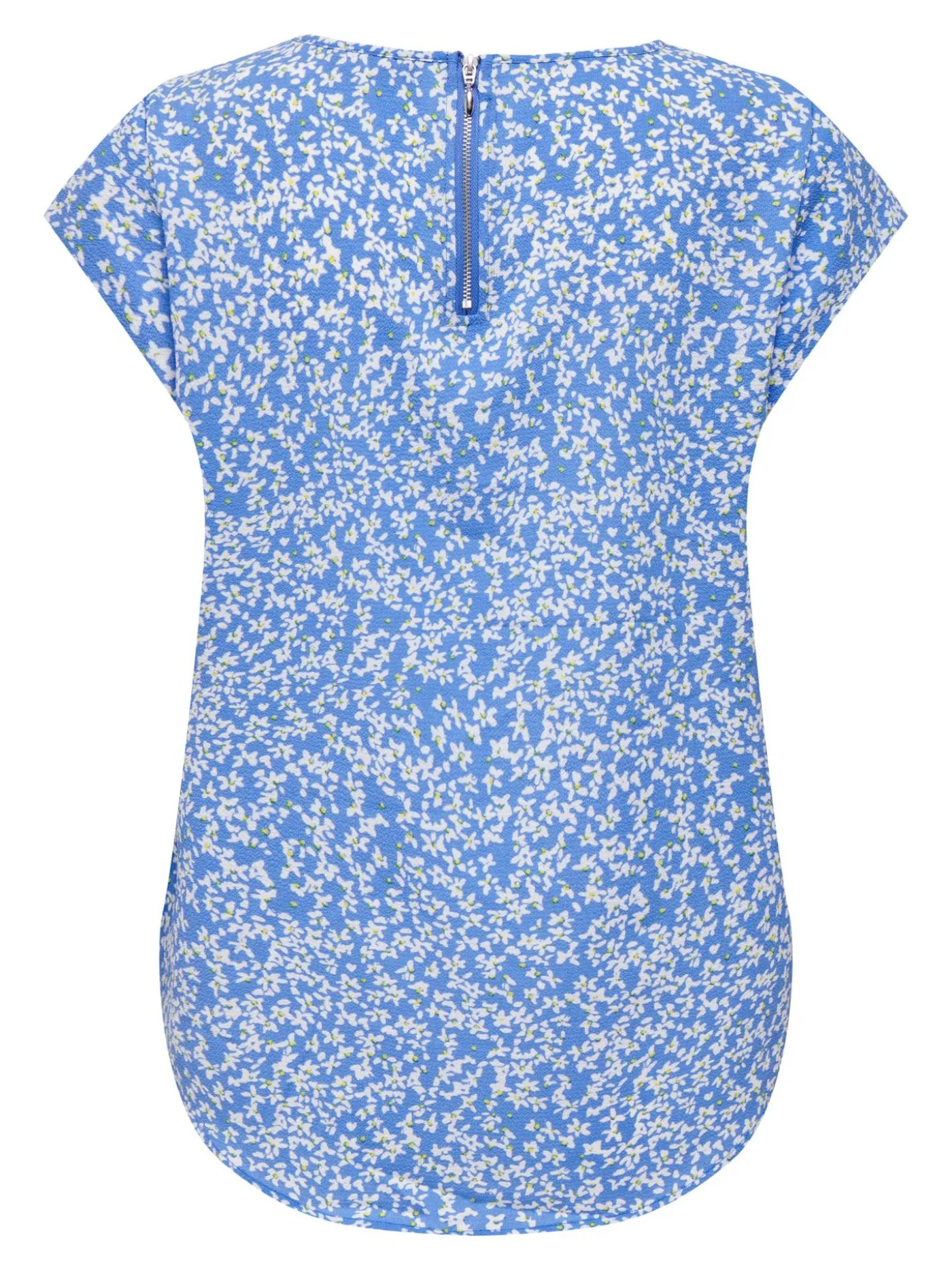 Wijdvallende lichte top van Only met een ronde halslijn en korte mouwtjes. De top is voorzien van een all over print en heeft op de rug een ritssluiting.