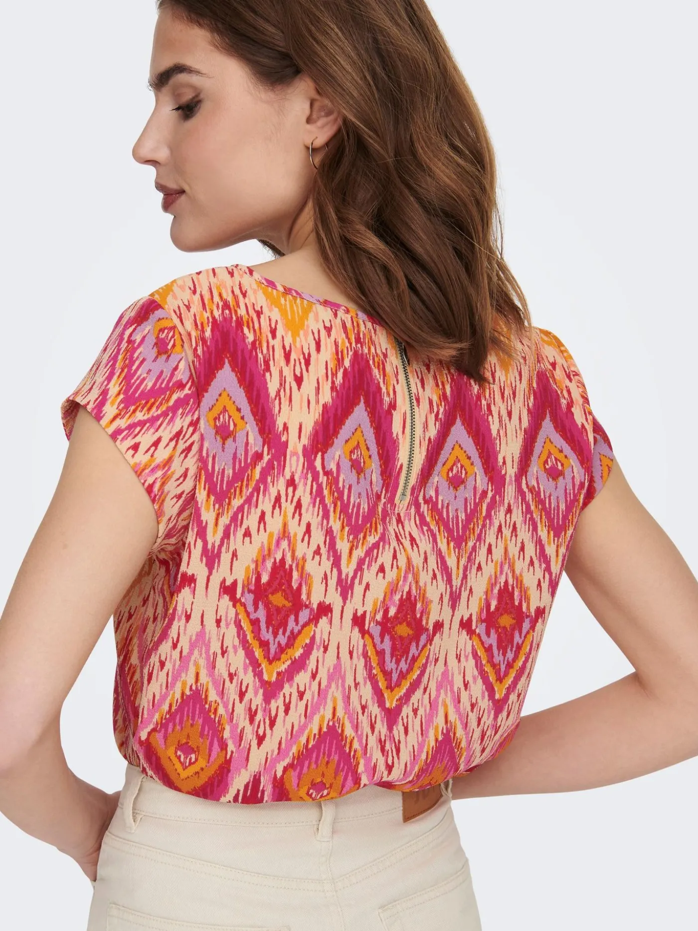 Wijdvallende roze top van Only met een ronde halslijn en korte mouwtjes. De top is voorzien van een all over print en heeft op de rug een ritssluiting.