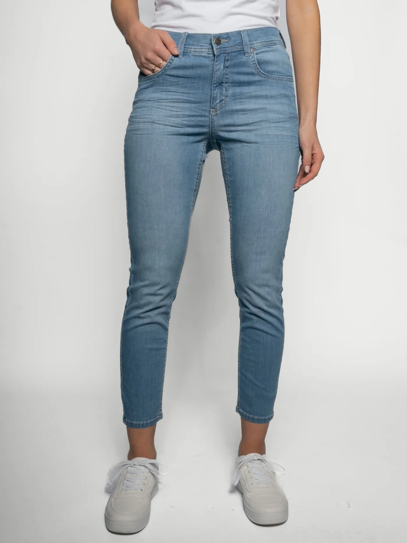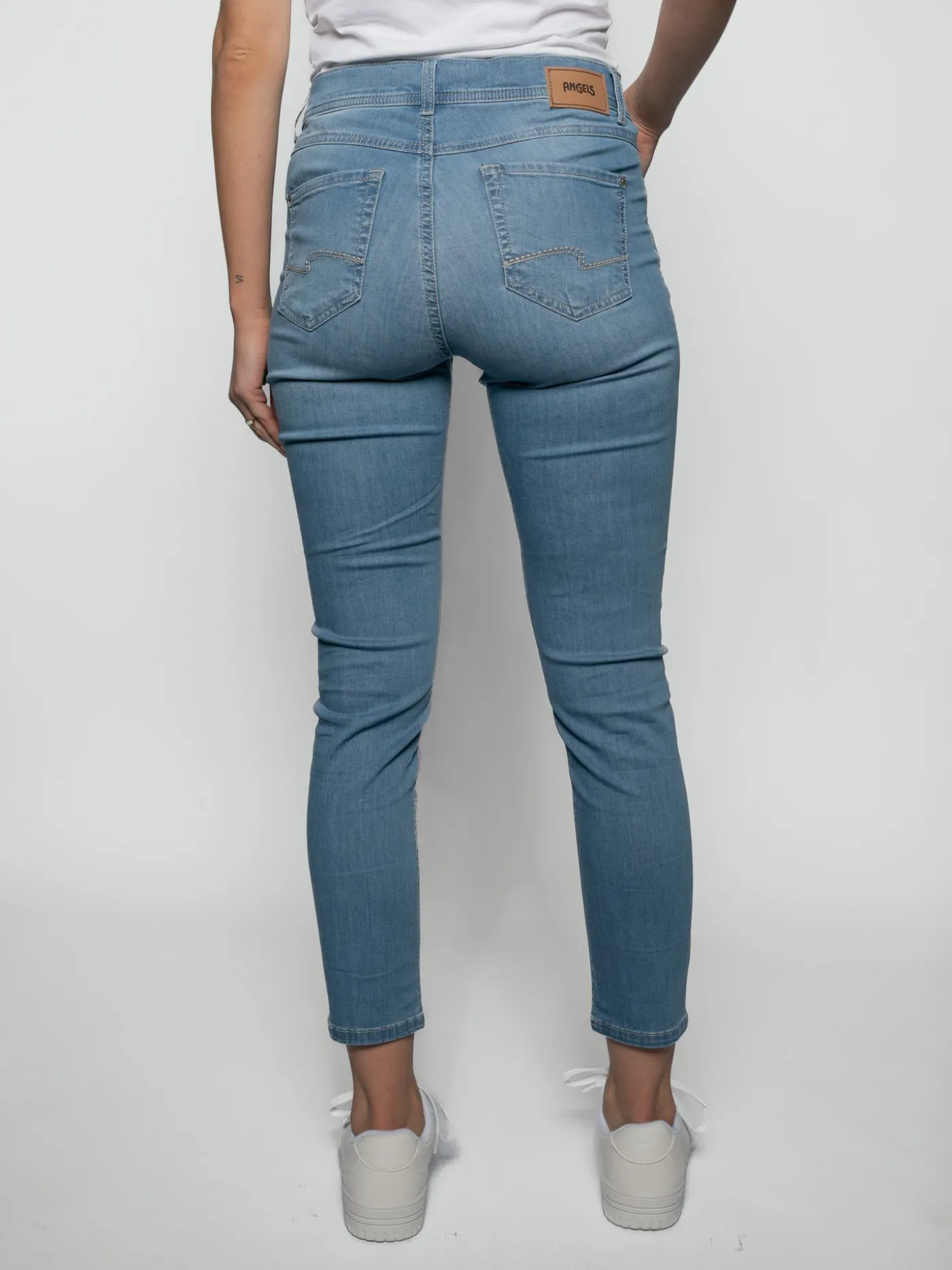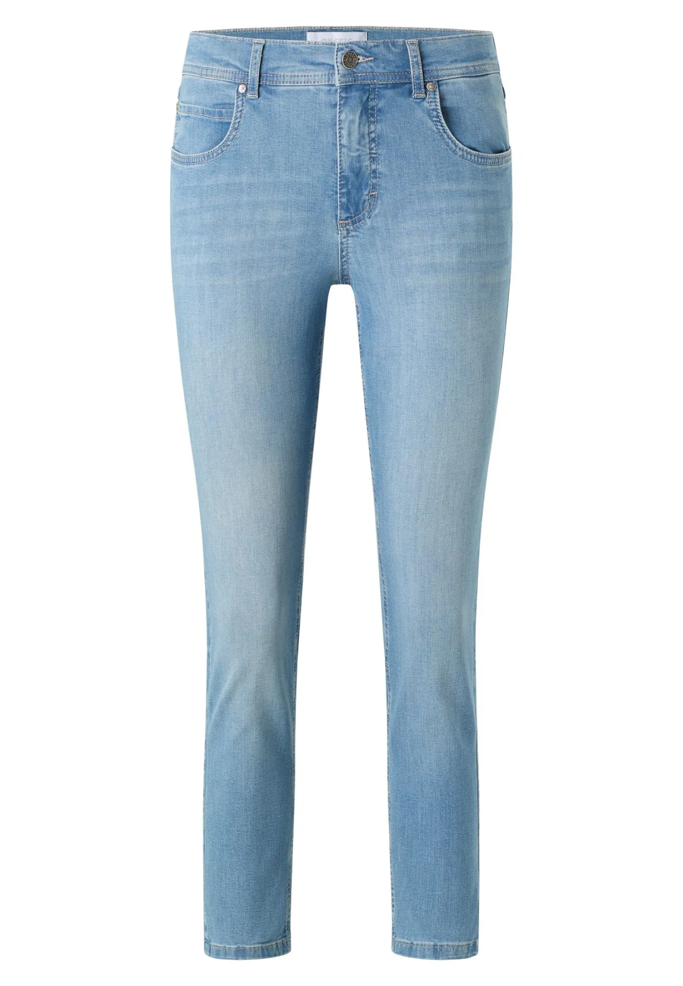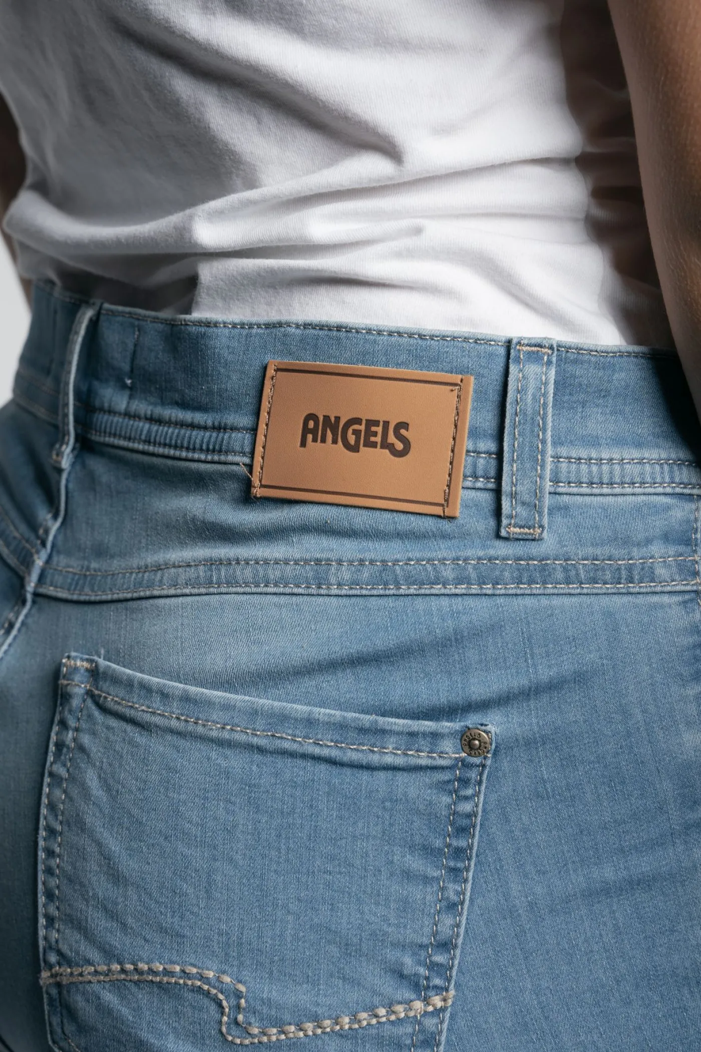Deze lichtblauwe jeans van Angels heeft een rits, één knoop en twee zakken aan de voor -en achterzijde van de jeans. Deze jeans is leuk te combineren met sneaker en een leren jasje voor een casual fit.