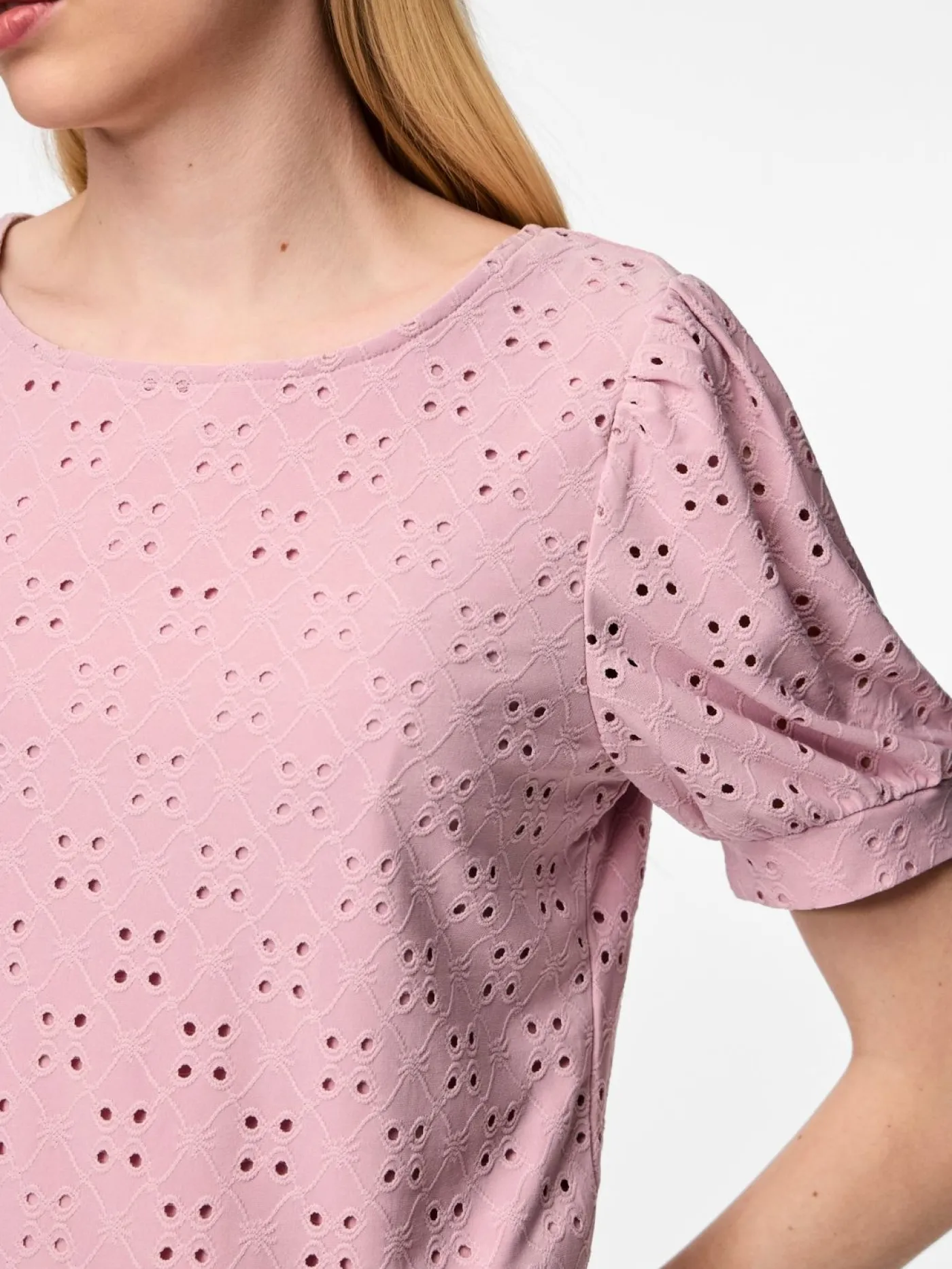 Deze rozeembroiderytop is van het merk Pieces. De top heeft korte mouwen en een ronde hals, je kan combineren met een paar jeans of een pantalon.