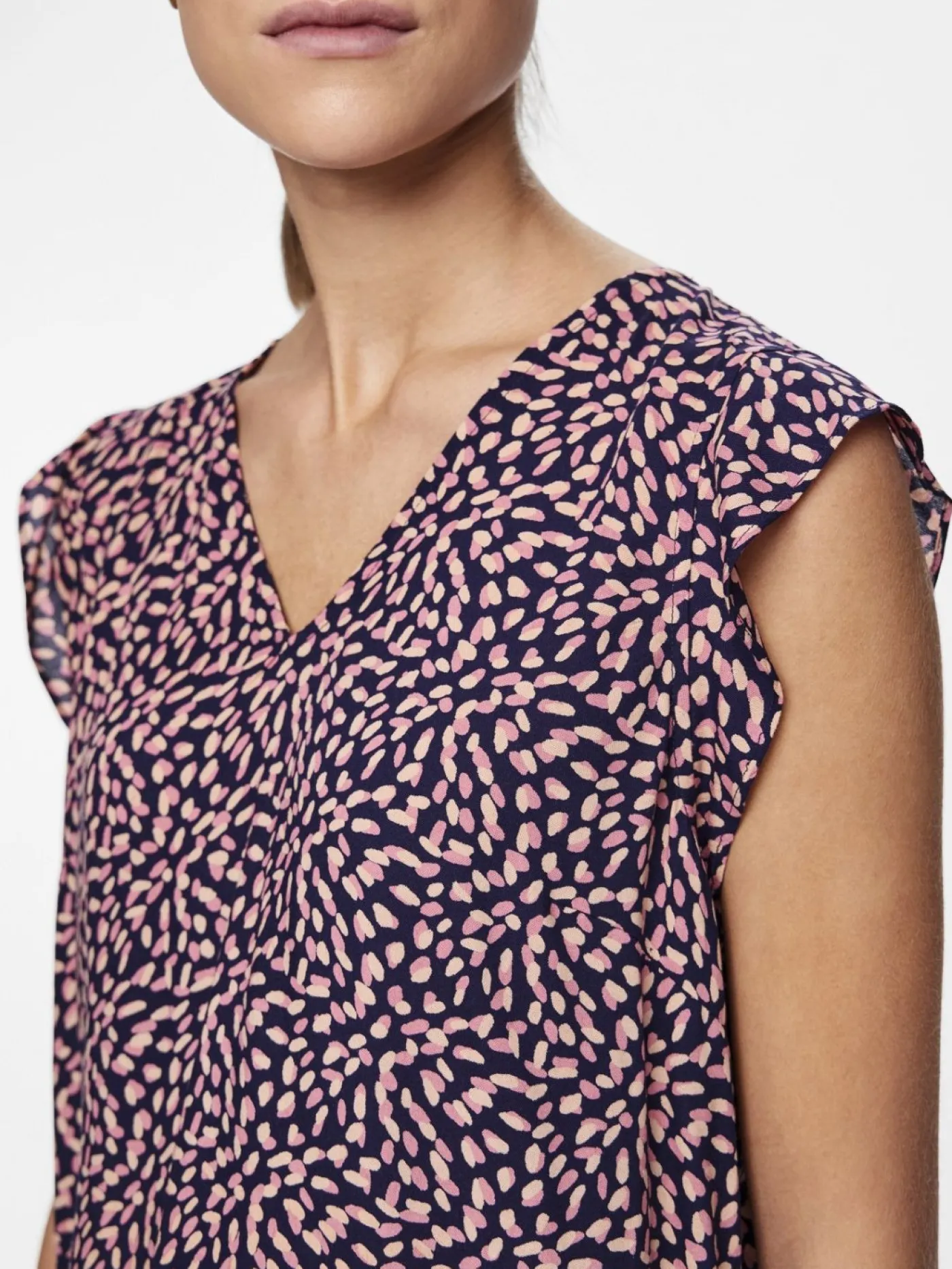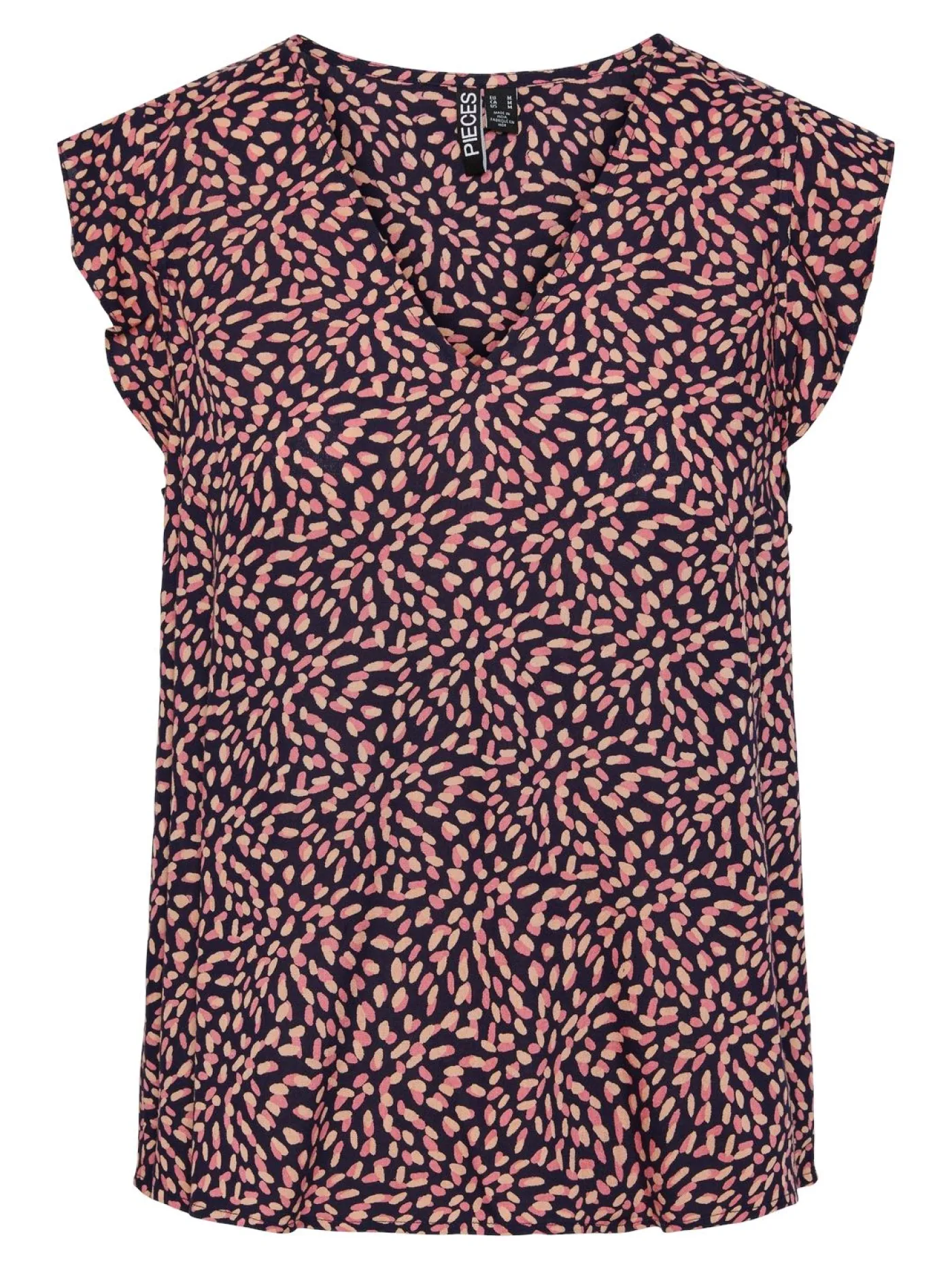 Regular top met diepe v-hals van het merk Pieces. De top is mouwloos en heeft ruffles bij de schouder. De all-over print maakt het item uniek. Combineer de top met een witte broek waardoor de print er goed uitspringt. Op deze manier steel je de show!