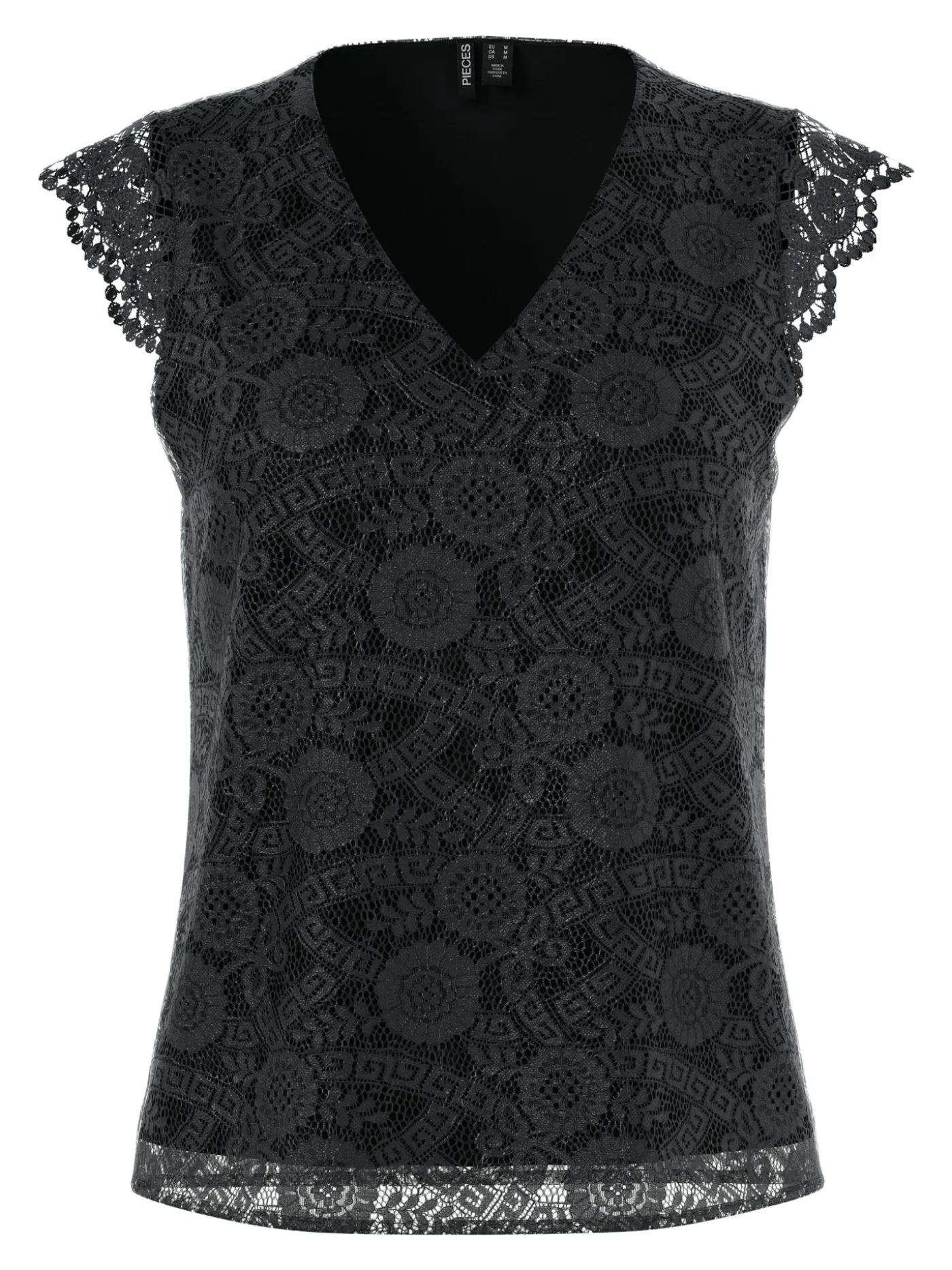 Deze losvallende top van het Pieces is een zwarte kleur. Dit item heeft een V-hals, korte mouwen en een kanten stof. Dit item is in meerdere kleuren verkrijgbaar. Combineer deze top met een jeans of pantalon voor een casual look.