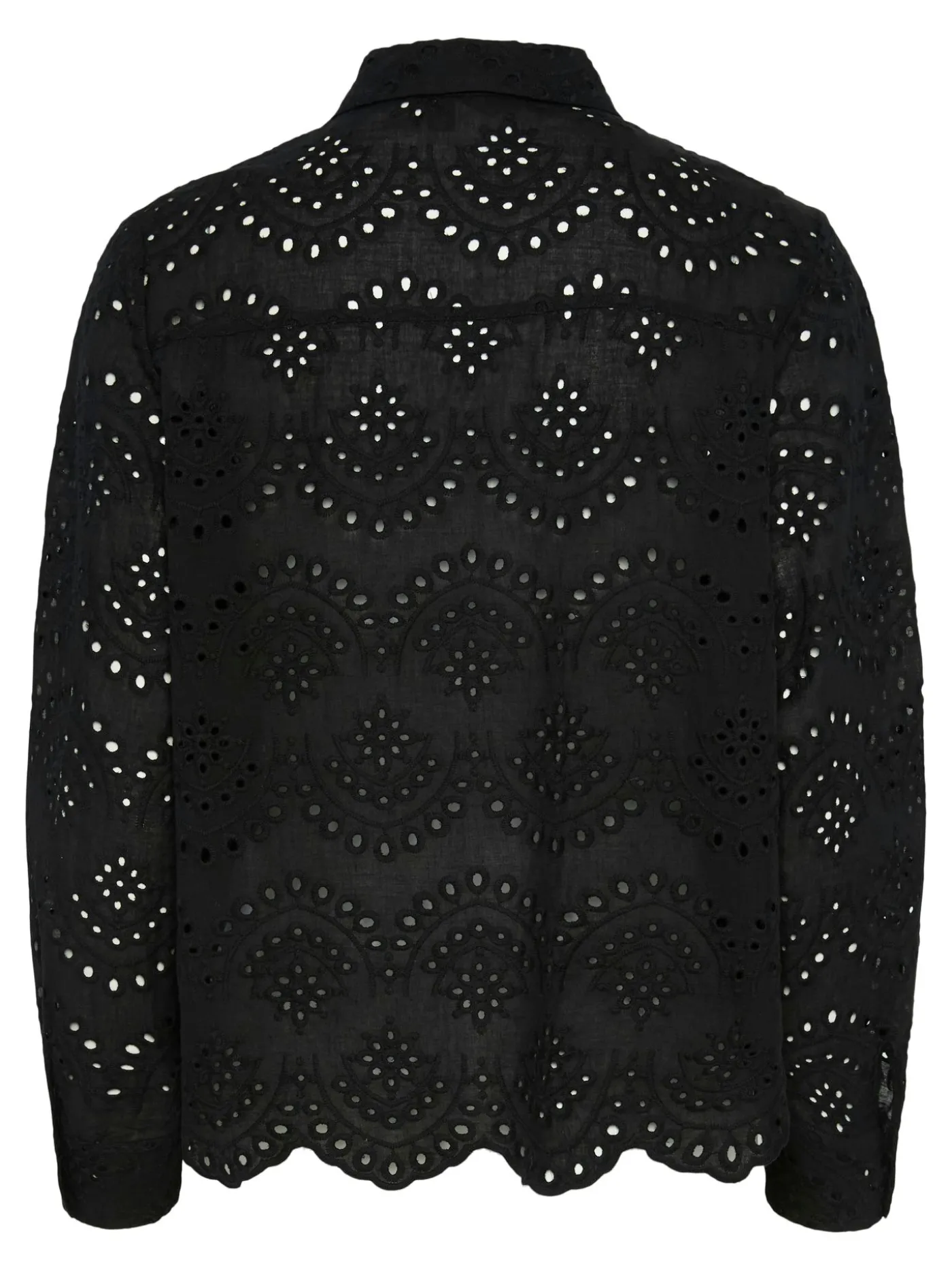 Blouse van het merk Pieces in het zwart. Dit item heeft lange mouwen, acht knopen, klassieke kraag en een doorschijnend patroon in de stof.