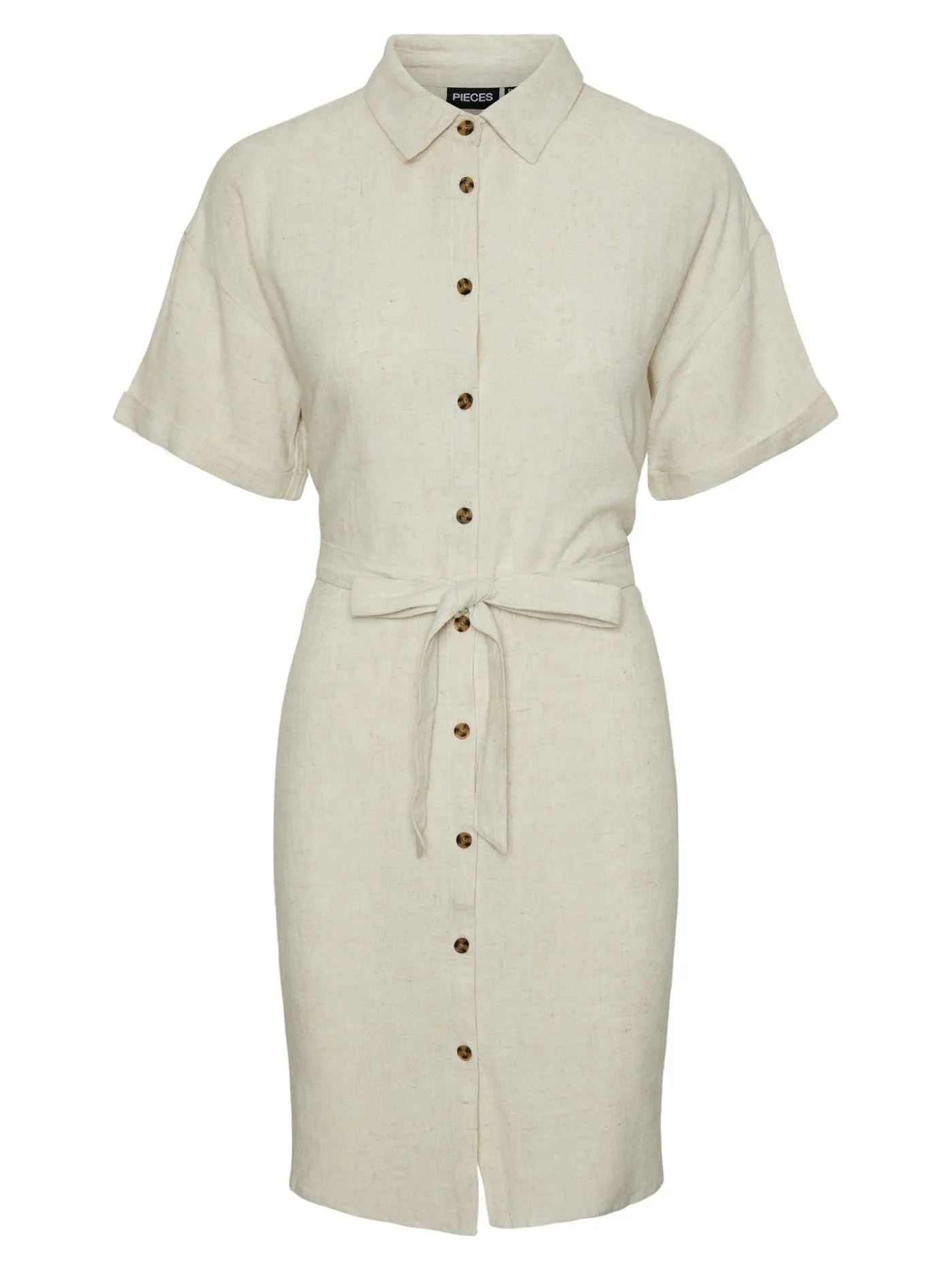 Een shirtjurk in een linnen mix van het merk Pieces. Dé ideale zomerse jurk voor aankomend seizoen. Het heeft een strikkoord in de taille en knopen aan de voorkant. Combineer de jurk met een sandaaltje of slippers en je kan zo richting die strandtent waar je al tijden naartoe wilt.