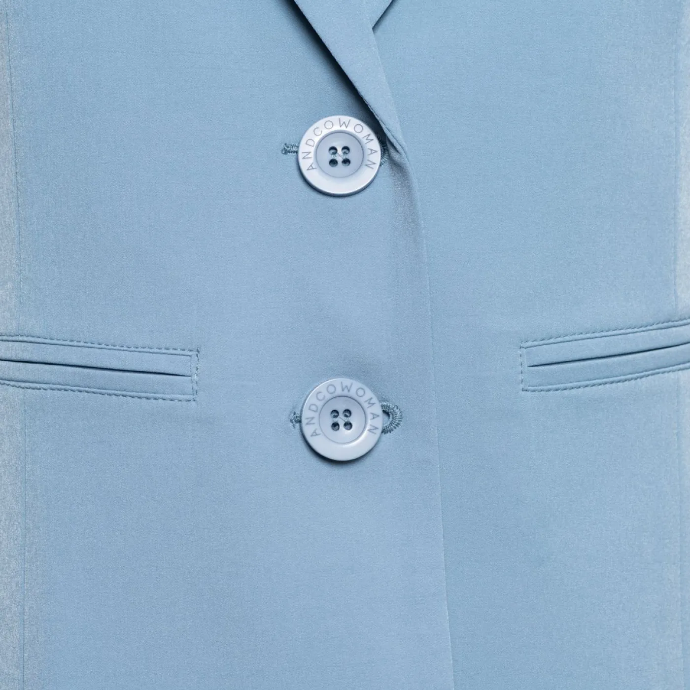 Deze lichtblauwe blazer van &CO WOMAN combineert een frisse kleur met een stijlvolle en moderne uitstraling. Het model is voorzien van een klassieke kraag en sluit met twee ton-sur-ton knopen aan de voorkant. De blazer heeft een licht getailleerde pasvorm die mooi aansluit op het lichaam en zorgt voor een elegante look. De fijne stof draagt comfortabel en voelt soepel aan. Met subtiele siernaden en nette paspelzakken is dit jasje zowel geschikt voor een zakelijke outfit als voor een meer casual combinatie.