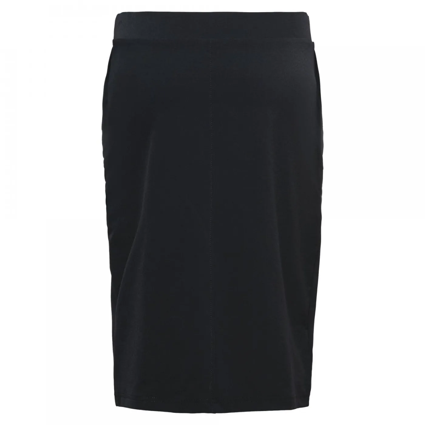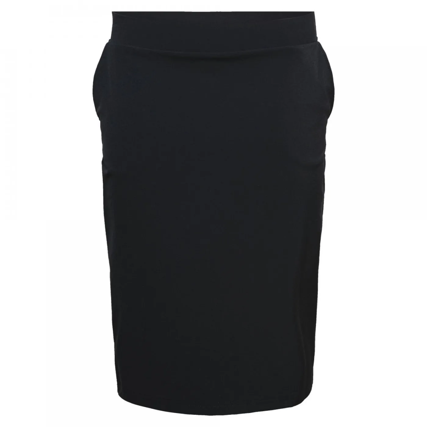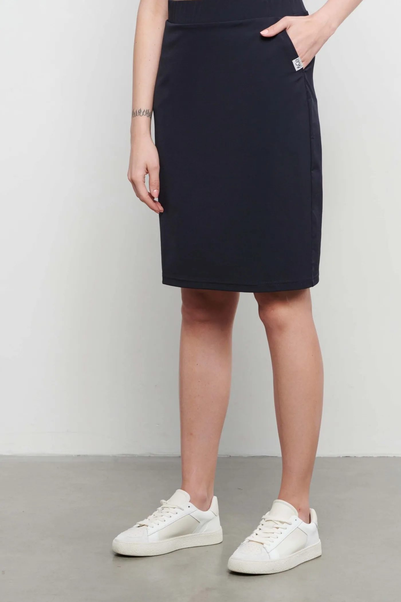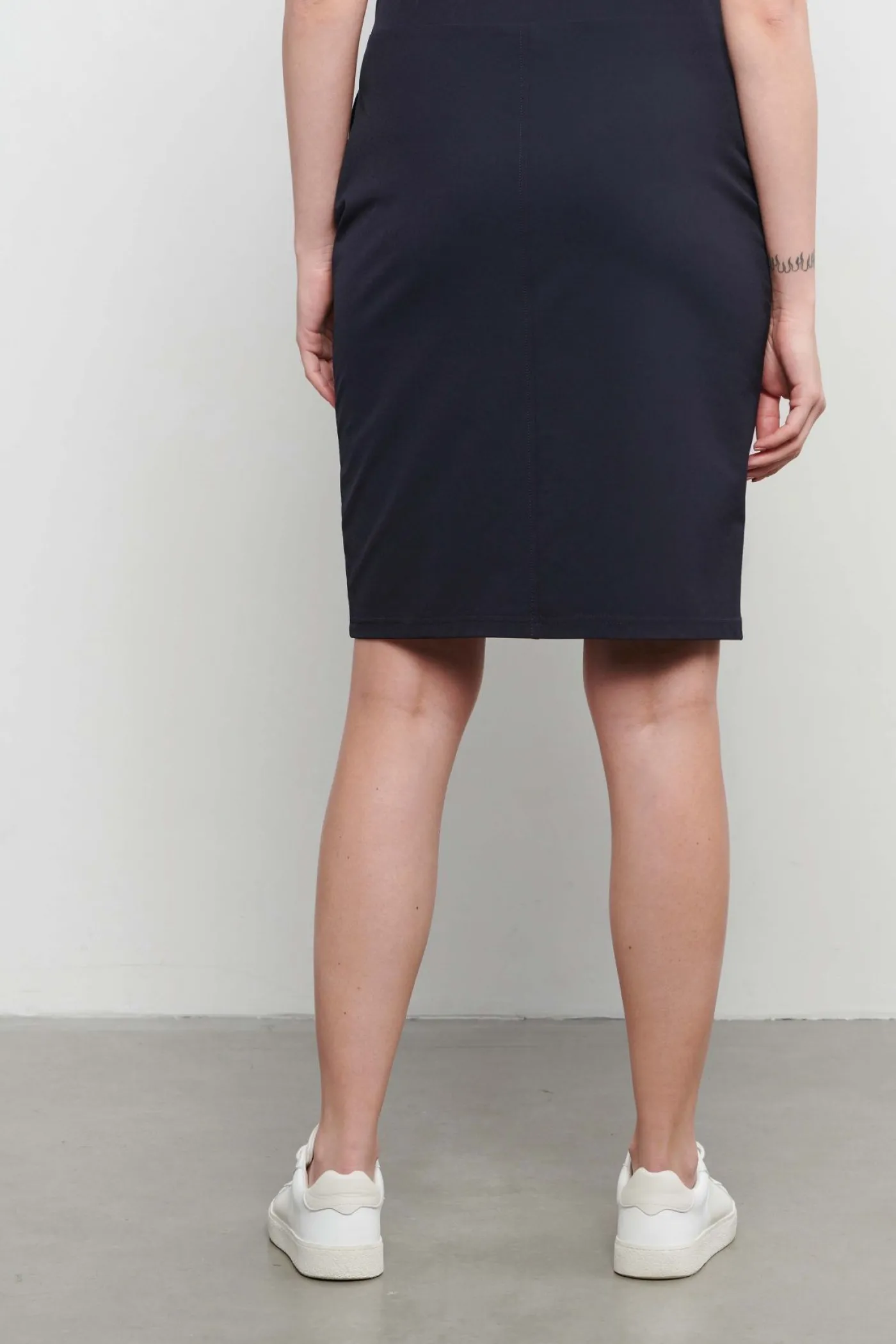 Deze navykleurige rok heeft een strakke, vrouwelijke snit die net over de knie valt. De diepe donkerblauwe tint geeft het geheel een stijlvolle en veelzijdige uitstraling. De rok is gemaakt van een soepele stof die prettig meebeweegt en comfortabel aanvoelt tijdens het dragen. De brede tailleband zorgt voor een nette afwerking en een mooie pasvorm rond het middel. Ideaal voor zowel een zakelijke look als een meer casual outfit, afhankelijk van hoe je hem combineert.