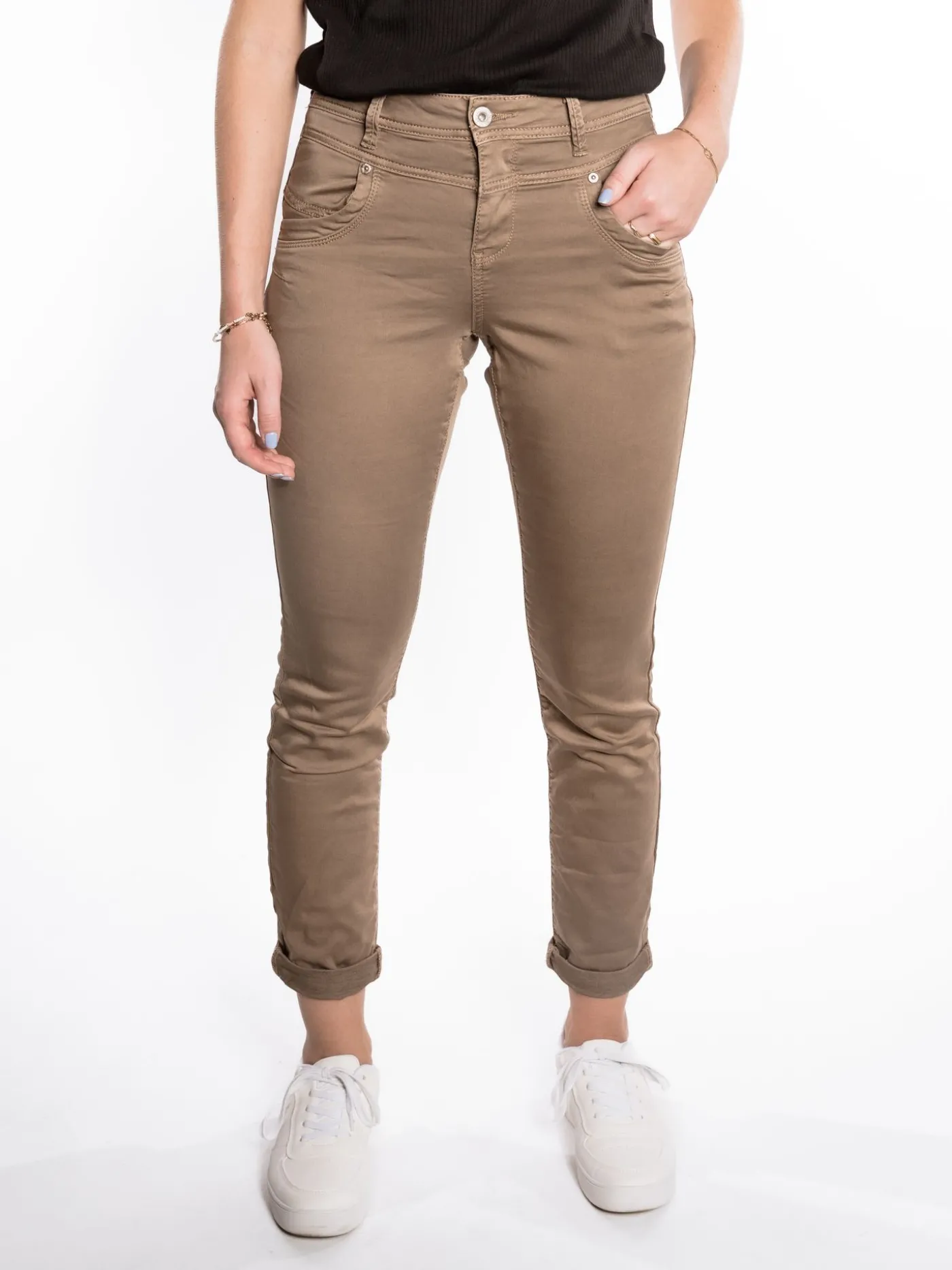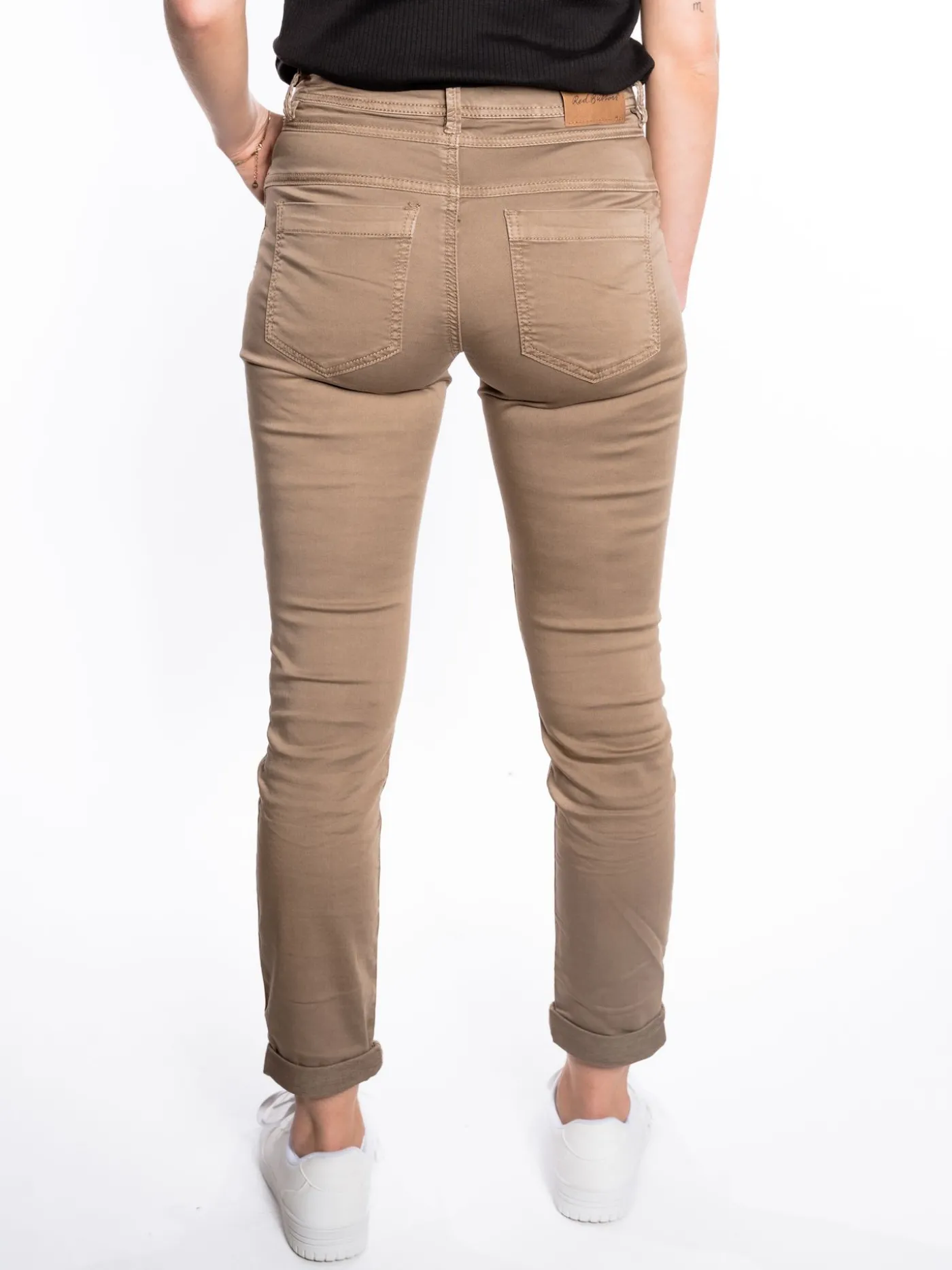 Deze broek van Red Button heeft de look van een jeans en het comfort van een jogger. Uitgevoerd in een warme bruine kleur en gemaakt van een zachte, stretchy stof die soepel meebeweegt. De relaxte pasvorm en elastische tailleband met drawstring zorgen voor optimaal draagcomfort. Afgewerkt met klassieke jeansdetails voor een casual uitstraling. Ideaal voor elke dag, van relaxte momenten thuis tot een dagje in de stad.